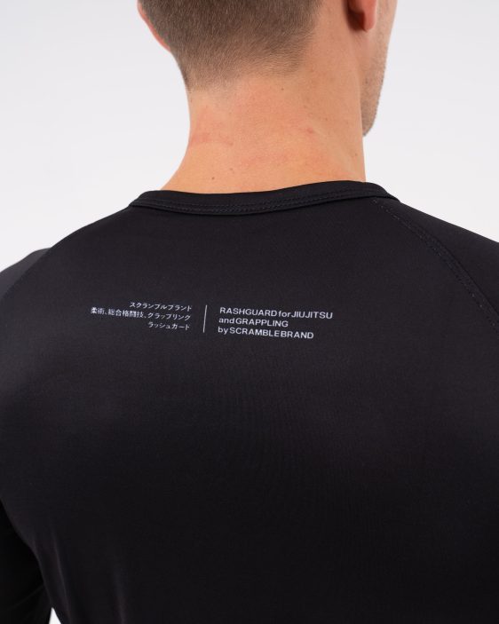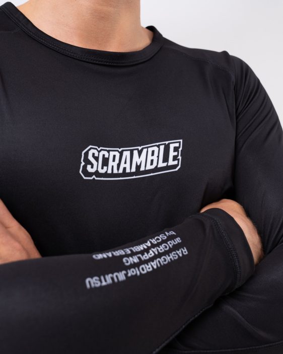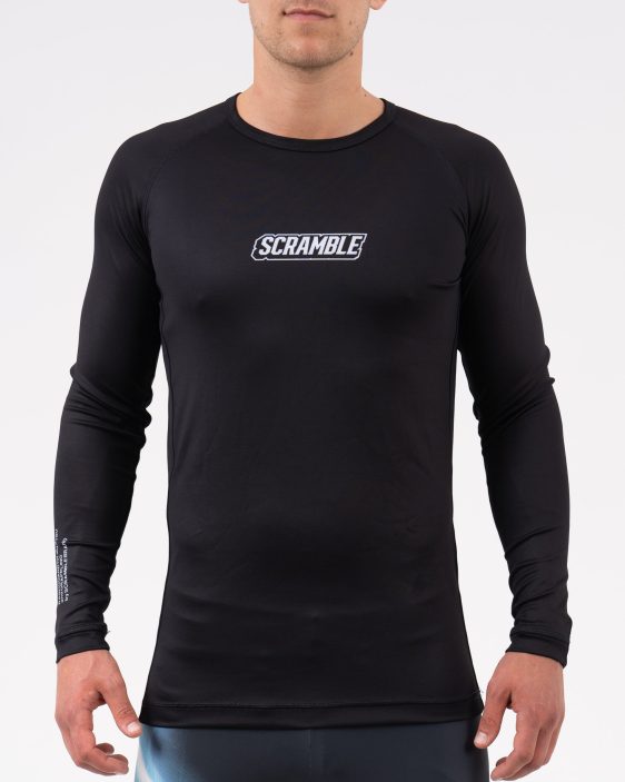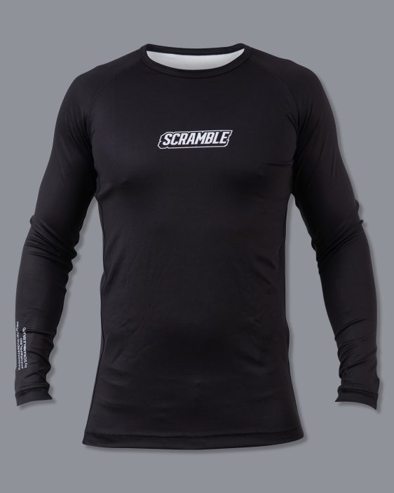 Simple is best. Back to basics with this high quality rashguard with minimalist stylings. Featuring a new Scramble 3D logo on the front and bold descriptive text at key locations. Perfect for jiujitsu.
