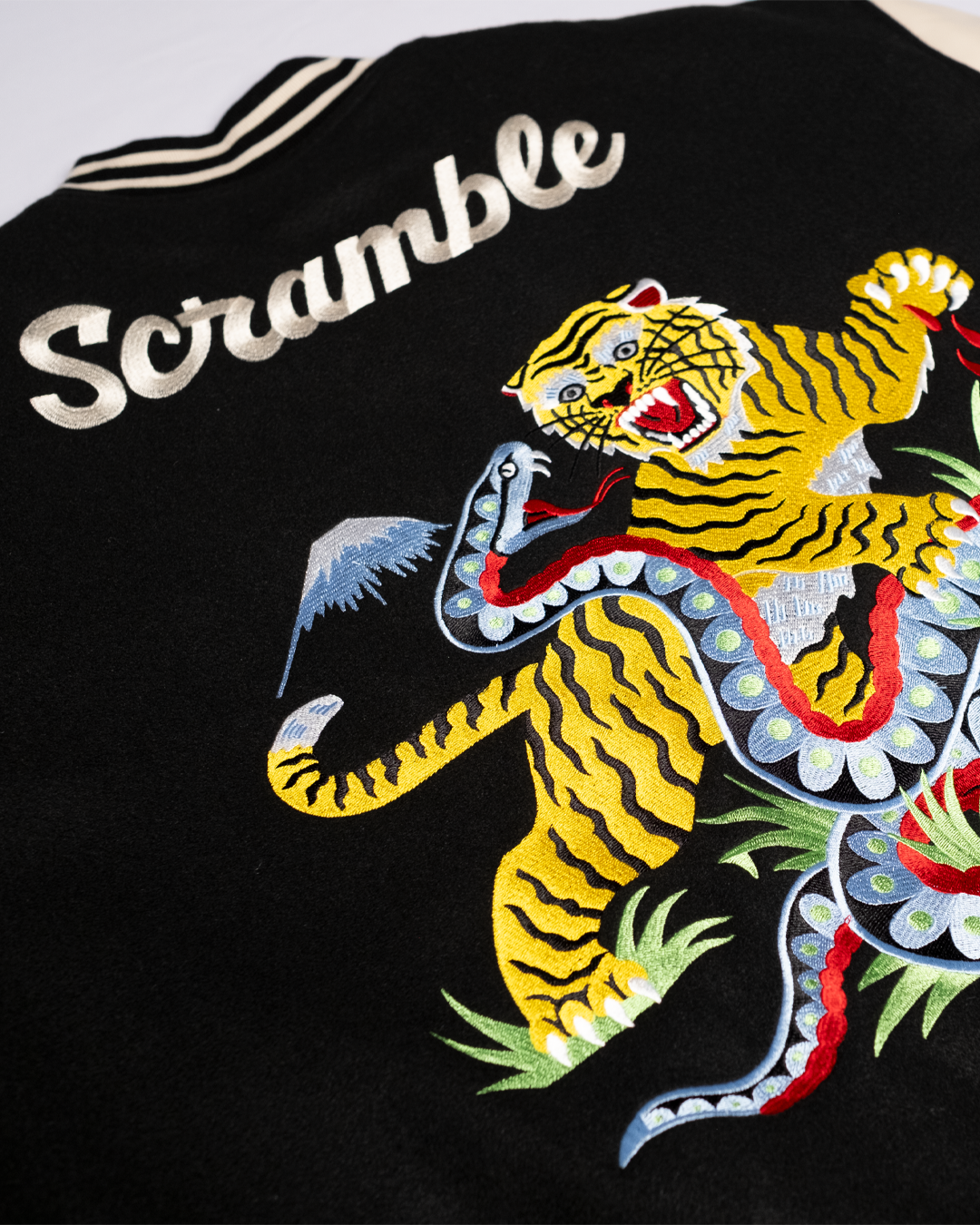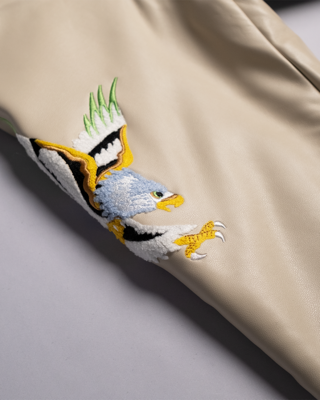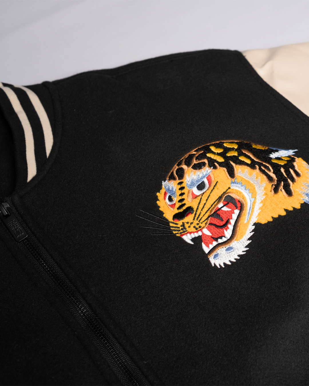 This is the crowning jewel in our Winter 2025 collection, a full-spec Sukajan jacket. The body is felt and the arms are premium synthetic leather with a padded, quilted inner. The jacket features bold offset with creamy off-white details, a number of high quality embroideries and chenille patches, and a relaxed, oversized fit so that you can fit your winter hoody underneath.