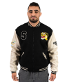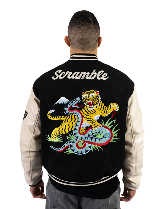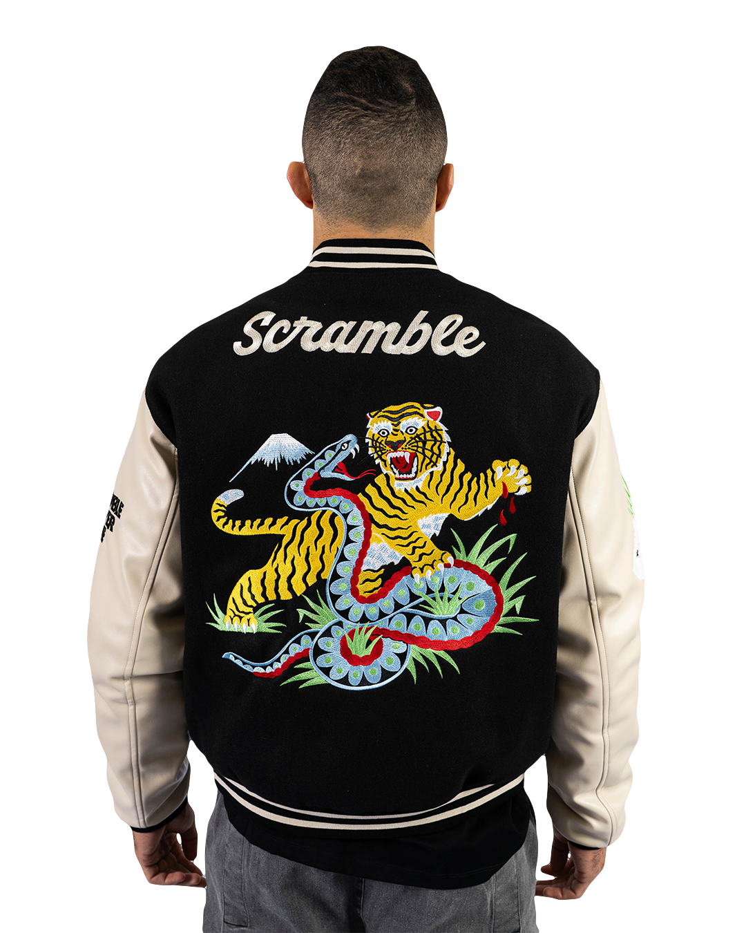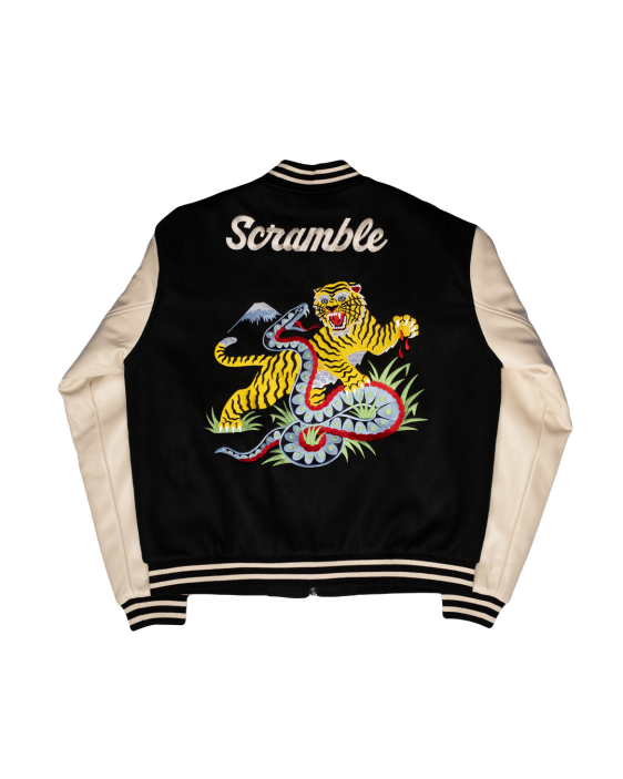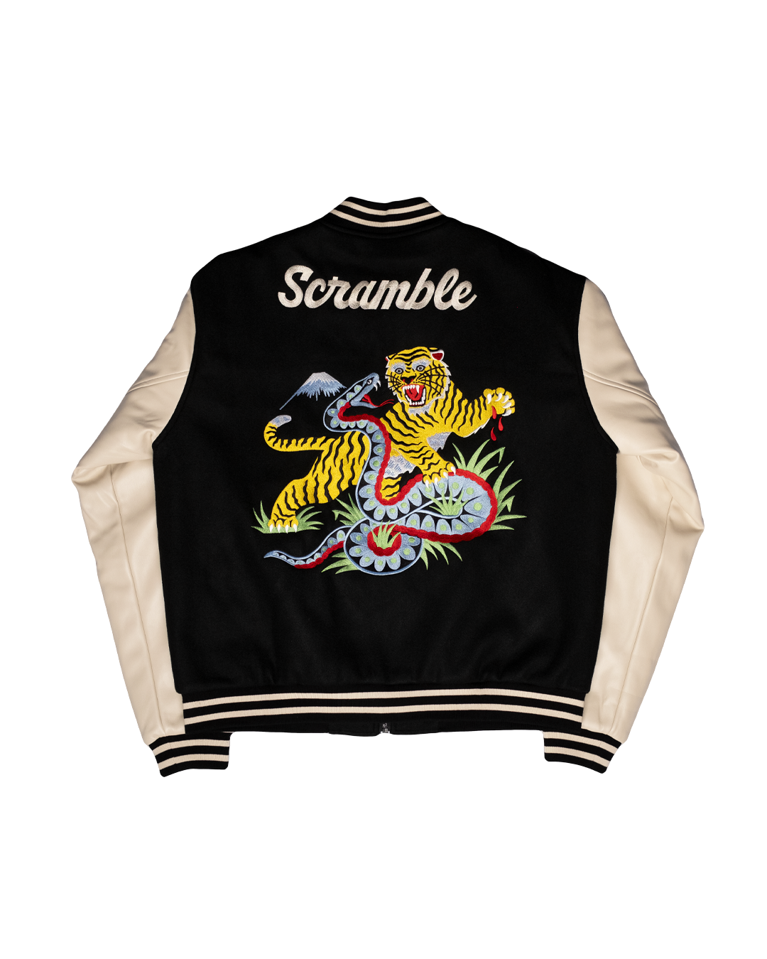 This is the crowning jewel in our Winter 2025 collection, a full-spec Sukajan jacket. The body is felt and the arms are premium synthetic leather with a padded, quilted inner. The jacket features bold offset with creamy off-white details, a number of high quality embroideries and chenille patches, and a relaxed, oversized fit so that you can fit your winter hoody underneath.