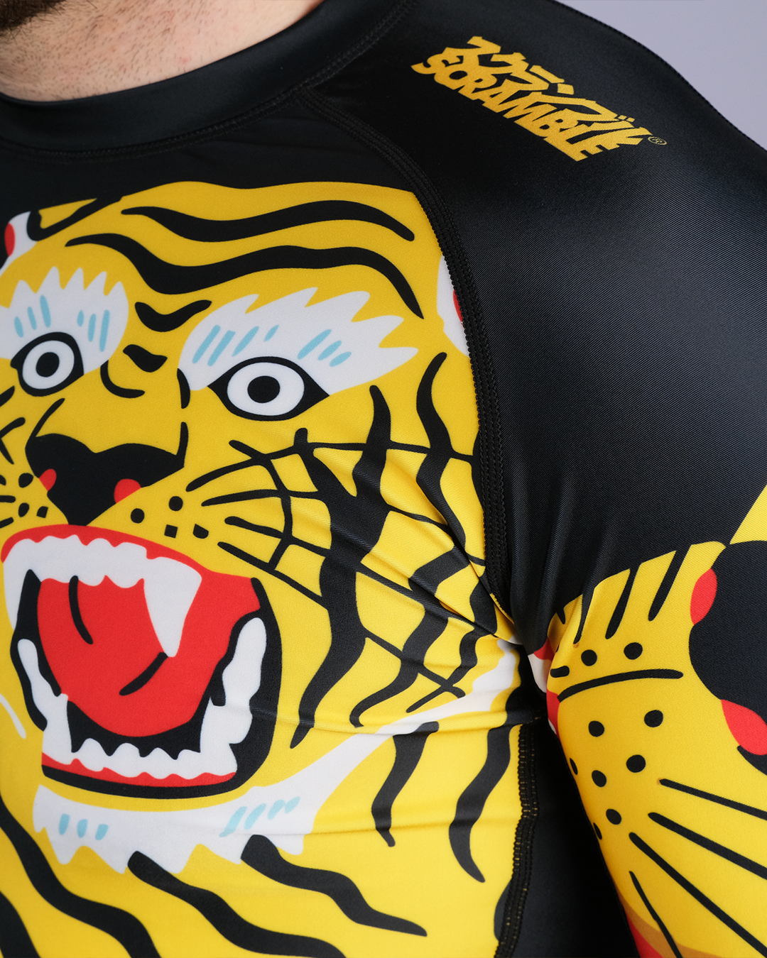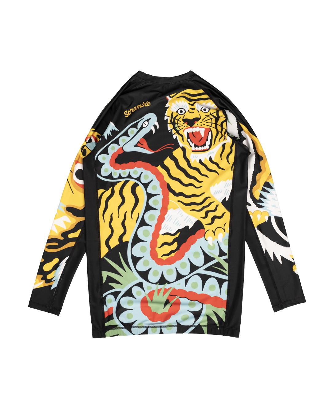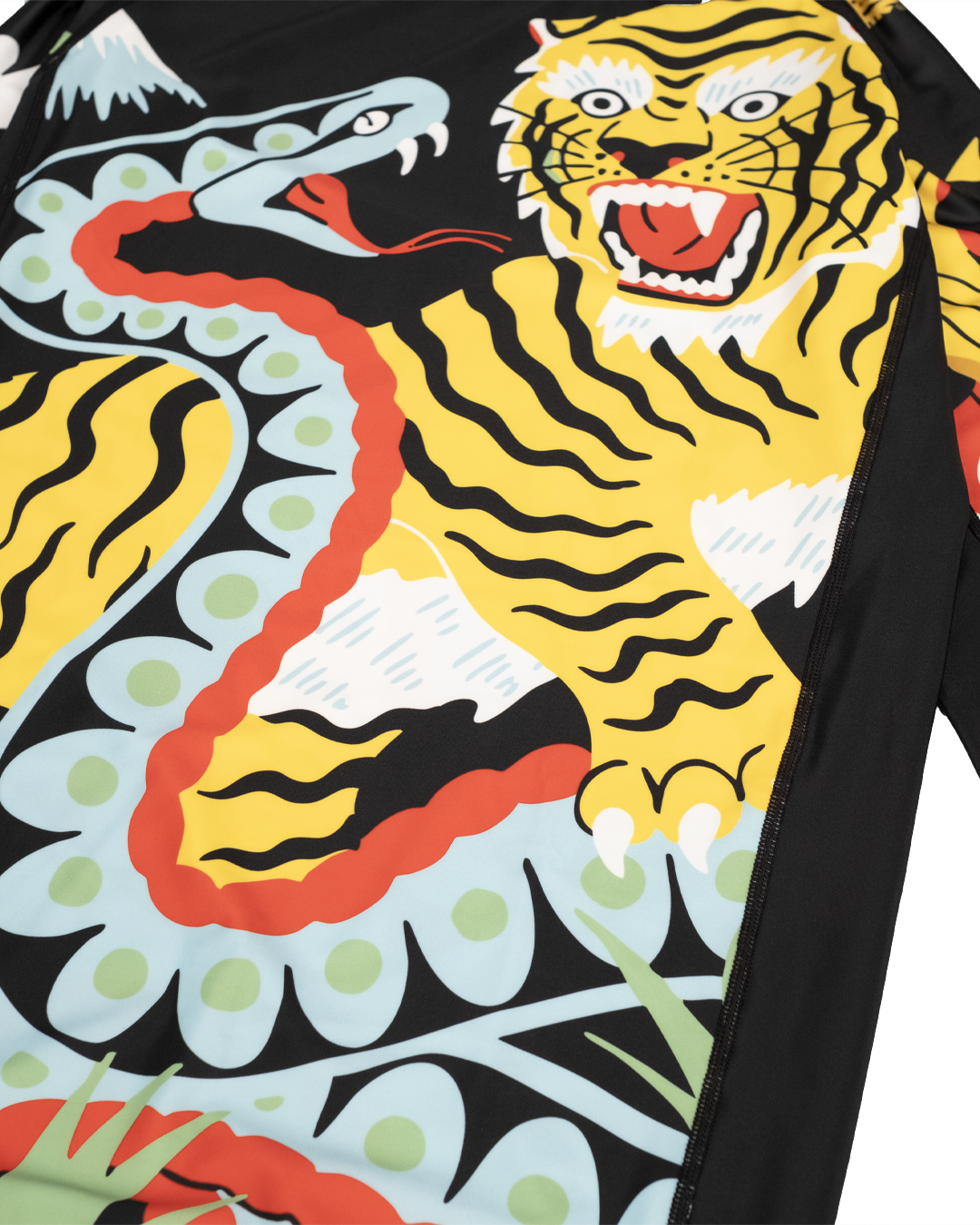 Dieses leuchtende, kühne und farbenfrohe Nogi-Grappling-Set wurde von dem talentierten Kieran Hoohar, einem Tätowierer und Jiujitsu-Enthusiasten aus London, entworfen. Die Illustrationen bestehen aus beliebten Tattoo-Illustrationen von Tigern und Schlangen, Jaguaren und Adlern, die alle in Kierans unverkennbarem Stil gestaltet sind. Die Rashguards gibt es in einer lang- und einer kurzärmeligen Version (die langärmelige Version ist zeitlich exklusiv für die USA) und wir haben auch Grappling Shorts und lange Spats (die Grappling Spats sind zeitlich exklusiv für die USA).