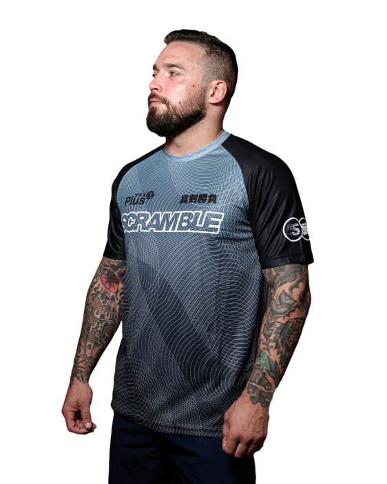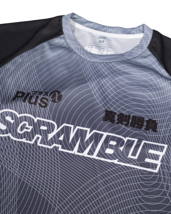 This lightly textured “dry fit” style training top is looser fitting than a rashguard, giving you freedom of movement and also potentially hiding a muffin top which is great. The top is also longer in the body, perfect for covering up or tucking into shorts (or gi pants.) The top is styled like a football shirt, and includes the logo for Plus Alpha, which is a secret project we are working on.