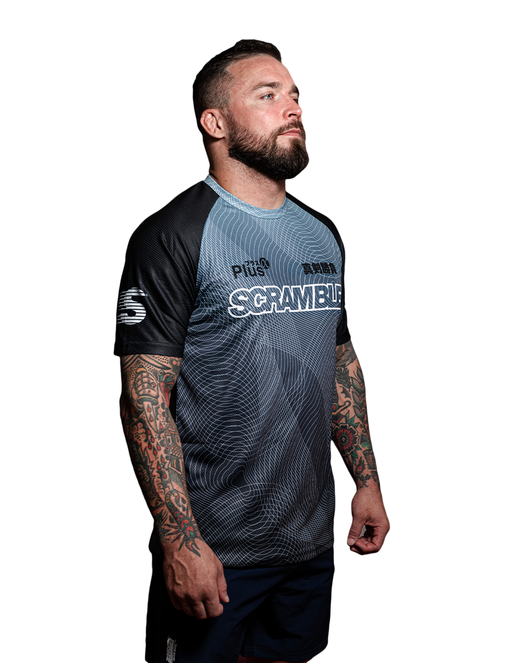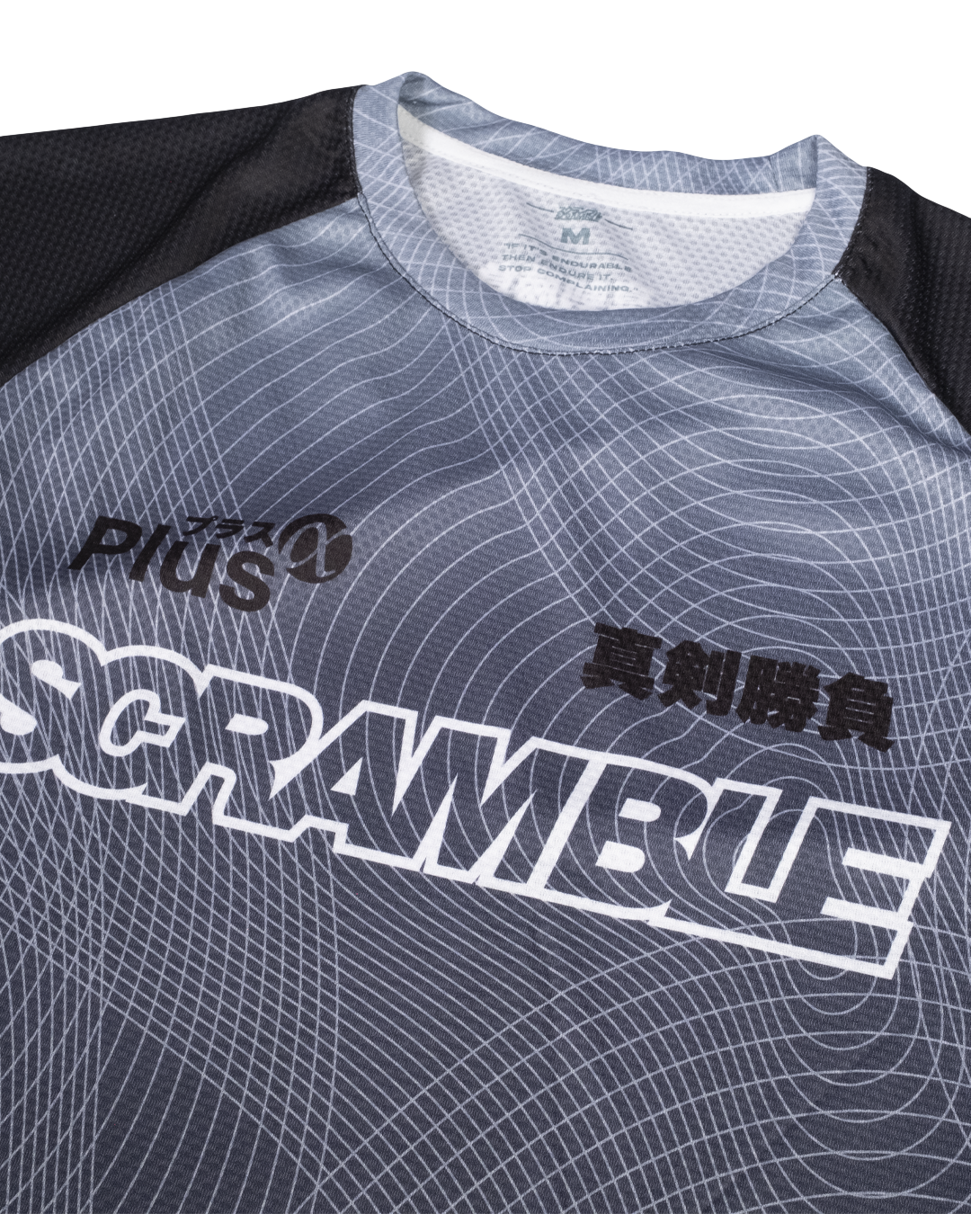 This lightly textured “dry fit” style training top is looser fitting than a rashguard, giving you freedom of movement and also potentially hiding a muffin top which is great. The top is also longer in the body, perfect for covering up or tucking into shorts (or gi pants.) The top is styled like a football shirt, and includes the logo for Plus Alpha, which is a secret project we are working on.