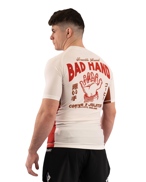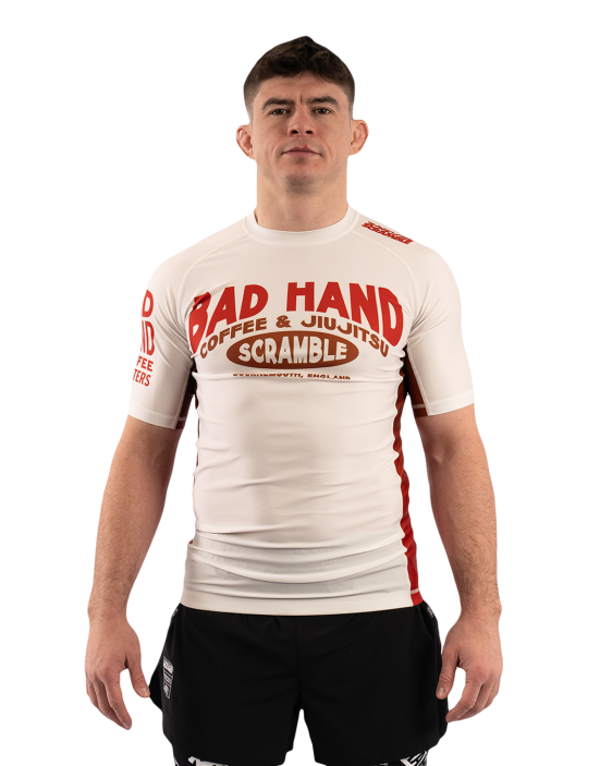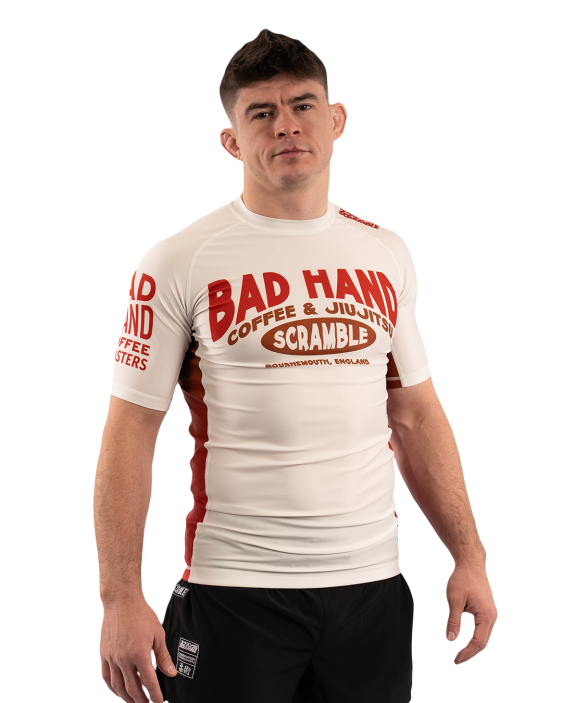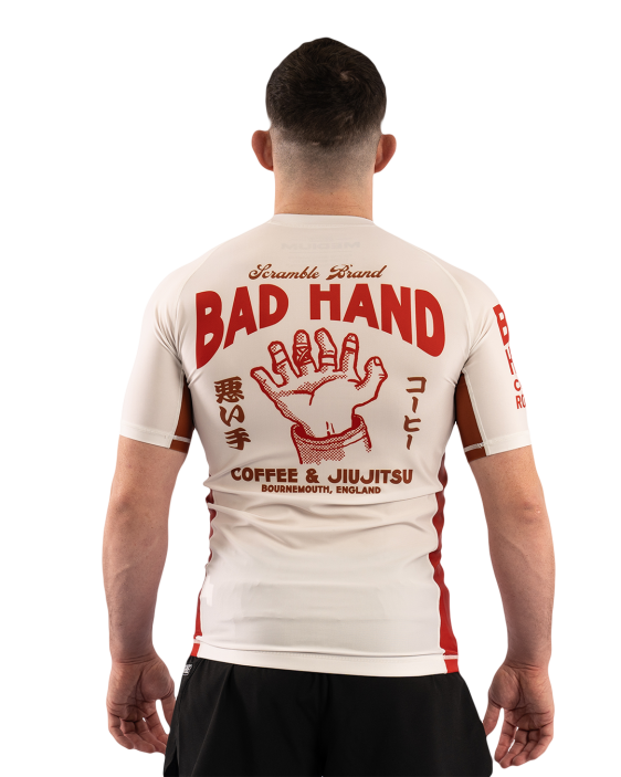 La colaboración entre Bad Hand y Scramble celebra dos de nuestras cosas favoritas en el mundo: el café y el jiujitsu. Bad Hand es una tostadora de café ubicada cerca de la sede de Scramble, y miembros de ambos equipos entrenan jiujitsu juntos en el Ippon Gym. ¡Una combinación hecha en el paraíso del café! Esta colección celebra ambas marcas e incluye una camiseta y un rashguard con ilustraciones dibujadas a mano, además de un lote especial de algunos de sus mejores granos. Mientras haya existencias, regalaremos un paquete de muestra de los granos con cada camiseta o rashguard a precio completo.
