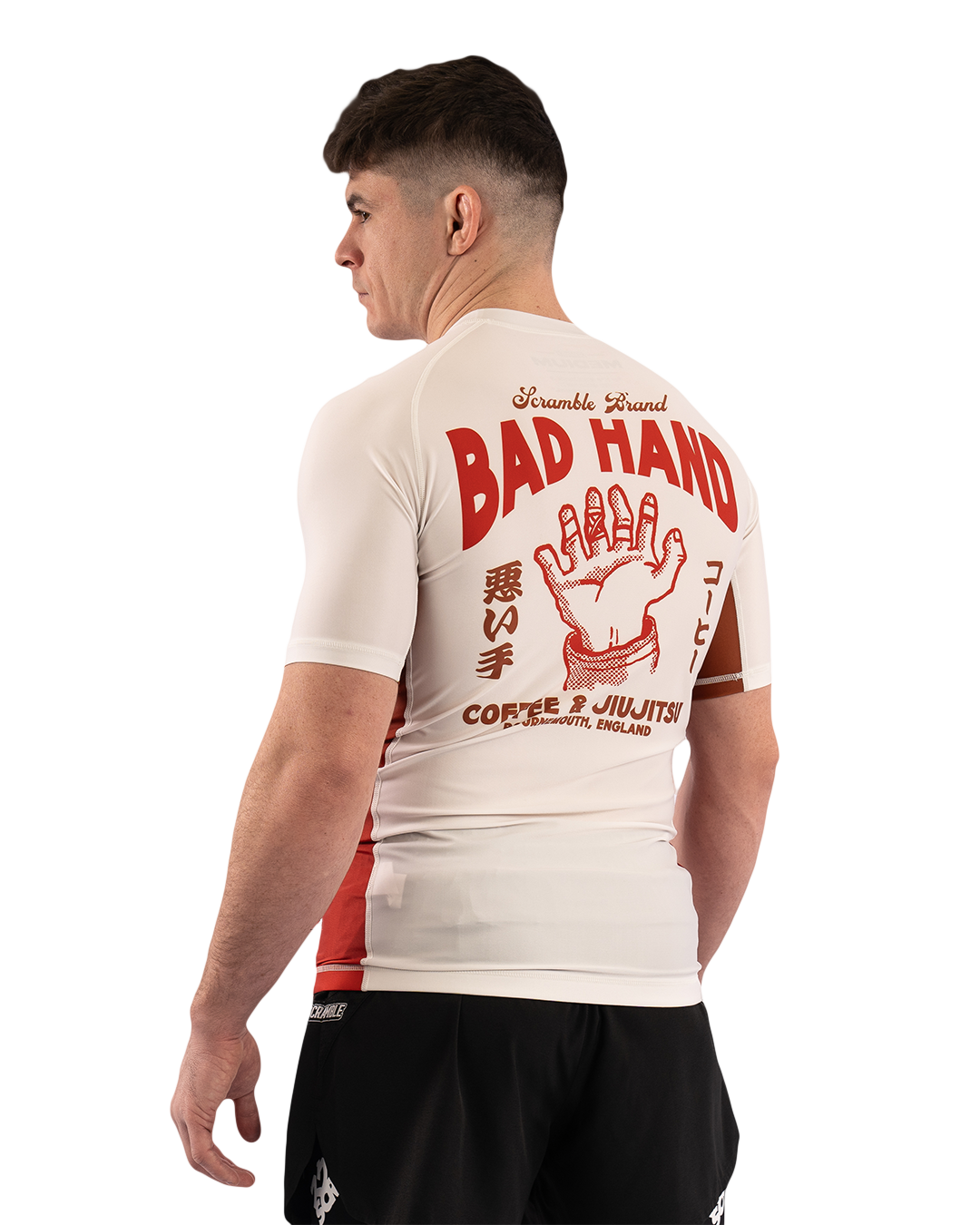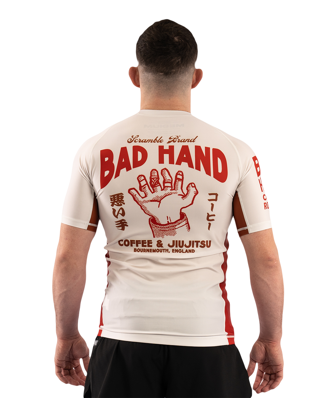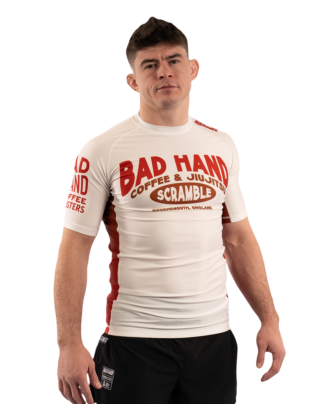 La colaboración entre Bad Hand y Scramble celebra dos de nuestras cosas favoritas en el mundo: el café y el jiujitsu. Bad Hand es una tostadora de café ubicada cerca de la sede de Scramble, y miembros de ambos equipos entrenan jiujitsu juntos en el Ippon Gym. ¡Una combinación hecha en el paraíso del café! Esta colección celebra ambas marcas e incluye una camiseta y un rashguard con ilustraciones dibujadas a mano, además de un lote especial de algunos de sus mejores granos. Mientras haya existencias, regalaremos un paquete de muestra de los granos con cada camiseta o rashguard a precio completo.