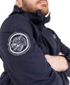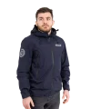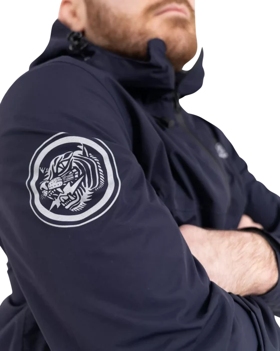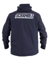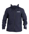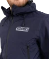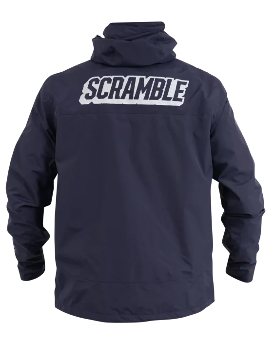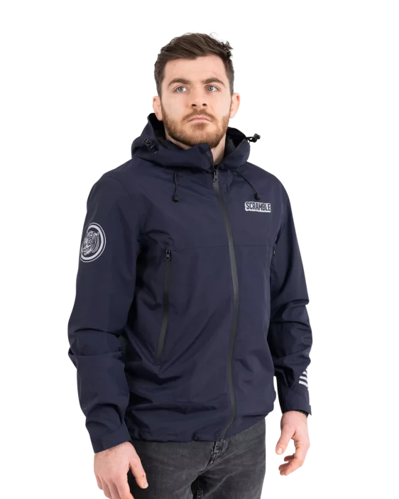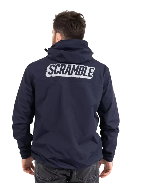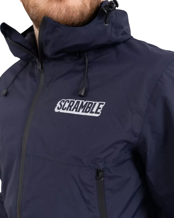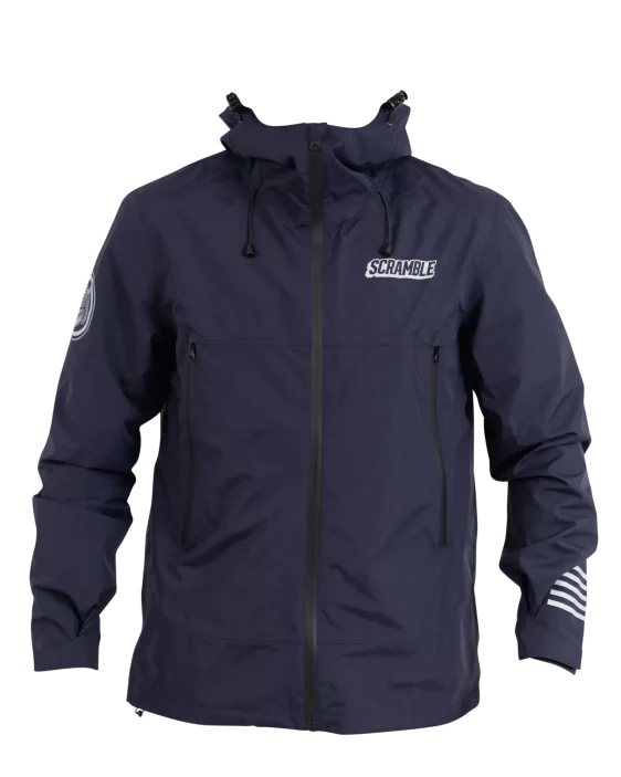 Superior construction, fit and feel. This lightweight rain jacket has an excellent water-resistant nylon construction and coating, including waterproof zippers, and a lightweight mesh liner. An elastic waistband allows you to cinch the jacket if necessary, as do velcro cuffs. The jacket is navy blue and finished with reflective print Scramble logo hits for nighttime adventures.