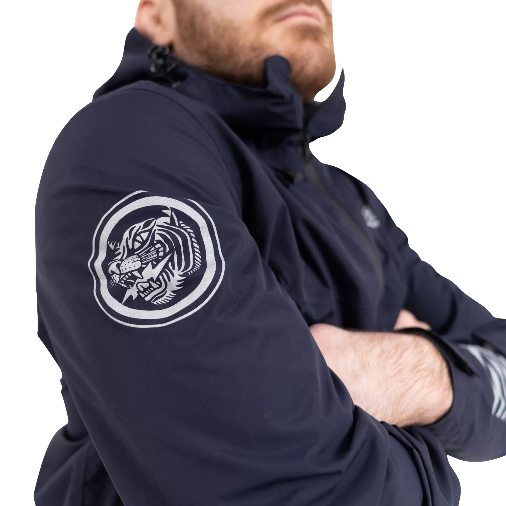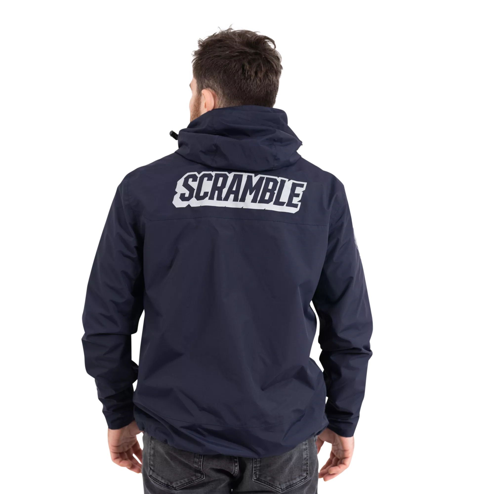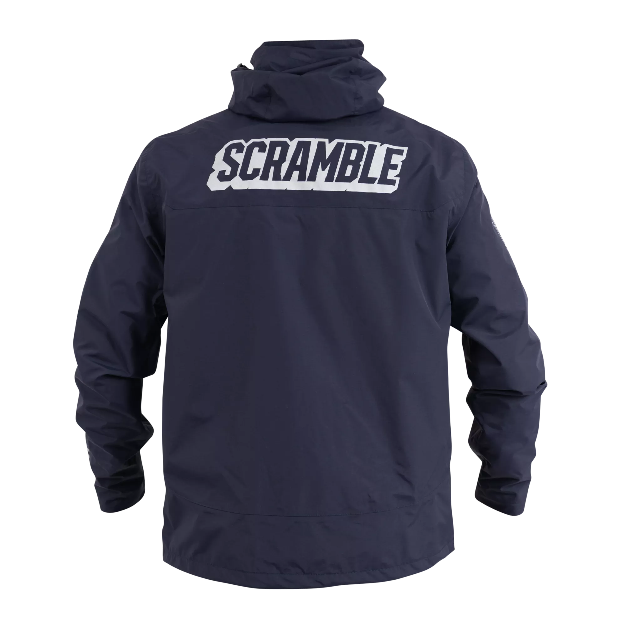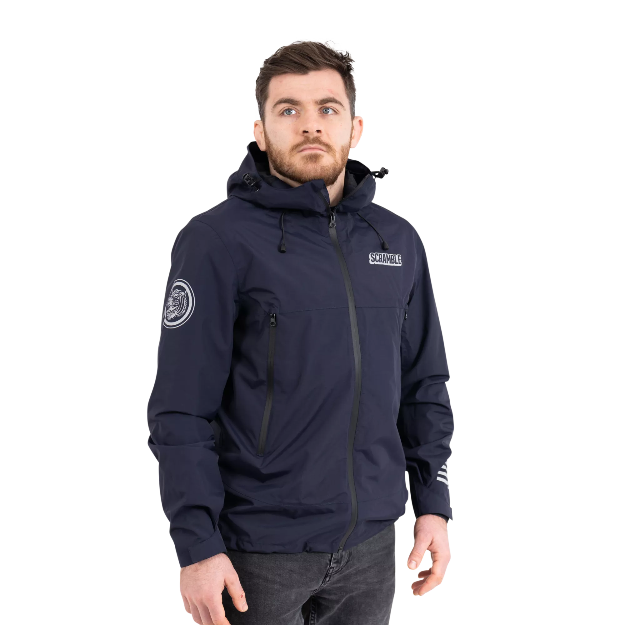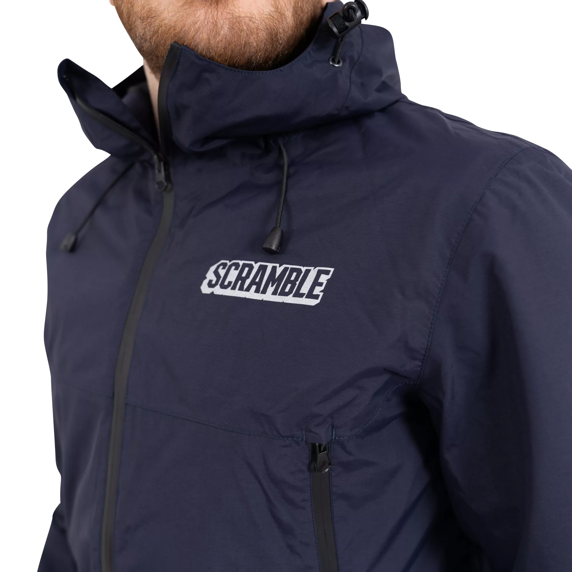 Superior construction, fit and feel. This lightweight rain jacket has an excellent water-resistant nylon construction and coating, including waterproof zippers, and a lightweight mesh liner. An elastic waistband allows you to cinch the jacket if necessary, as do velcro cuffs. The jacket is navy blue and finished with reflective print Scramble logo hits for nighttime adventures.