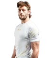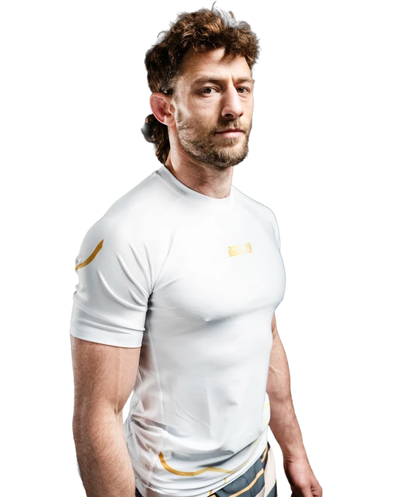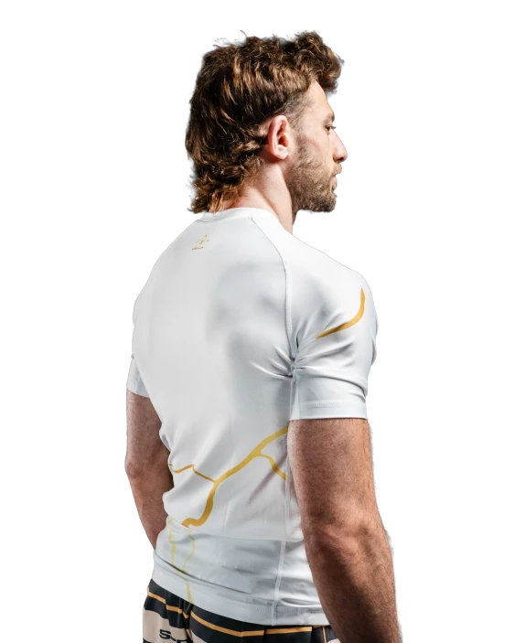 Kintsugi Rashguard in white and gold. During our social media campaign about this product, a lot of our fans really resonated with this concept and we are very excited for you all to be wearing it.