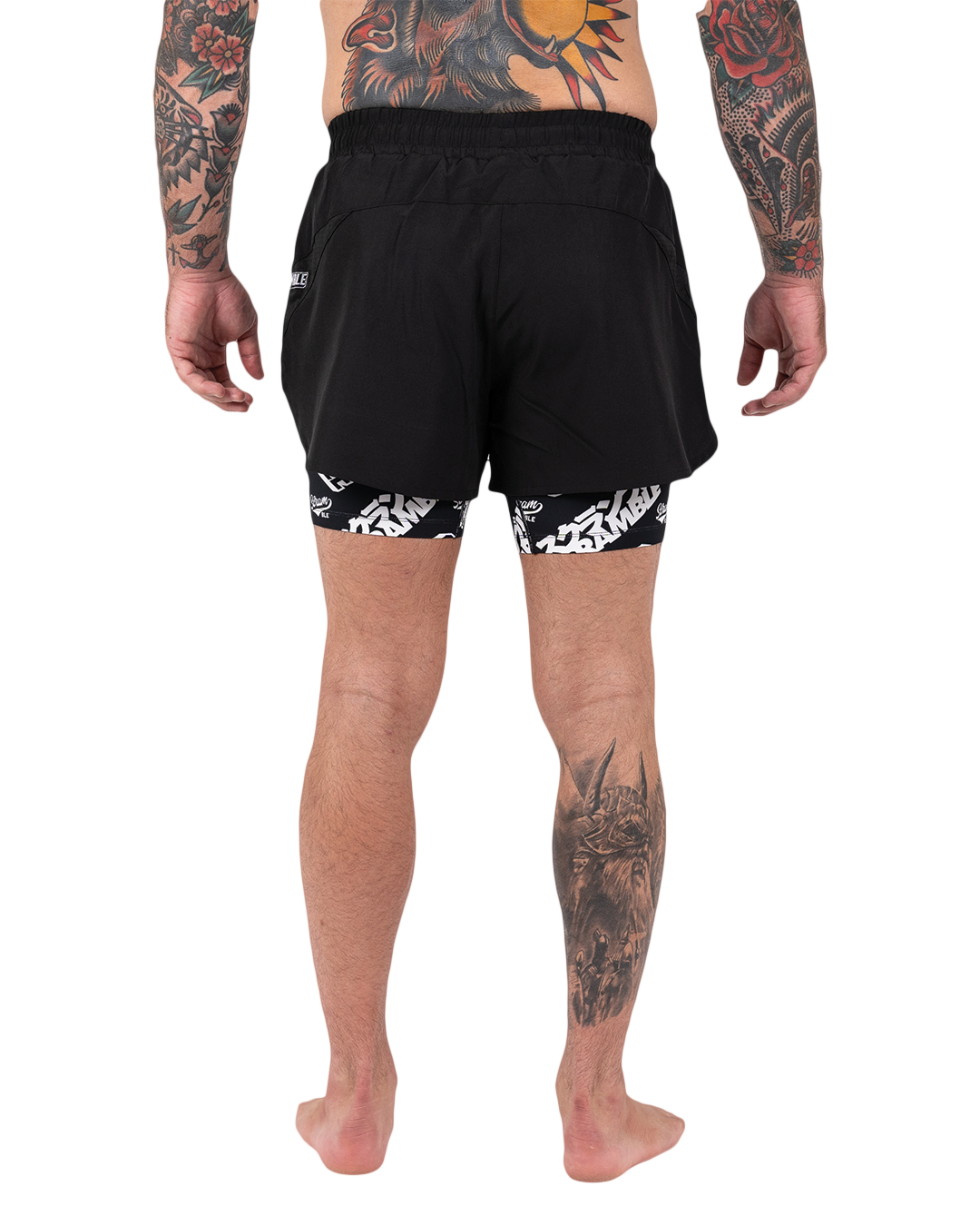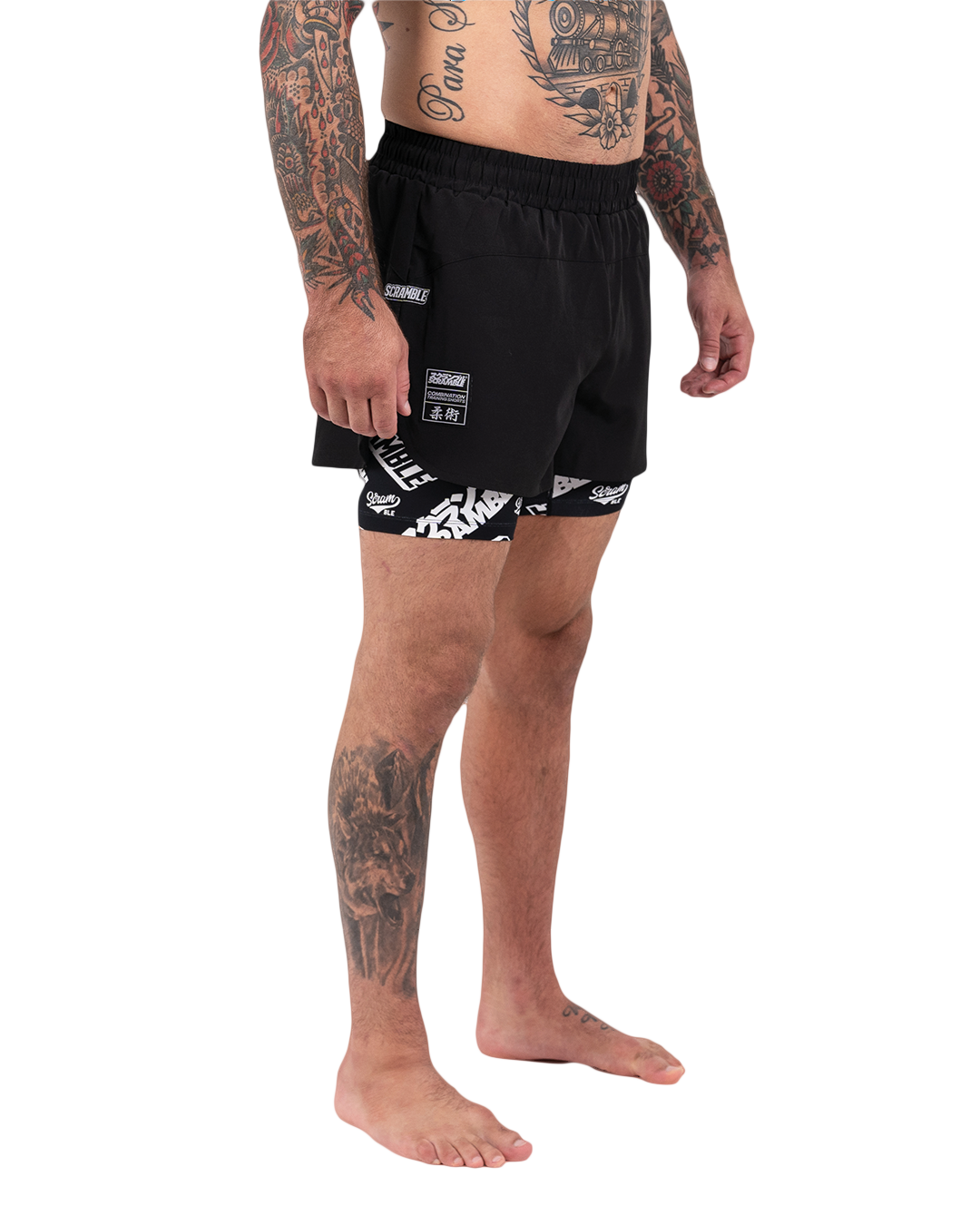 Introducing the latest addition to our collection: the Black Combination Shorts, recognized for their excellence. These shorts come with a sleek ‘Scramble everywhere’ inner Lycra layer and are designed for various training purposes, including jiujitsu, no-gi grappling, running, and gym workouts. Their design includes an inner Lycra layer and a short, above-the-thigh outer layer for maximum comfort and performance.