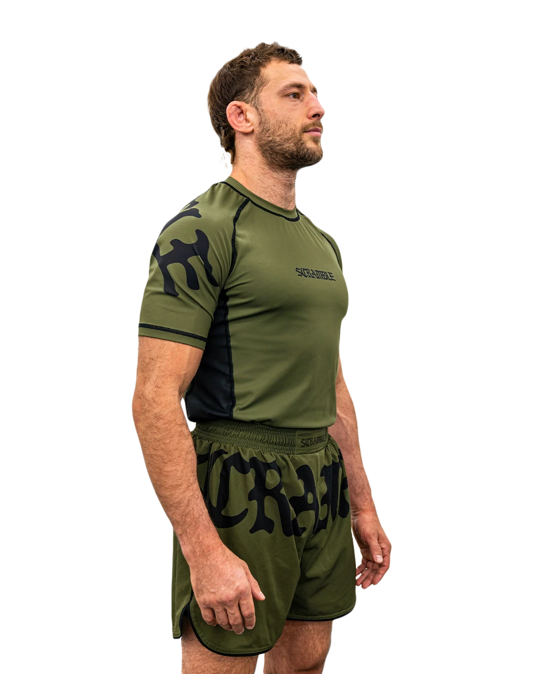Scramble athlete Ethan Crelinsten (formerly of Craig Jones’ B-Team, now of Simple Man Martial Arts) loved the original black and white Glyph nogi rashguard so much, he asked us to put together a whole set in colours he chose. So, we have the Glyph set – which now includes shorts – in both Olive Green and Burnt Orange colourways. The Glyph set applies a simple gothic graphical theme and Scramble type treatment, which spans multiple panels across the garment, with a complimentary, smaller logo on the reverse side. Limited quantities, no restocks.