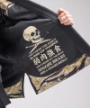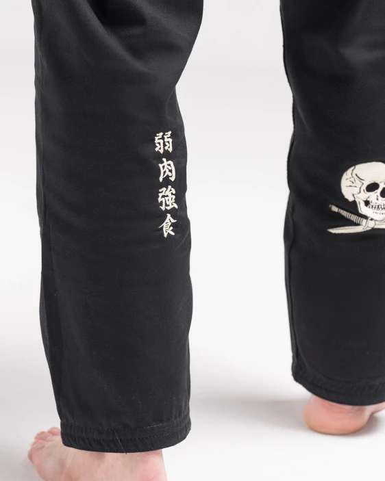Underneath the skull, there is the Japanese phrase Jakuniku kyōshoku (弱肉強食) which is an idiom meaning “the weak are meat, the strong eat,” – essentially the “law of the jungle” or “survival of the fittest.” This is a phrase applicable to both military and martial arts scenarios and reflects the harsh reality of both of those.
