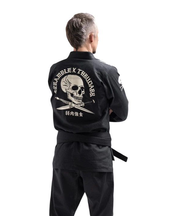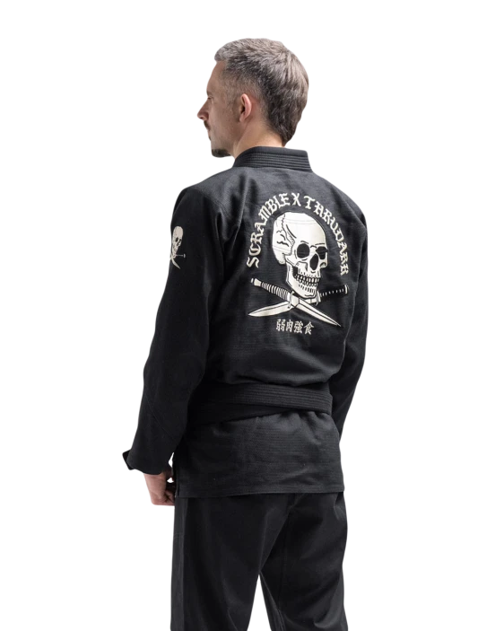 A premium BJJ gi designed by Scramble & ThruDark. Reassuringly heavy, 100% cotton 550gsm pearl weave top and 100% cotton twill pants, this comfortable yet striking BJJ gi is subtle but carries the full weight of the collaboration, including: