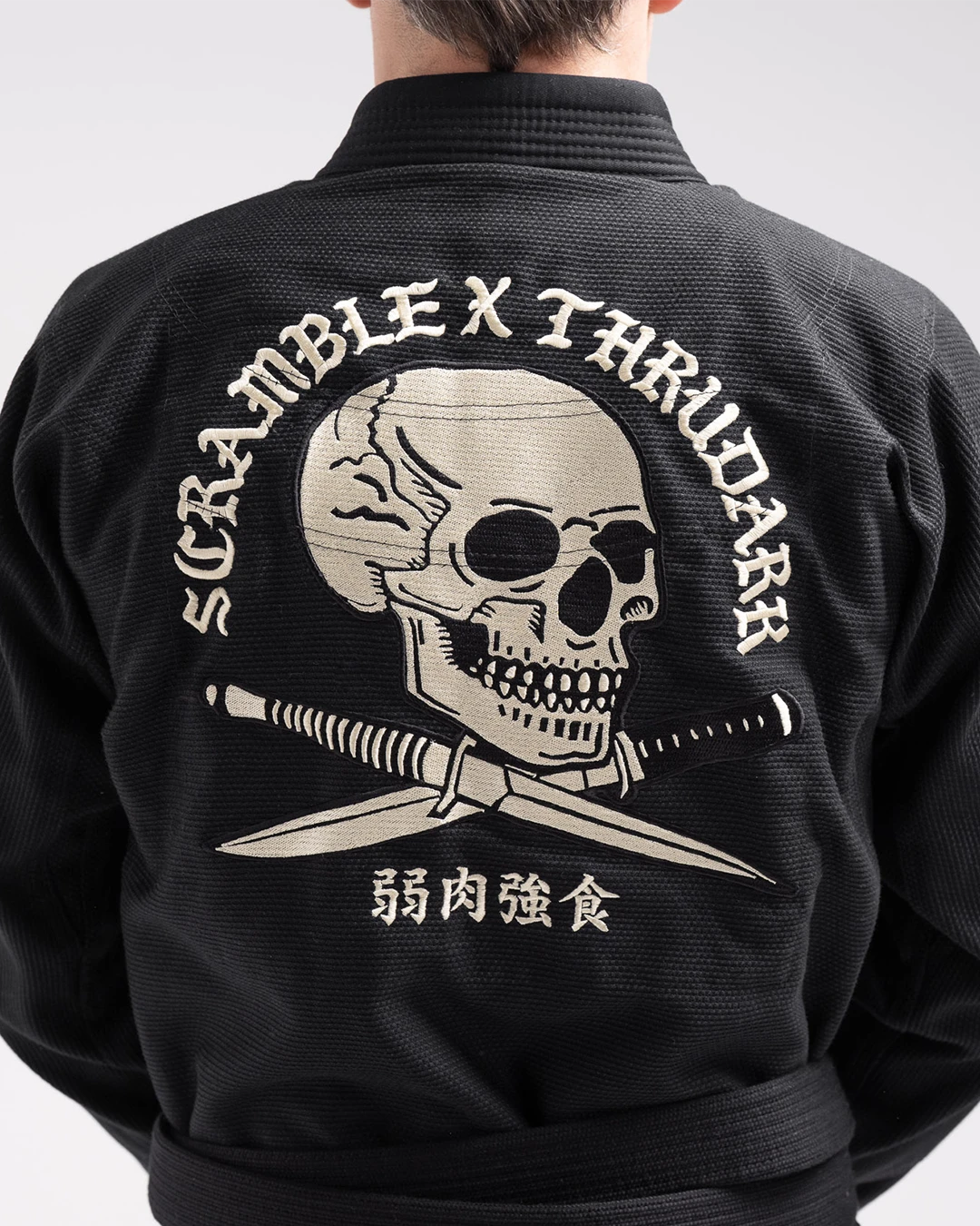 A premium BJJ gi designed by Scramble & ThruDark. Reassuringly heavy, 100% cotton 550gsm pearl weave top and 100% cotton twill pants, this comfortable yet striking BJJ gi is subtle but carries the full weight of the collaboration, including: