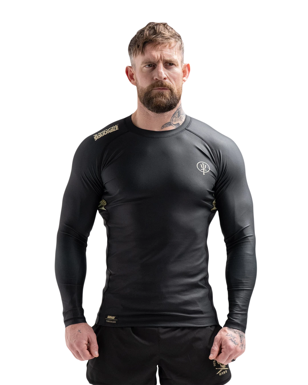 This long sleeved rashguard features subtle Scramble x ThruDark branding to the front and shoulder, with a bold, hand-drawn Scramble x ThruDark graphic on the back. The underarm panels are made from breathable mesh and feature the custom Scramble x Thrudark Tiger Camo pattern.