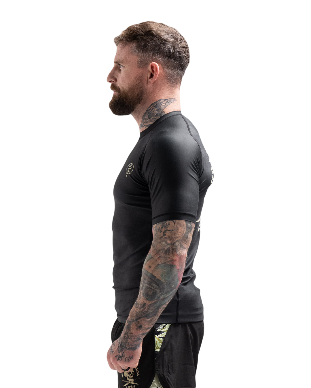This short sleeved rashguard features subtle Scramble x ThruDark branding to the front and shoulder, with a bold, hand-drawn Scramble x ThruDark graphic on the back. The underarm panels are made from breathable mesh and feature the custom Scramble x Thrudark Tiger Camo pattern.