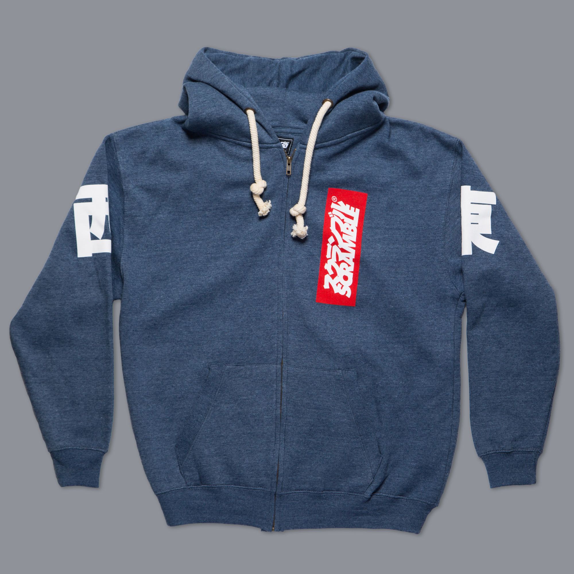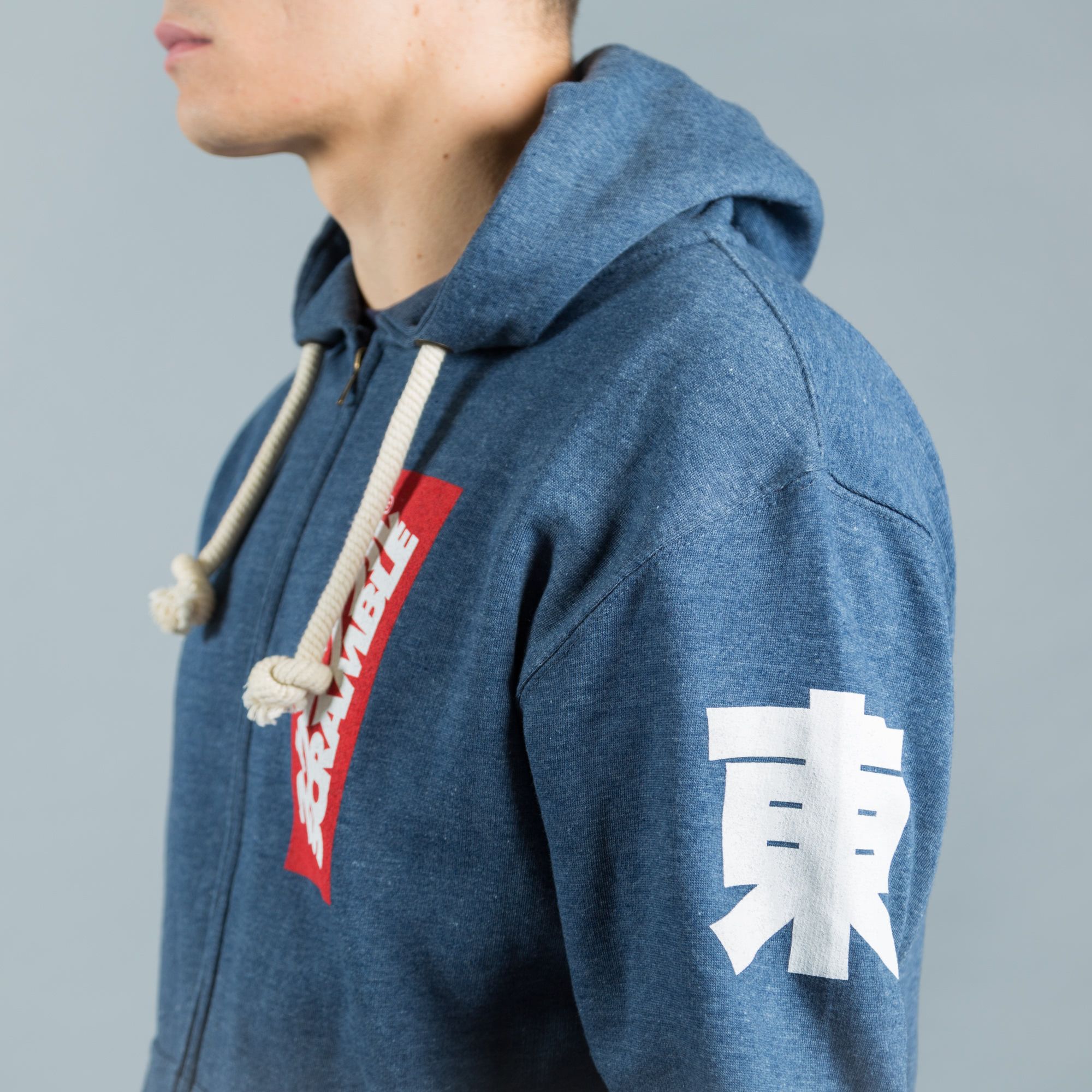 Zip up hoody with East / West in kanji on the shoulders and vertical box logo on chest.