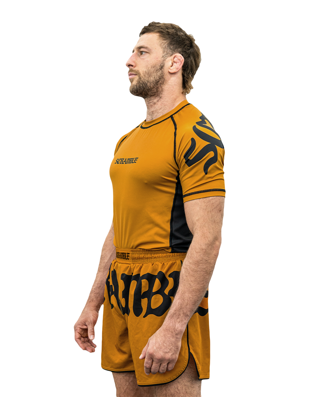 Scramble athlete Ethan Crelinsten (formerly of Craig Jones’ B-Team, now of Simple Man Martial Arts) loved the original black and white Glyph nogi rashguard so much, he asked us to put together a whole set in colours he chose. So, we have the Glyph set – which now includes shorts – in both Olive Green and Burnt Orange colourways. The Glyph set applies a simple gothic graphical theme and Scramble type treatment, which spans multiple panels across the garment, with a complimentary, smaller logo on the reverse side. Limited quantities, no restocks.