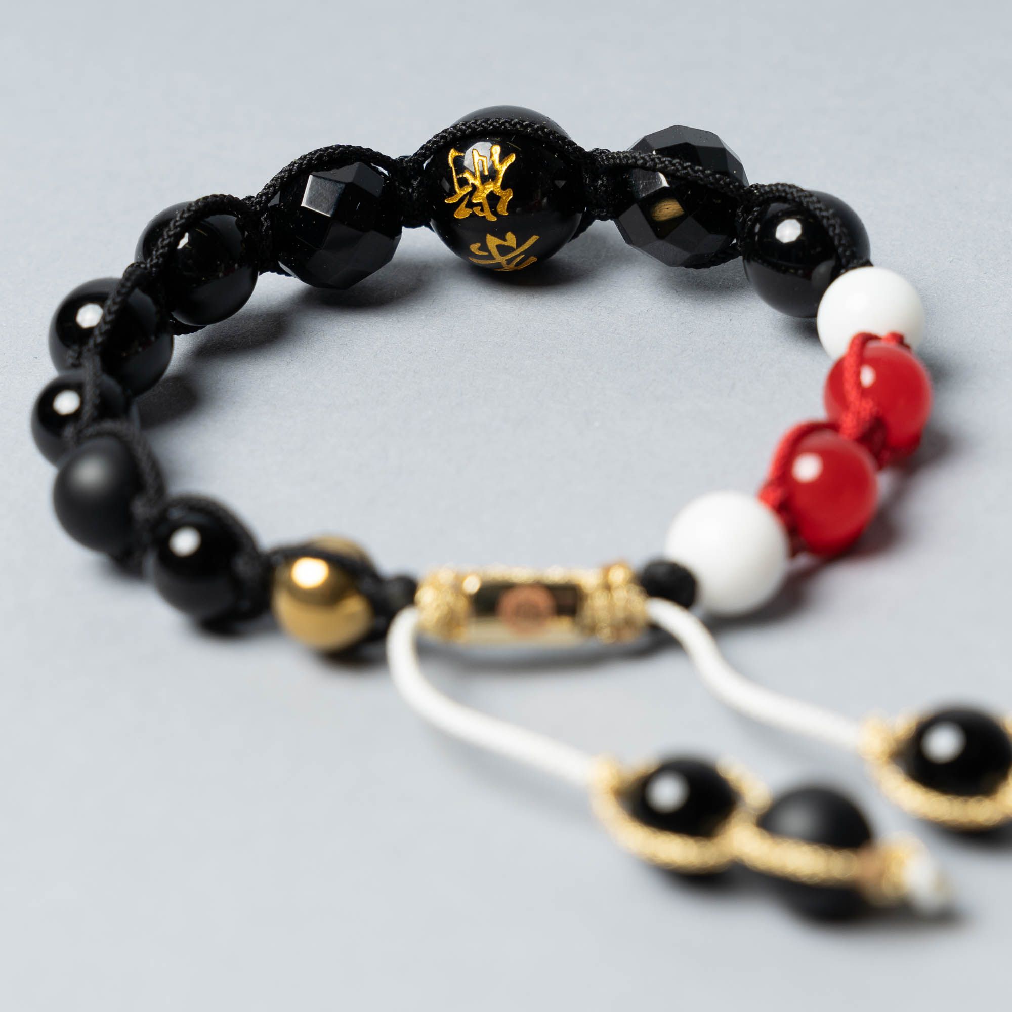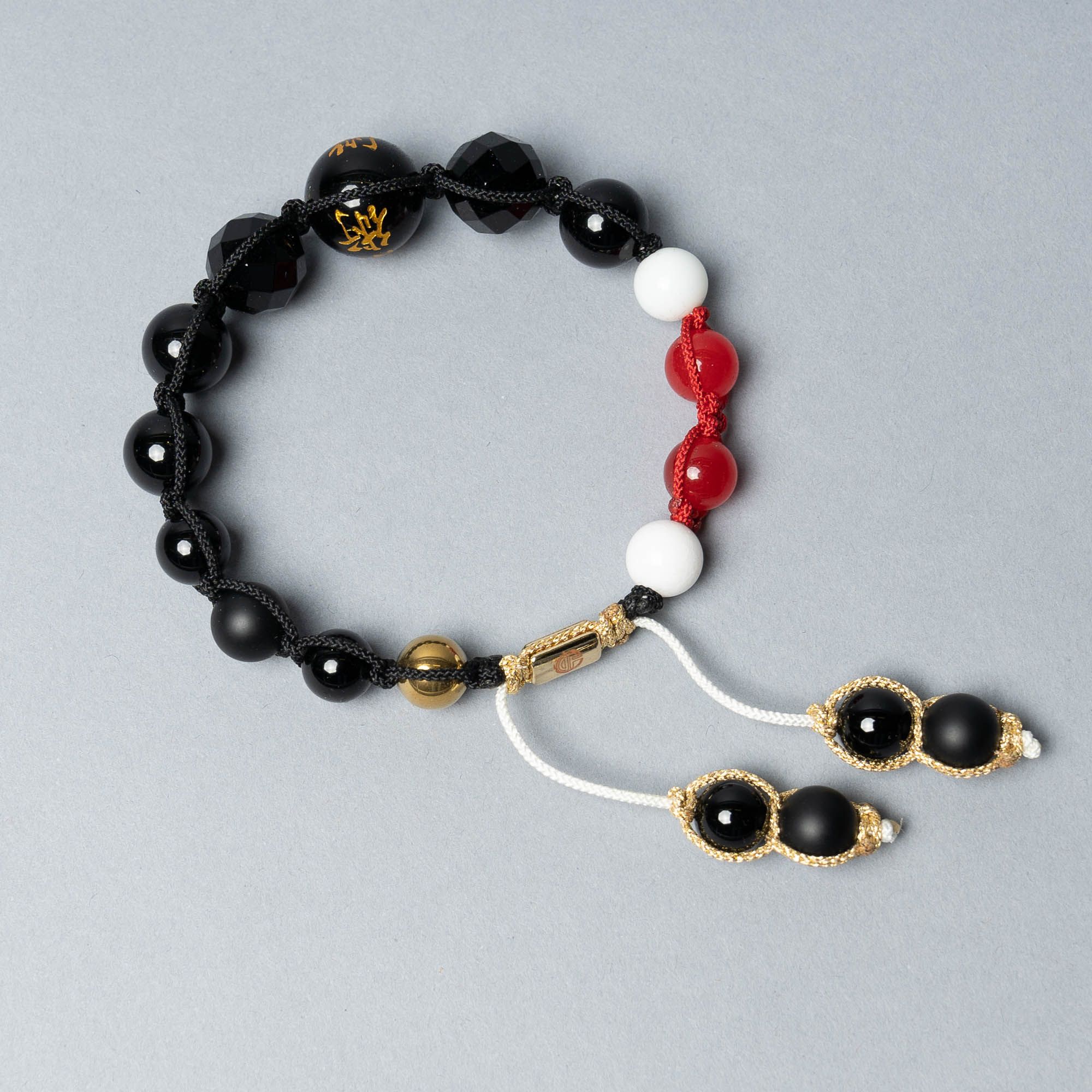 The bracelet consists of Black and White Onyx, Hematite and Red Agate – with the center bead engraved in gold with the kanji for Ju-jutsu : 柔術