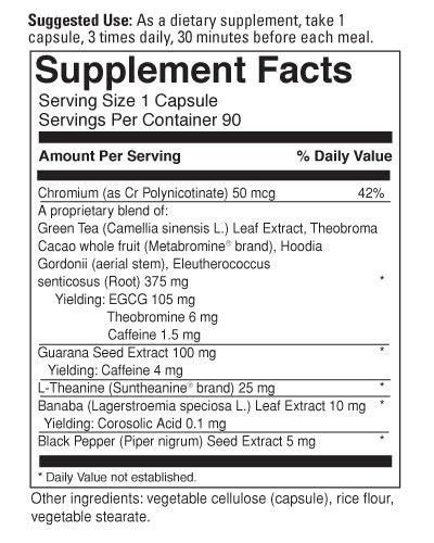 A proprietary blend of Green Tea Extract (Camellia sinensis L.) Leaf Extract, Theobroma Cacao whole fruit (Metabromine® brand), Hoodia Gordonii (aerial stem), Eleutherococcus senticosus (Root) 375 mg