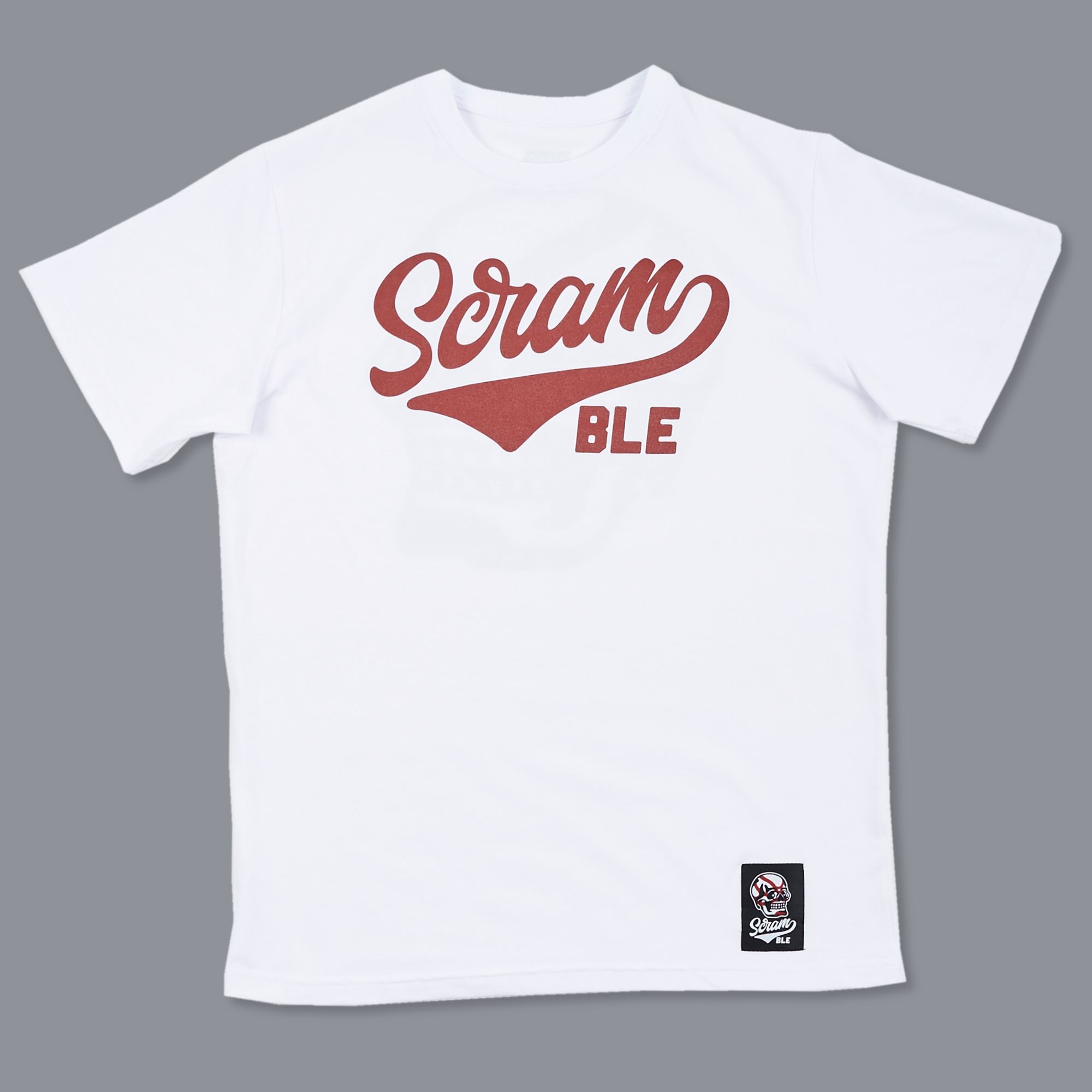 White t-shirt with Americana-inspired Scramble typography and a huge ol’ Skabuki graphic on the back.