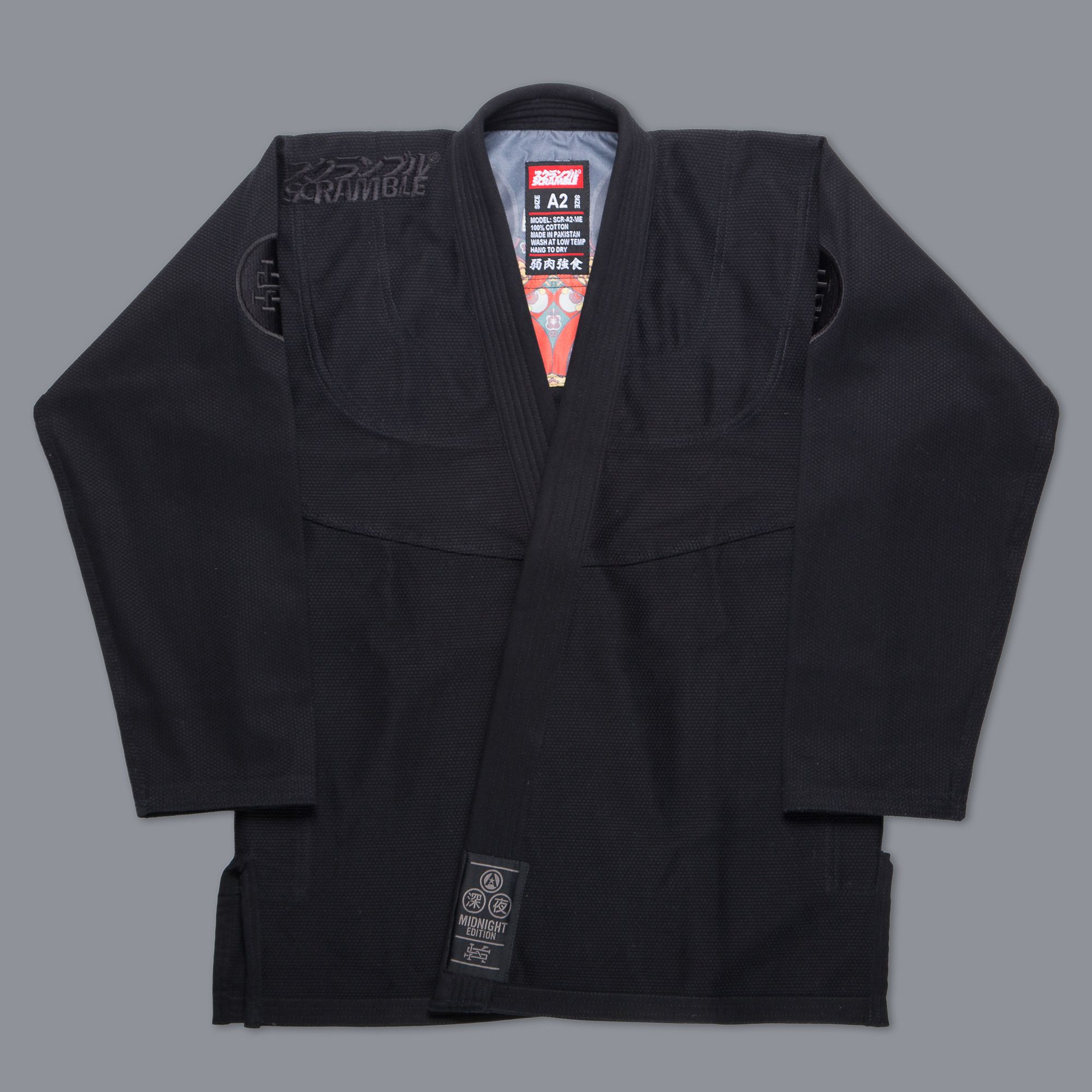 The blacked-out edition of our popular Athlete 3 kimono. The black on black embroidery catches the light to give just a hint of Scramble branding throughout. The labelling details on the trousers and gi top are unique to the Midnight Edition Athlete.