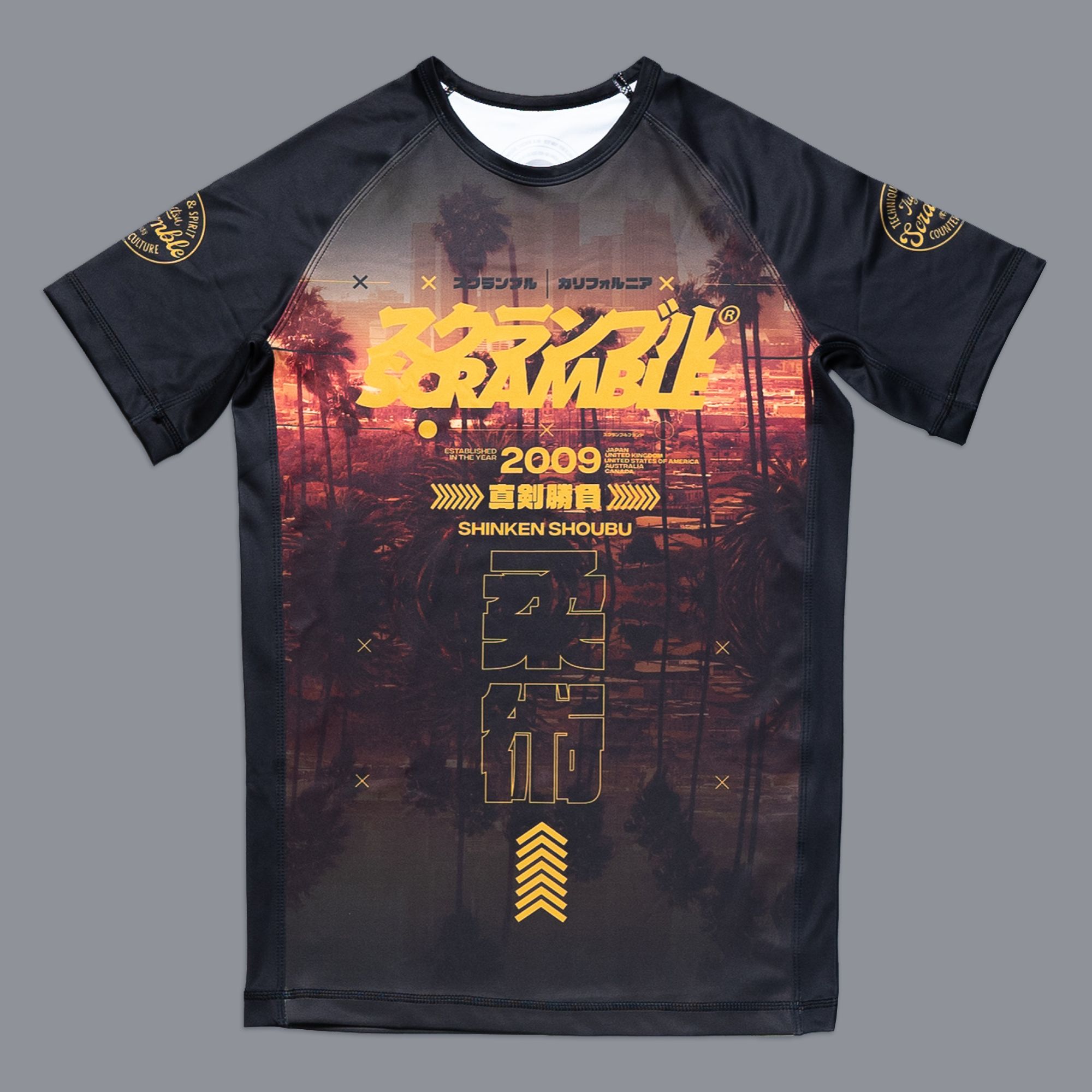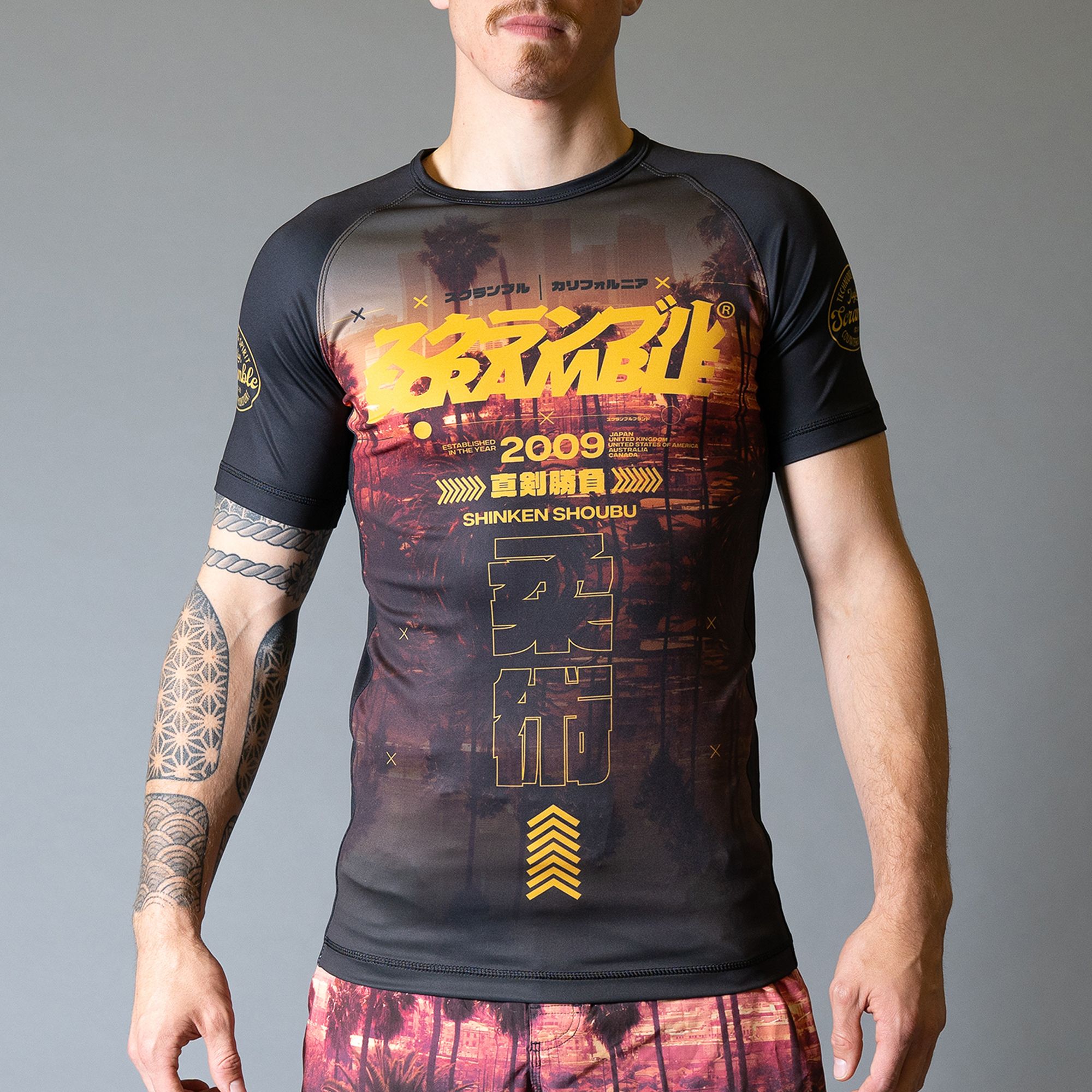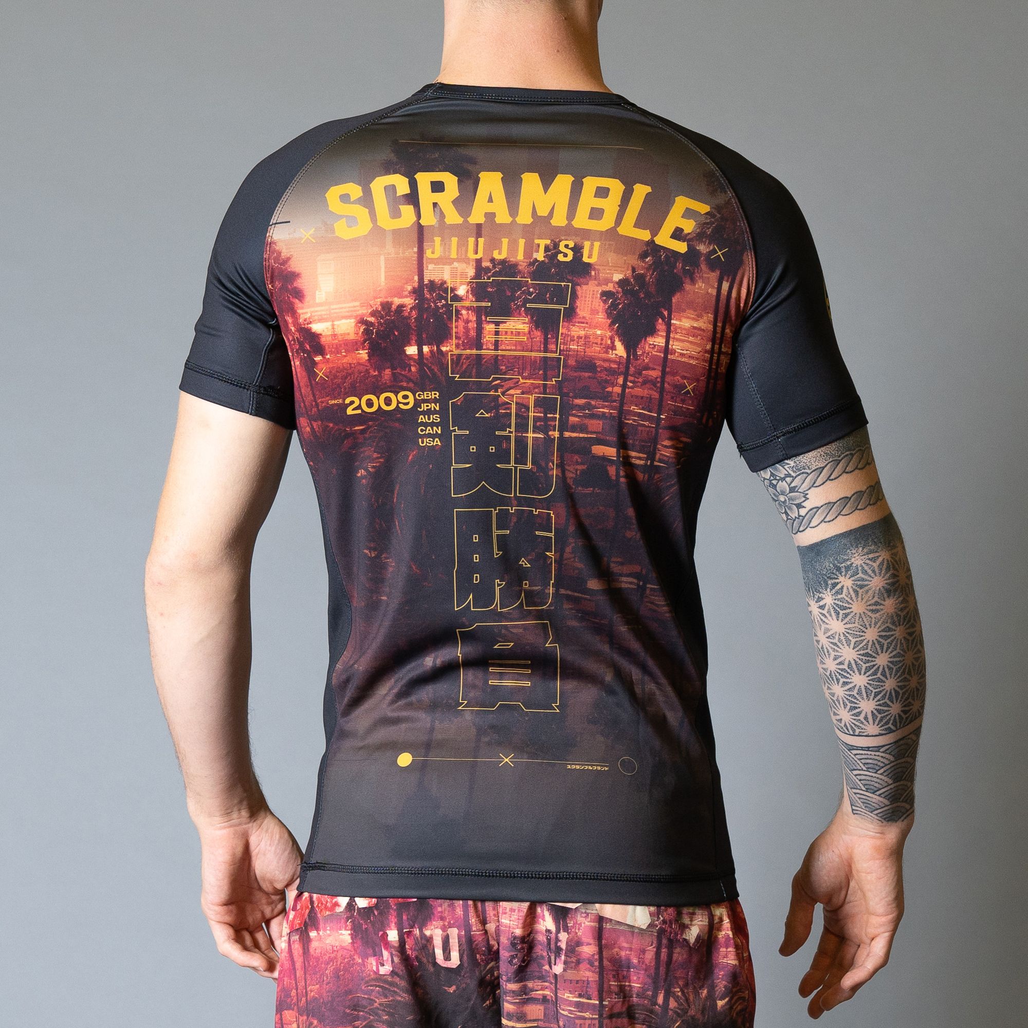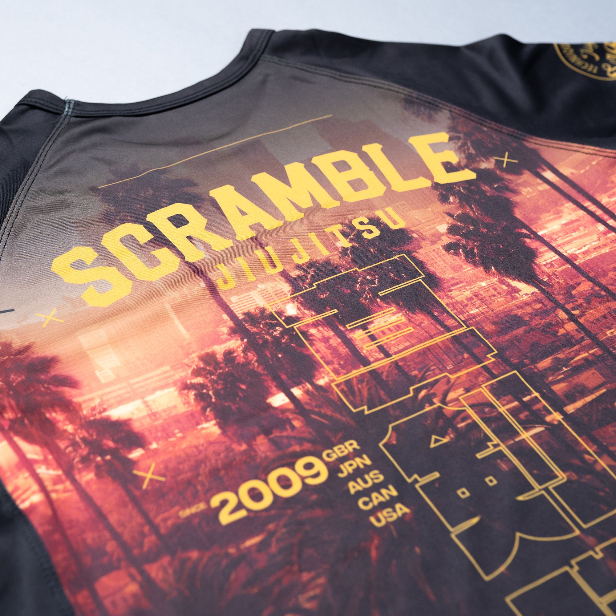 The Scramble Cali rashguard is part of our Cali no gi set. The theme for this set came about from knowing that a team of Scramble athletes would be representing the brand at ADCC, the “Olympics” of Grappling, that was held in California in 2019.