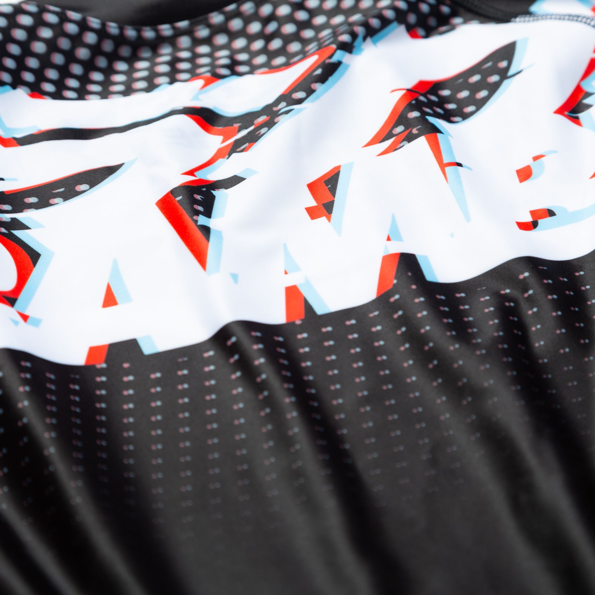 Short sleeve, athletic fit. Scramble logo treatment based on anaglyph style red-blue colouring.