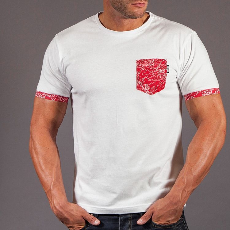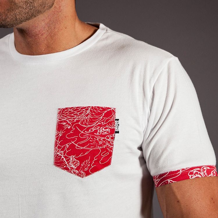 Featuring a sewn on pocket and cuff trim with a traditional dragon print. Mid-weight tee. Muscles not included.