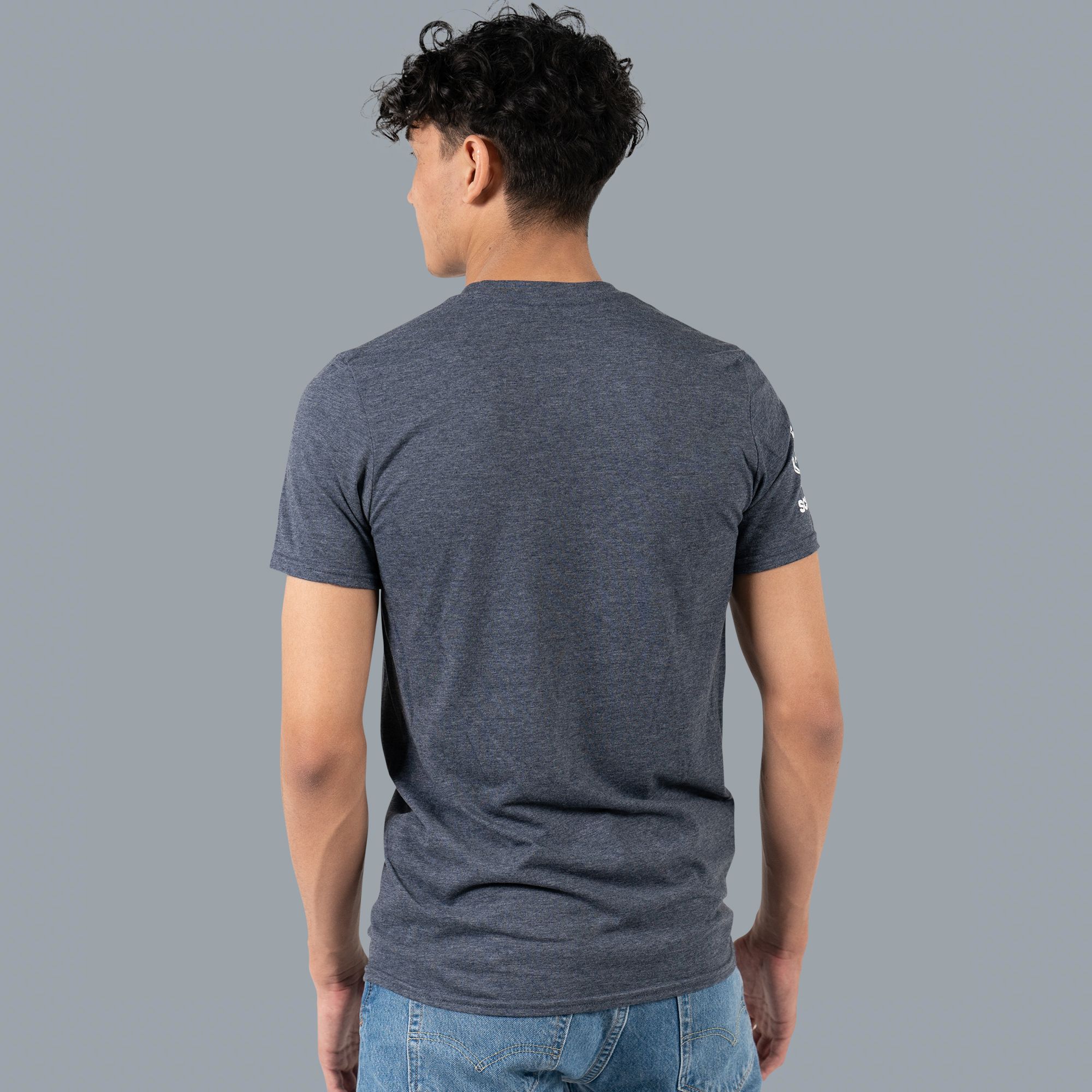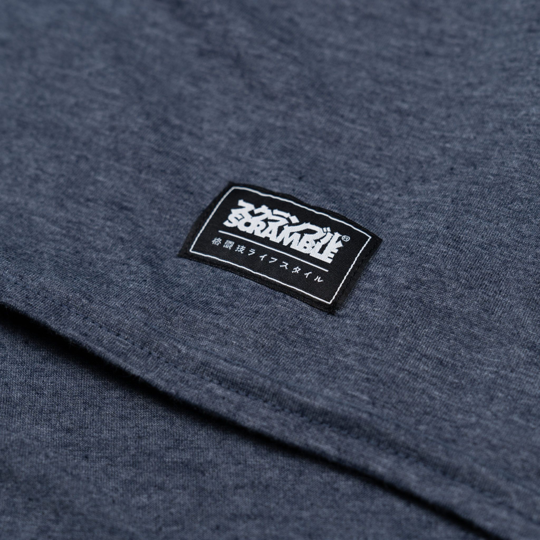 Lightweight subtle heather navy summer tee with screen printed graphics and Scramble hem label.