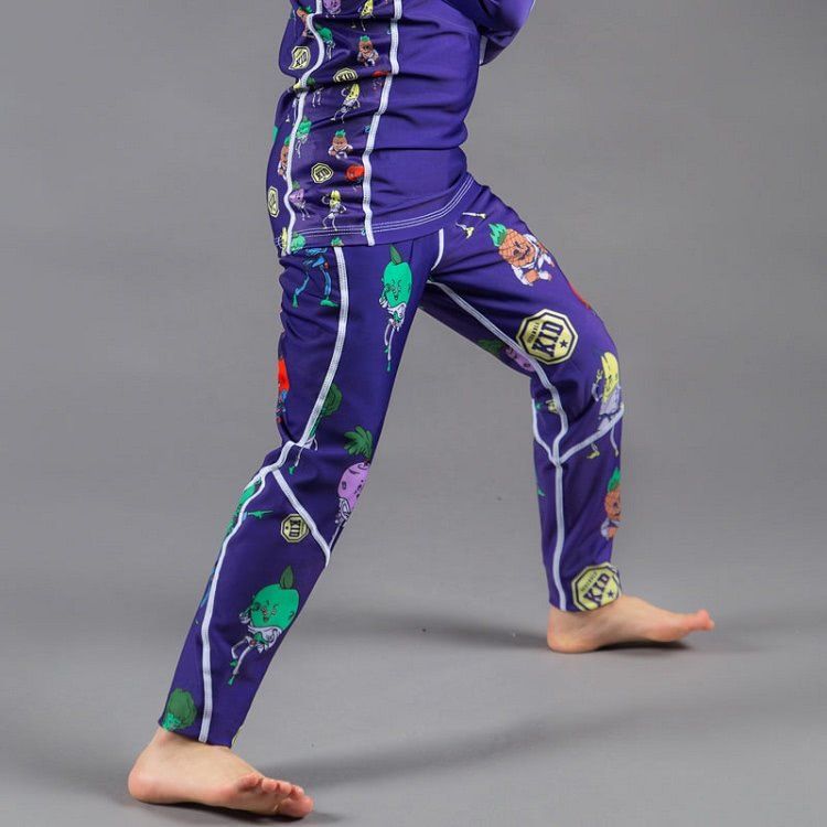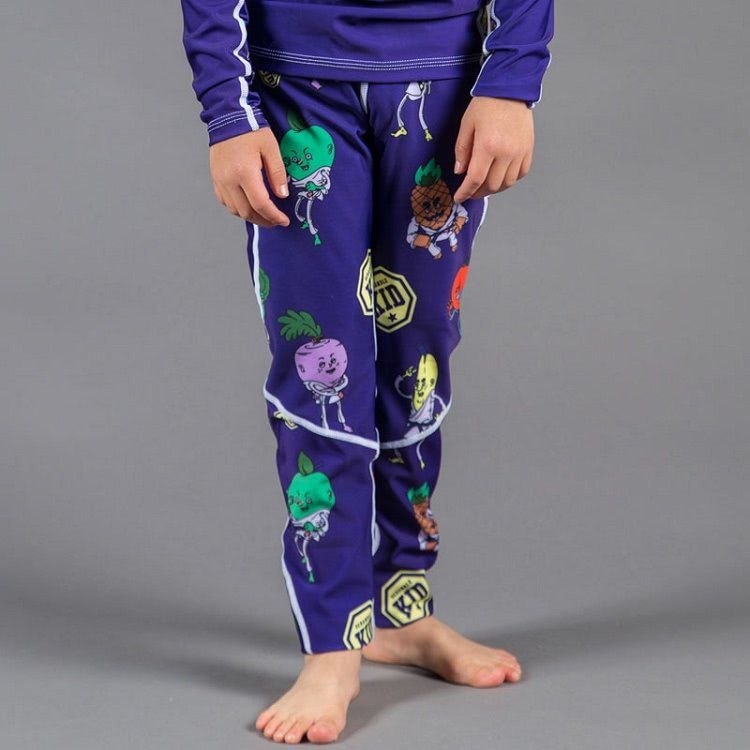 Scramble Kid spats, featuring BJJ fruits and vegetables. Polyester / spandex mix that resists pilling