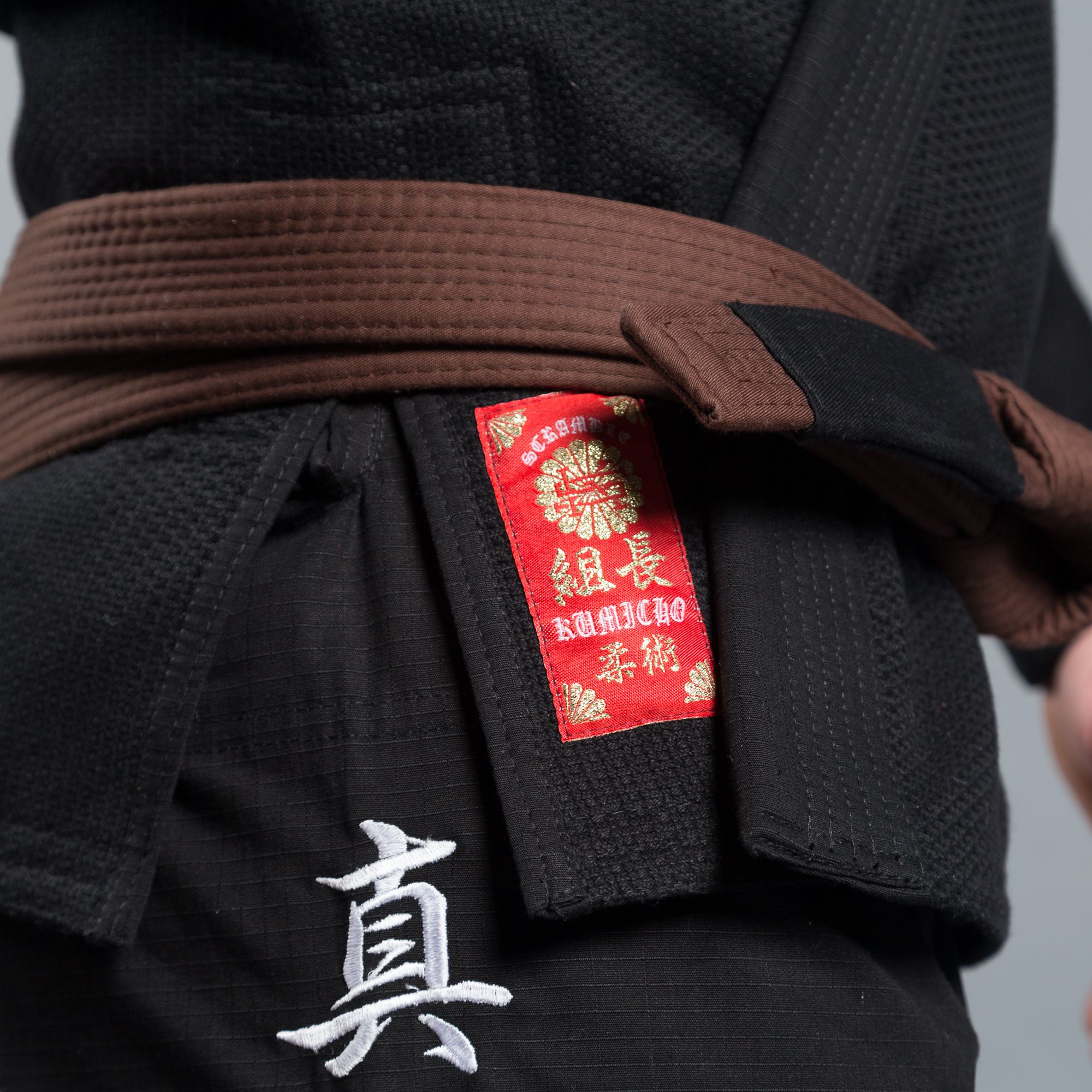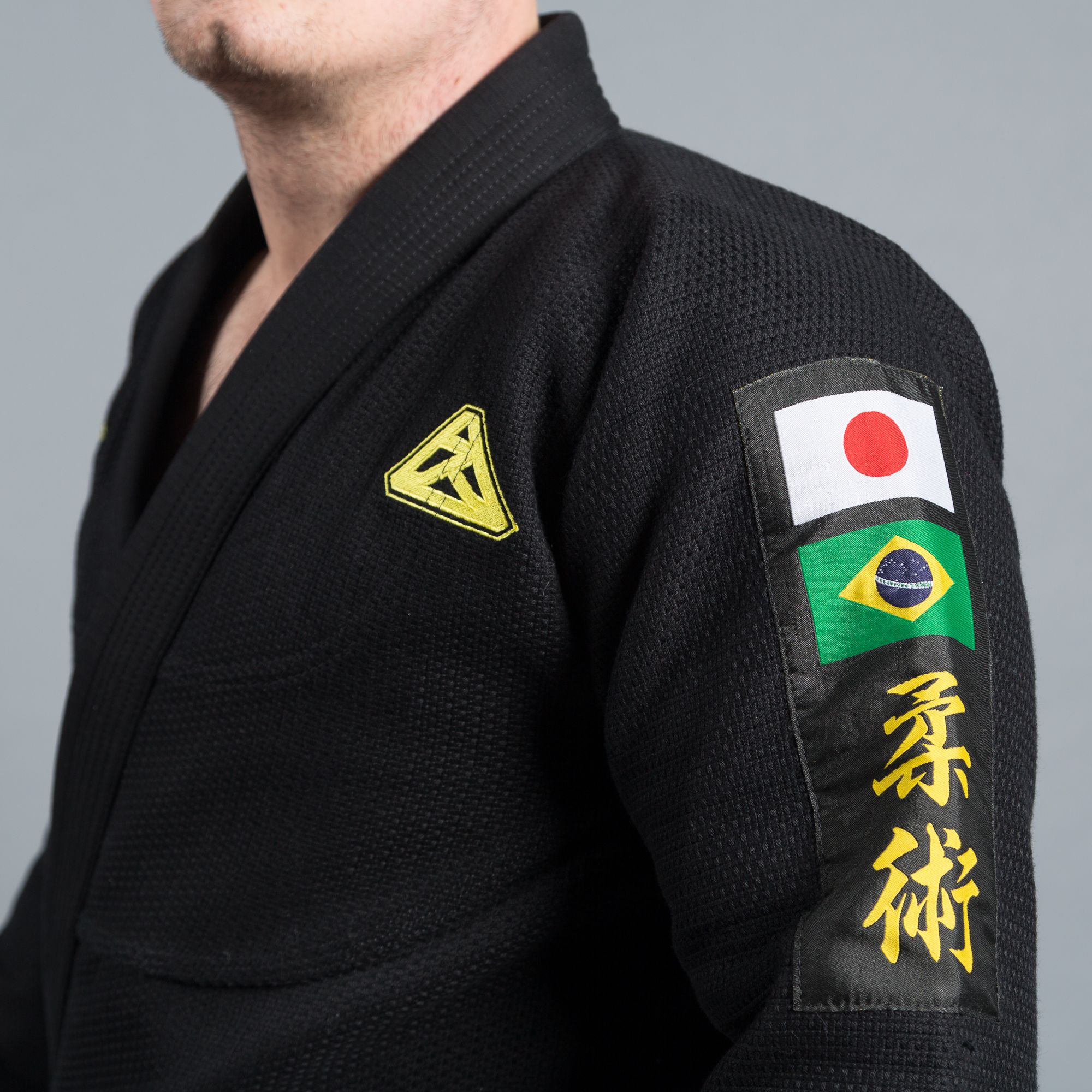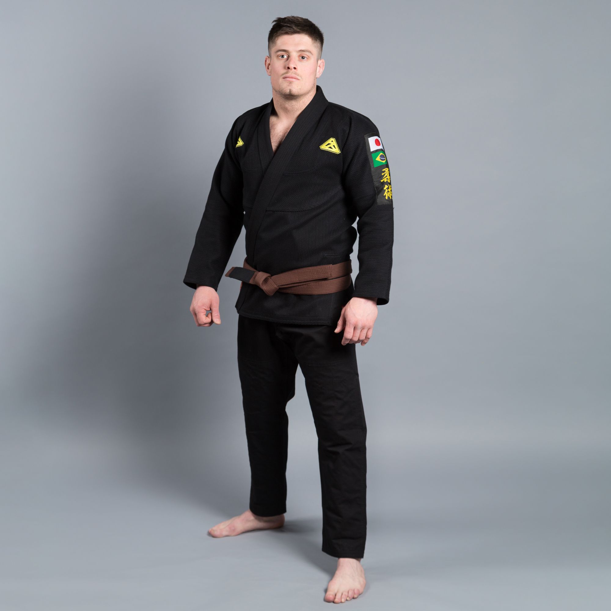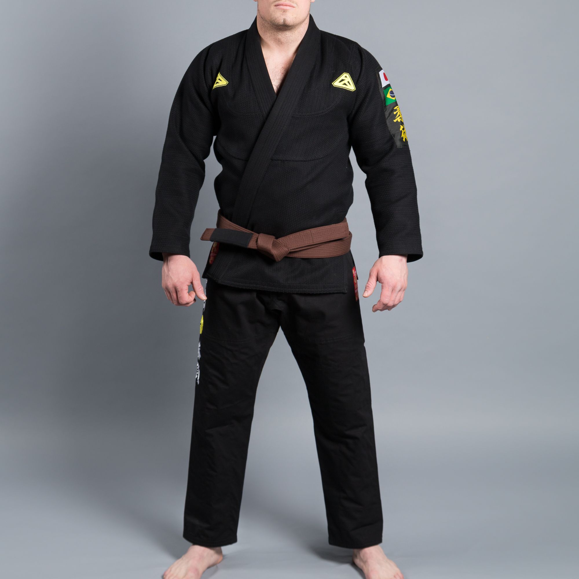 This kimono is a gold weave, cotton pants affair thick with embroidery. It will have the classic fit and feel of an old-school BJJ kimono, due to the country of manufacture and materials used, so be careful with shrinkage.