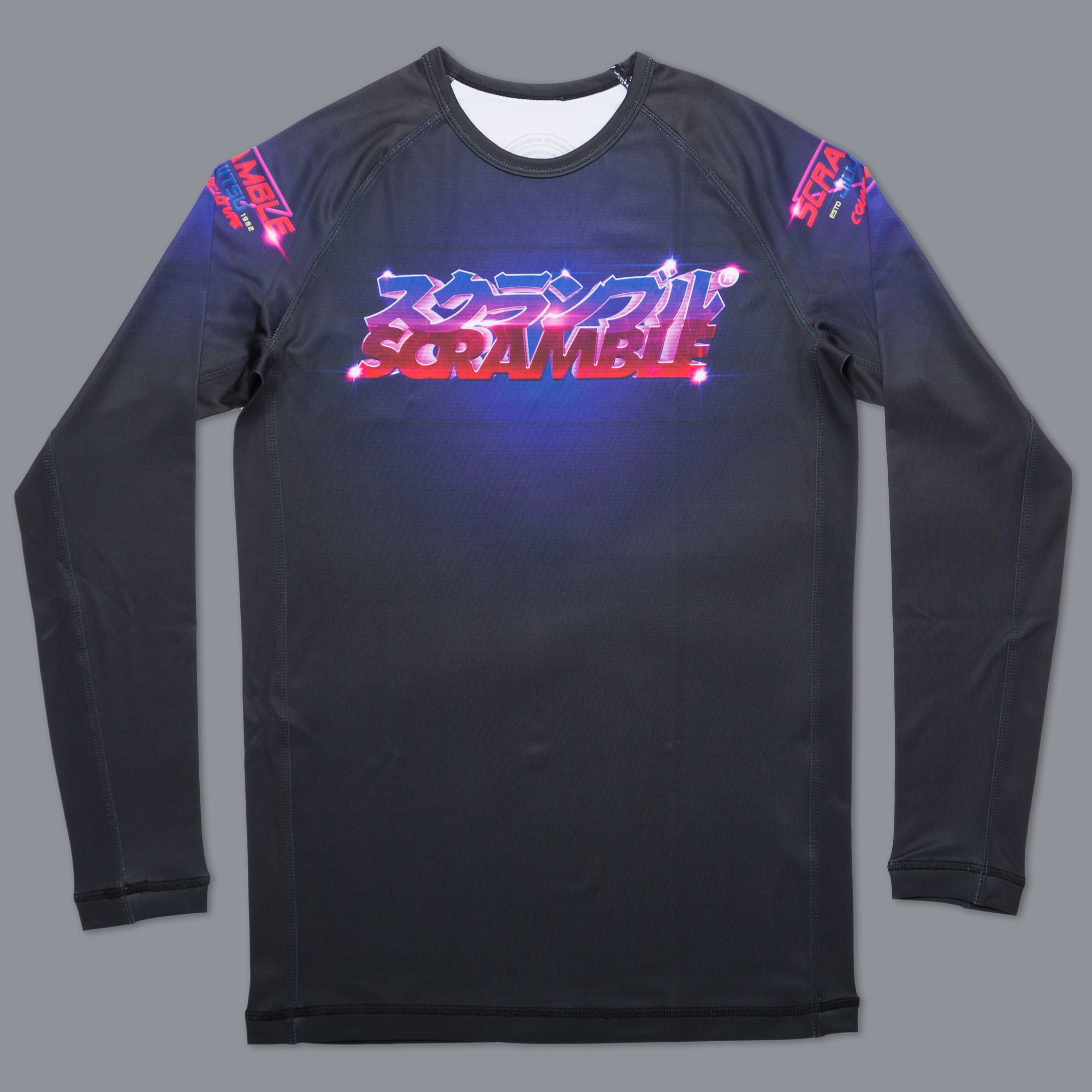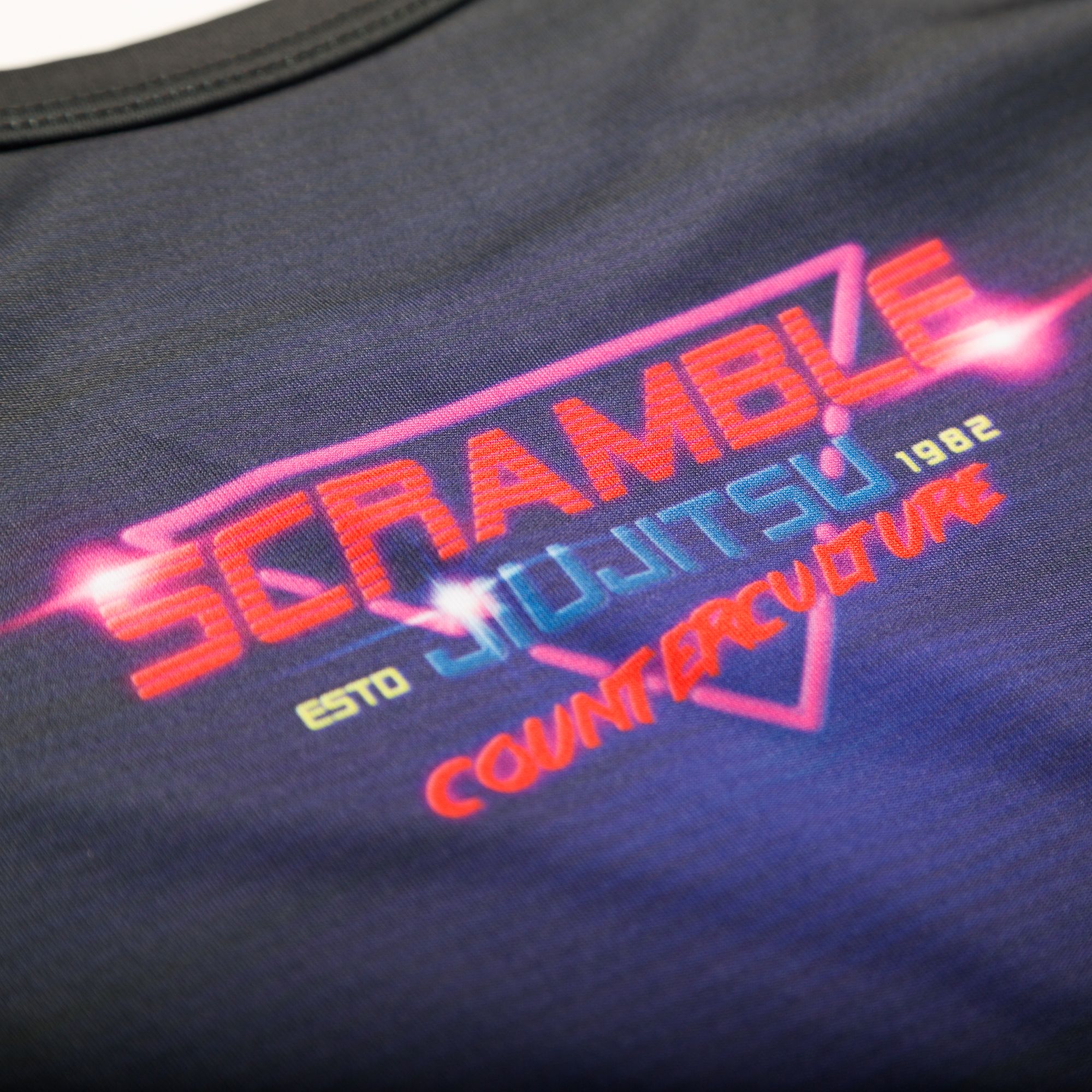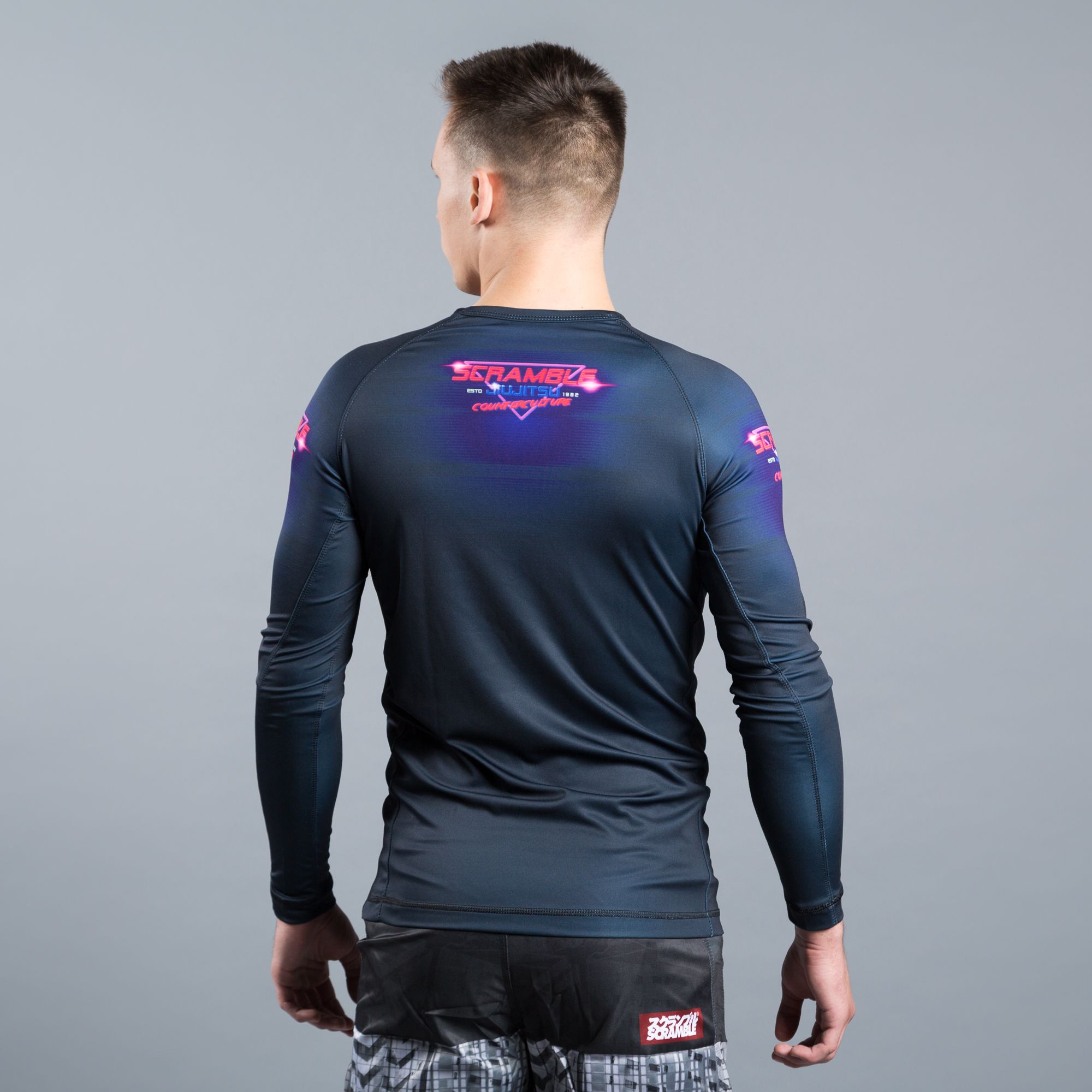 The eighties were a glorious era. Moustachioed, muscle-bound hardmen. Frizzy haired, red lipsticked ladies. Karate chops and tae kwon do kicks. Robot cars and neon synths. Celebrate the scanlined, VHS-flavoured awesome with the Lazertronic rashguard.