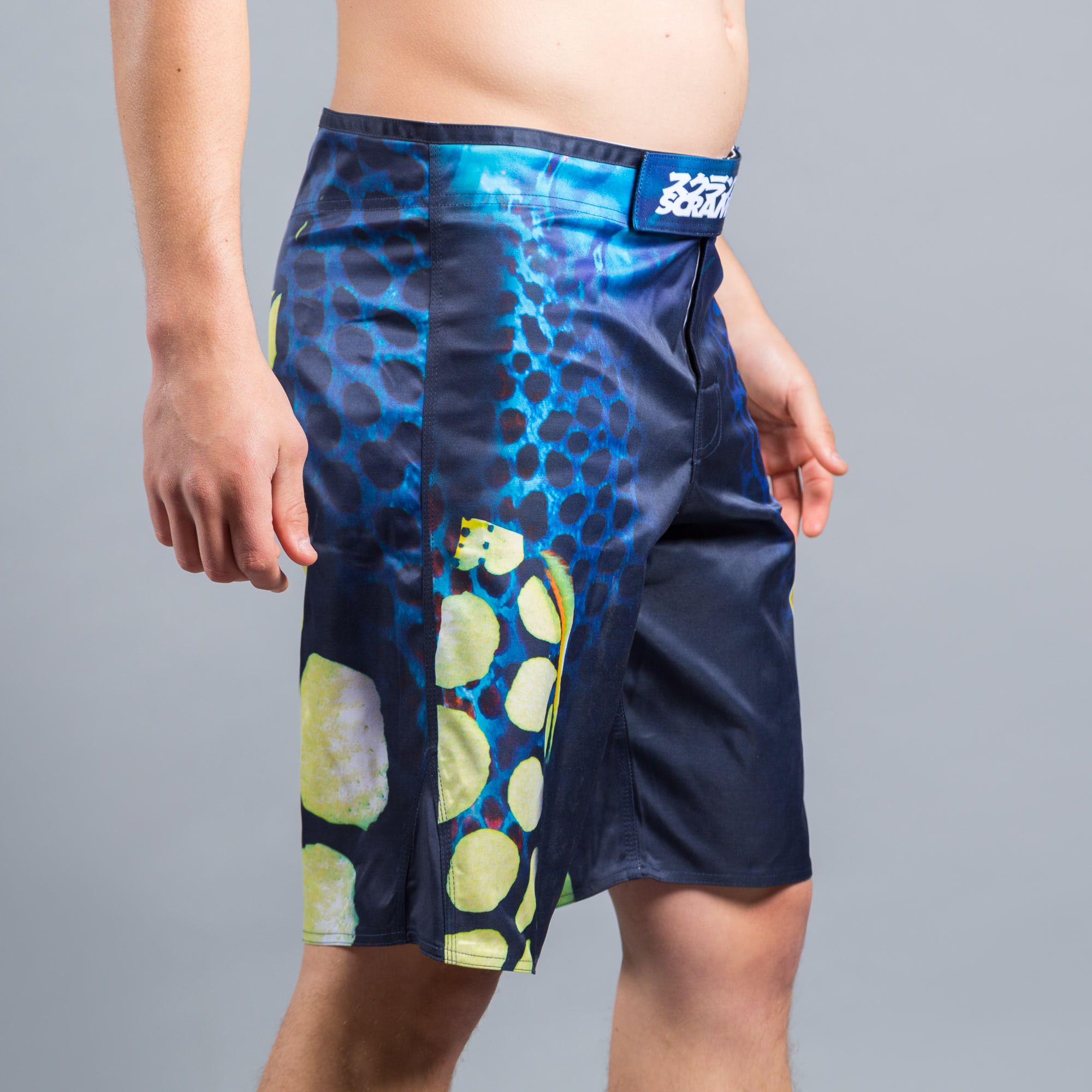 Part of the Pacifica range of jiu jitsu and grappling wear, inspired by the blue skies, clear oceans and marine life of the South Pacific. The bright patterns of the Clown Triggerfish can be seen on these grappling shorts.