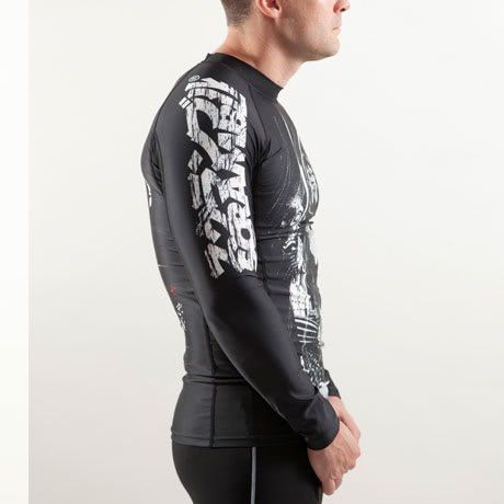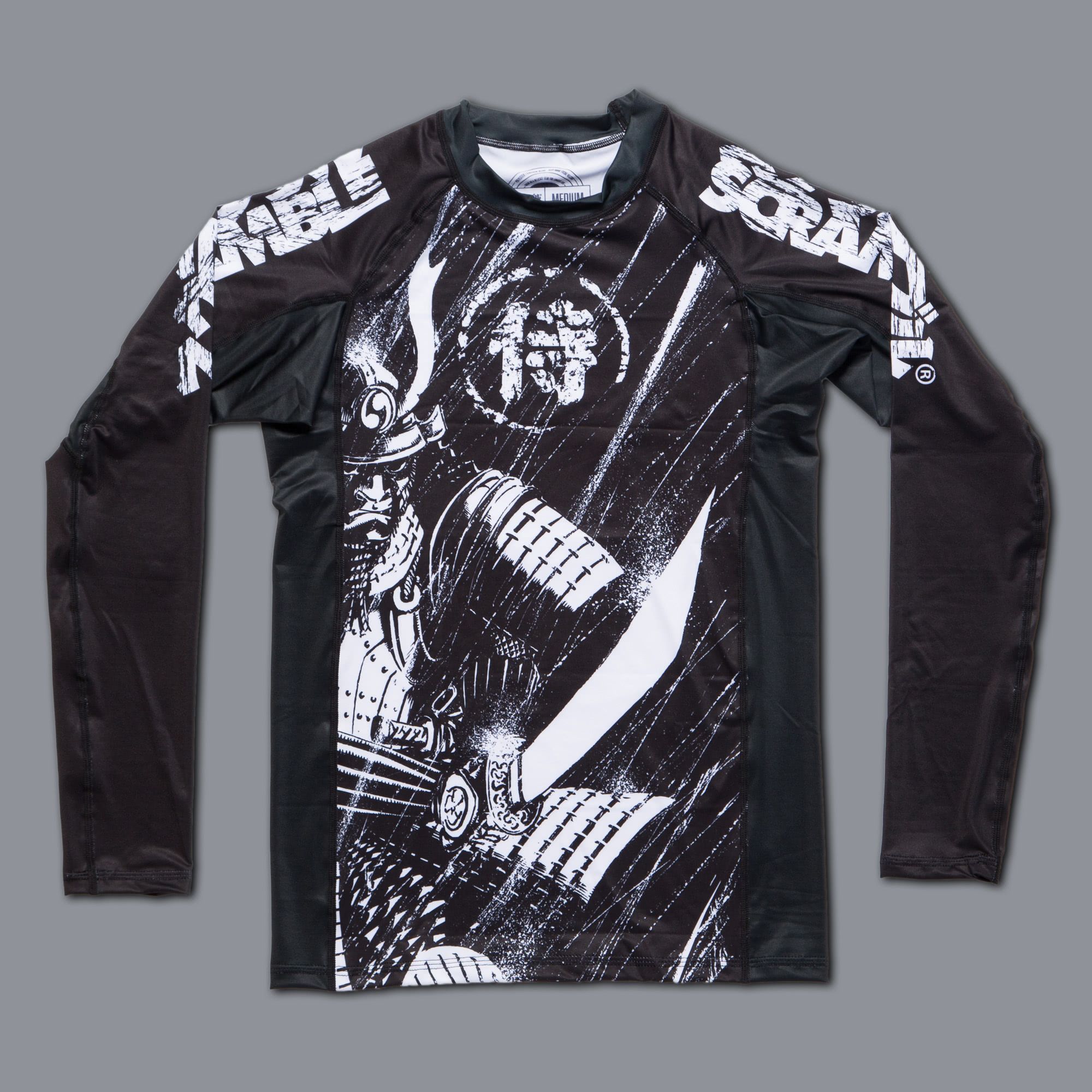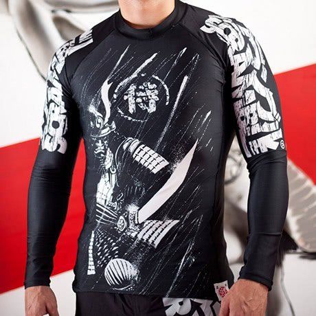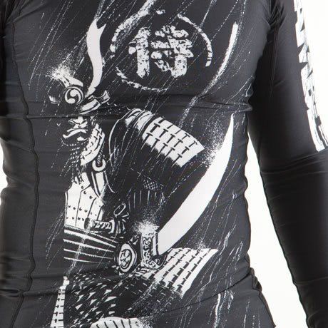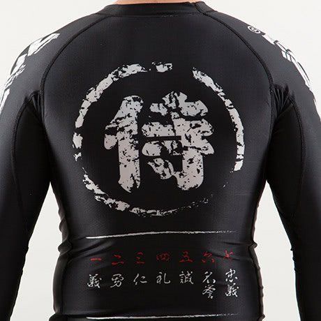 This rashguard showcases artwork by Gawakoto on the front, and the seven virtues of Bushido the back design: