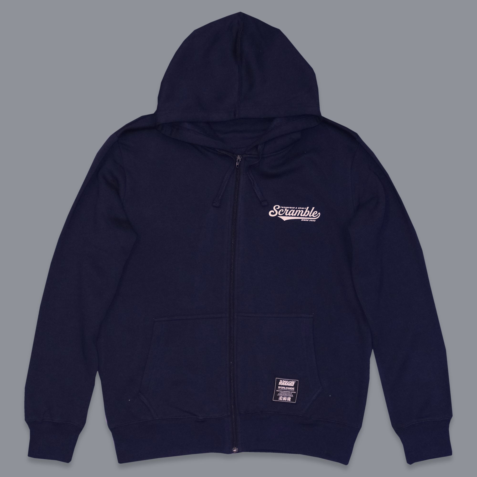 Focusing on quality of materials above all, this navy blue zip-up hoody is made from midweight, premium quality brushback fleece cotton. The top has a regular fit and subtle Scramble branding including a screen printed breast logo and large back print of our Technique & Spirit typography.