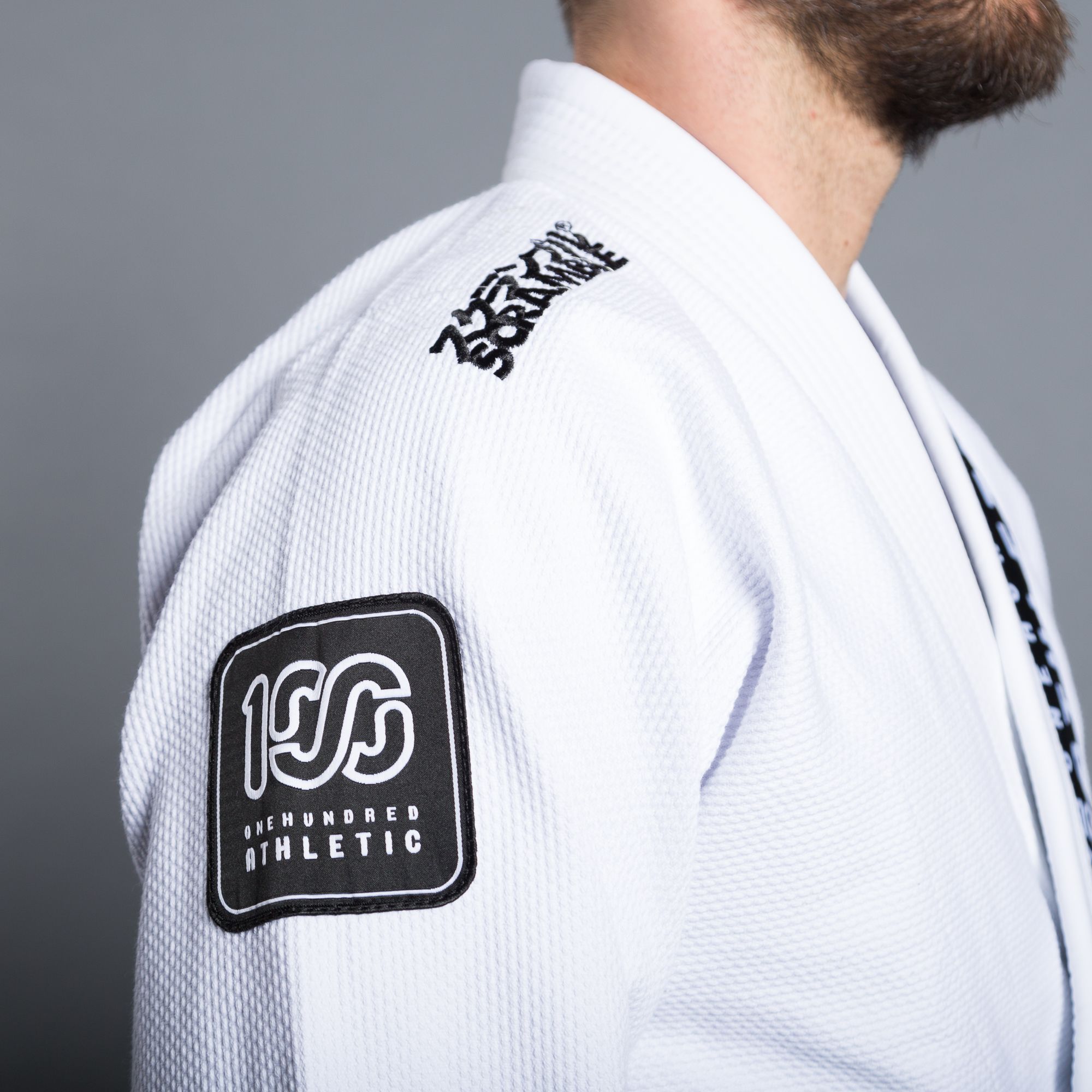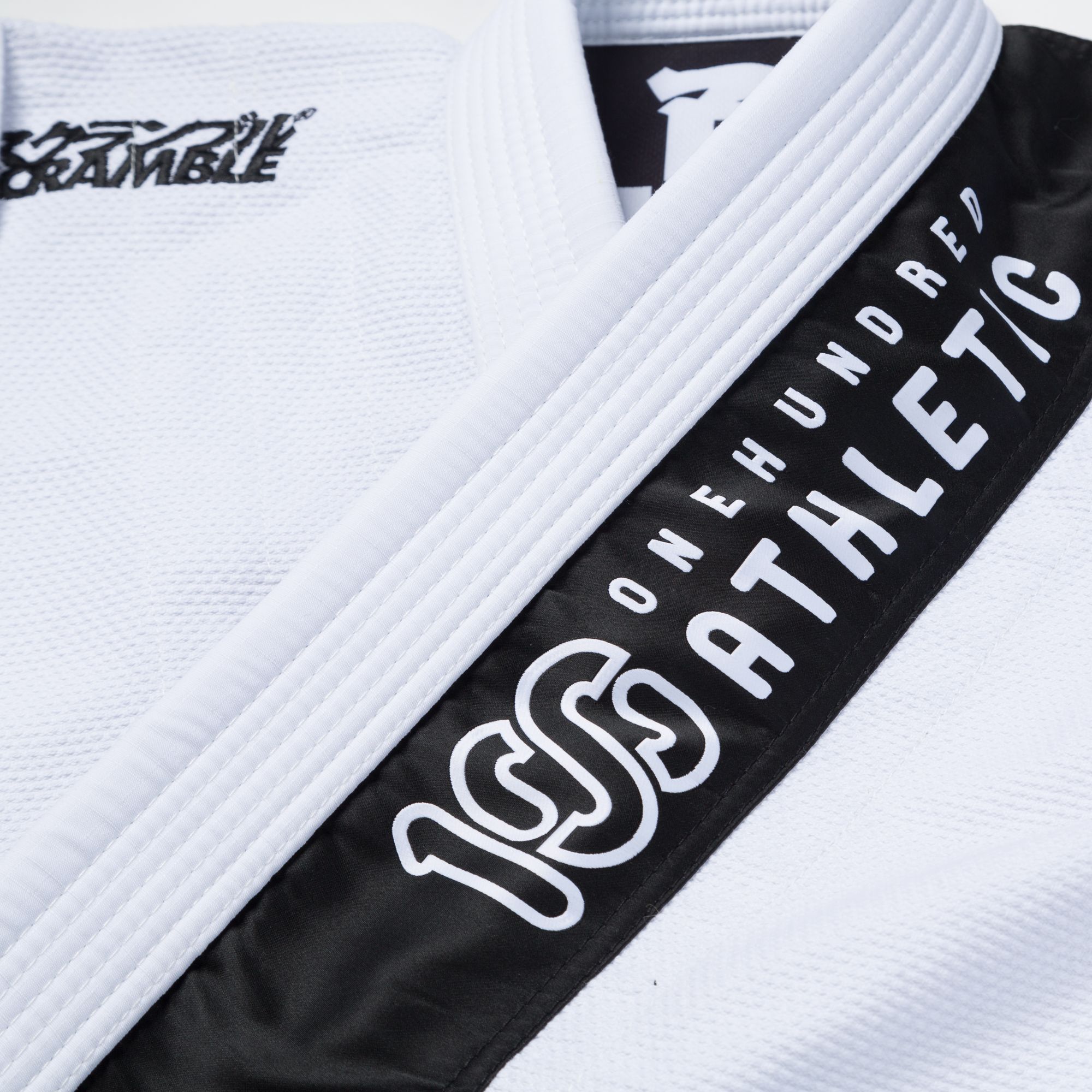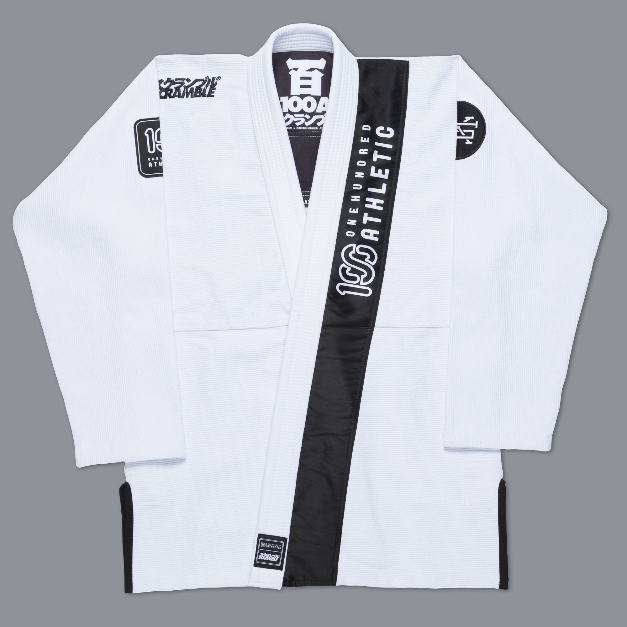 The 100Athletic x Scramble Kimono features a hybrid cut, between the Japanese style and the traditional BJJ style, and numerous patches and details celebrating the collaboration.