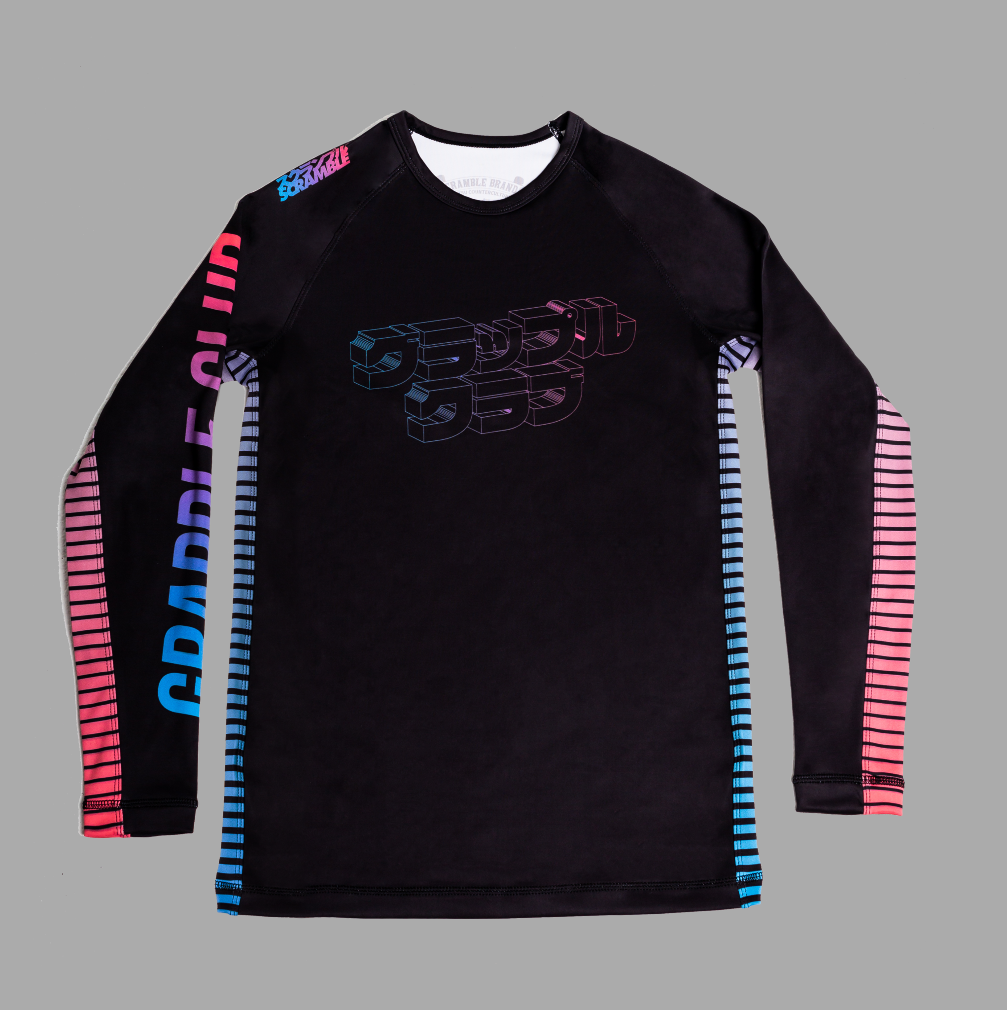 We took the name Grapple Club and made a 3d wireframe katakana model of it, applying a retro colour blend and extrapolating that out to the rest of the rashguard. This BJJ rashguard is made from our custom polyester blend that is ultra soft and resists pilling effectively.