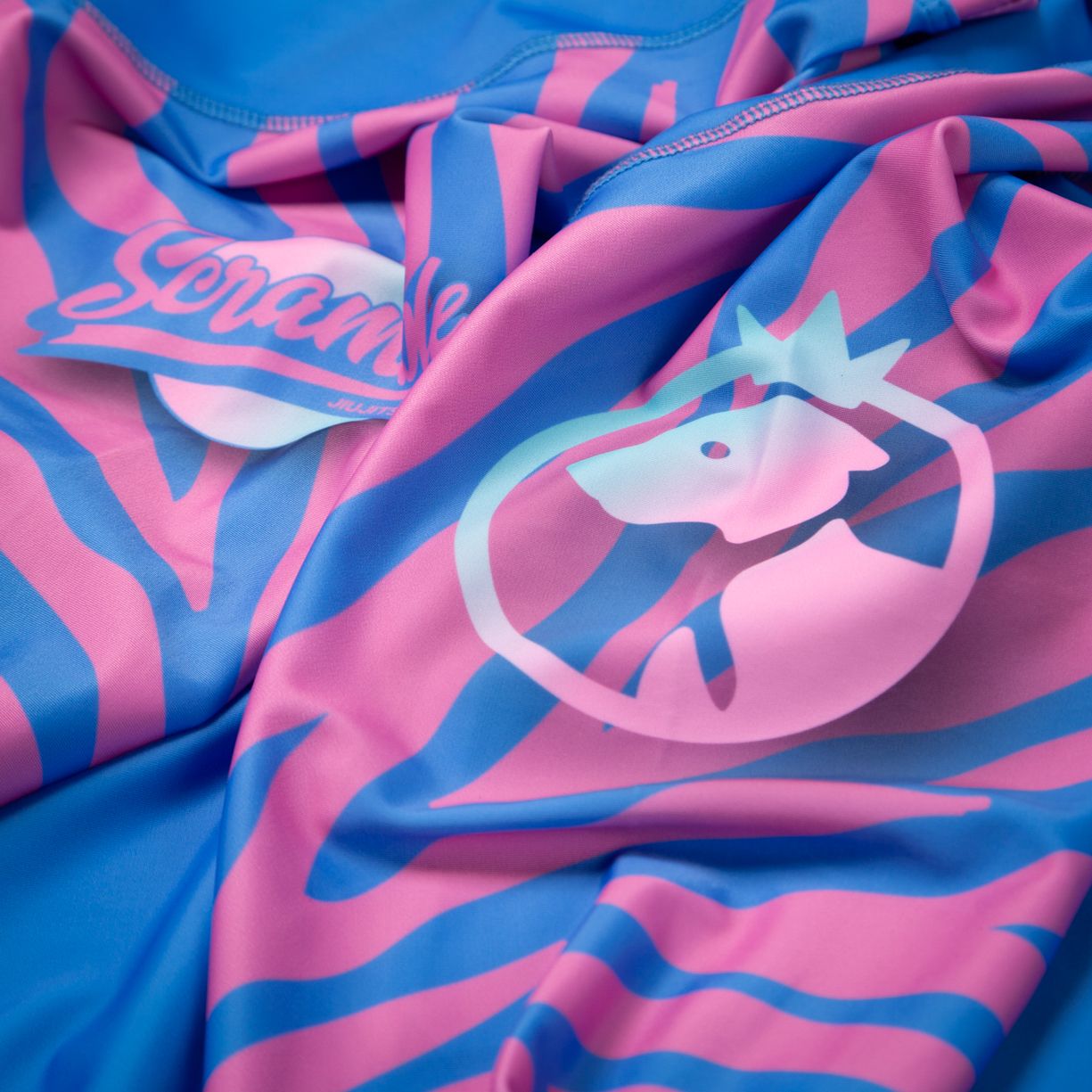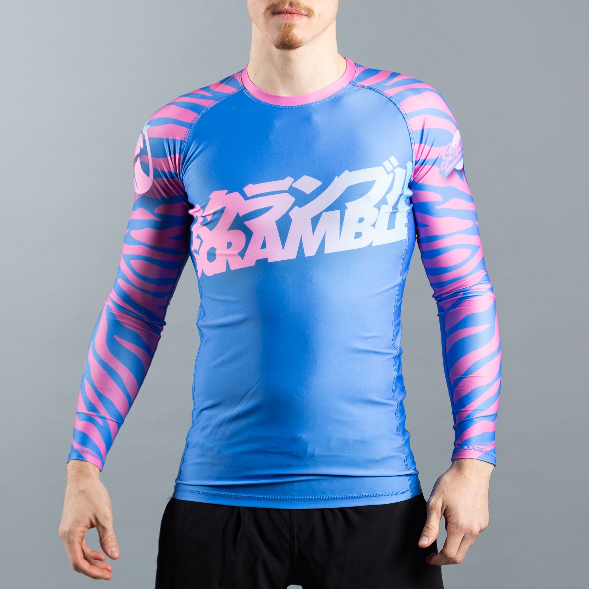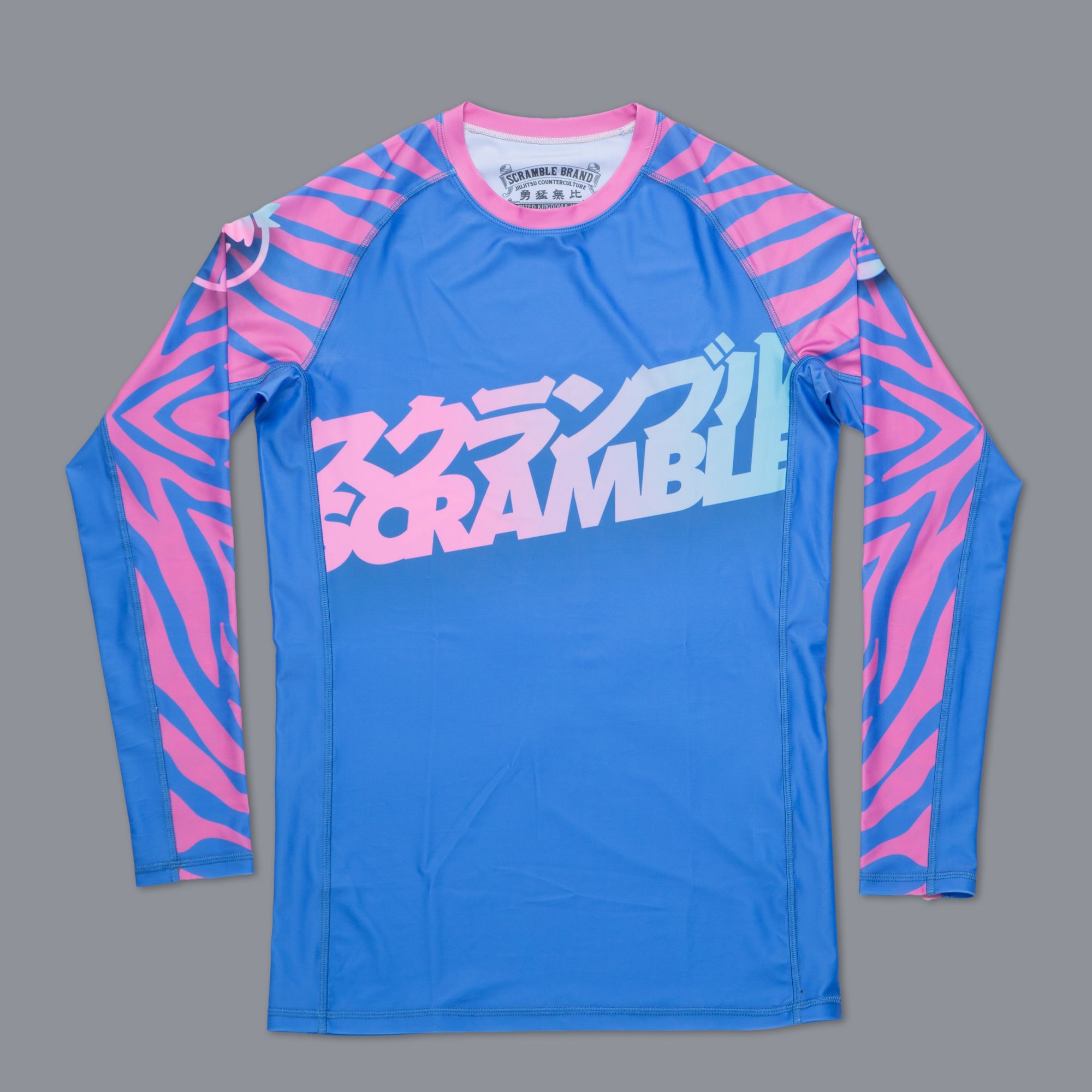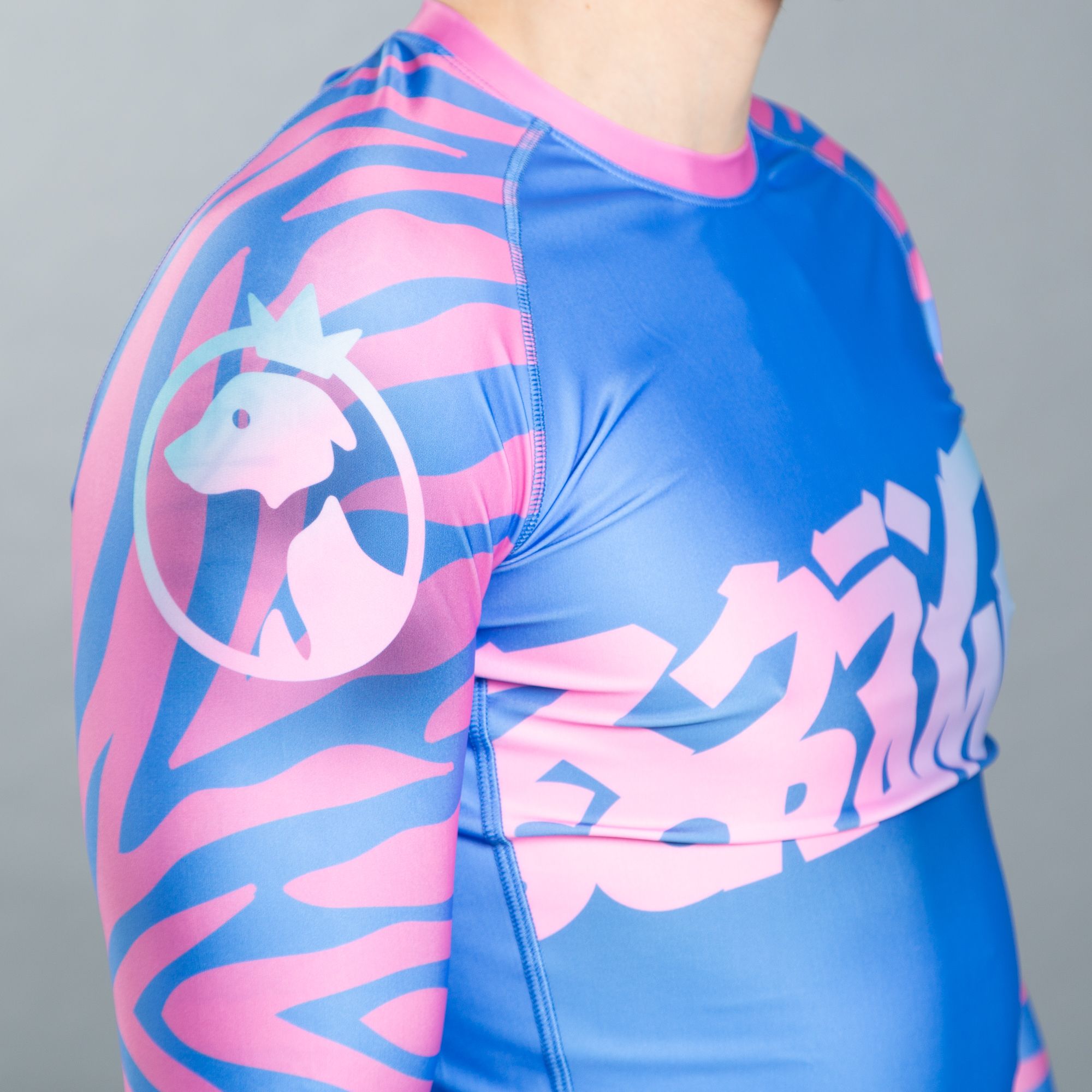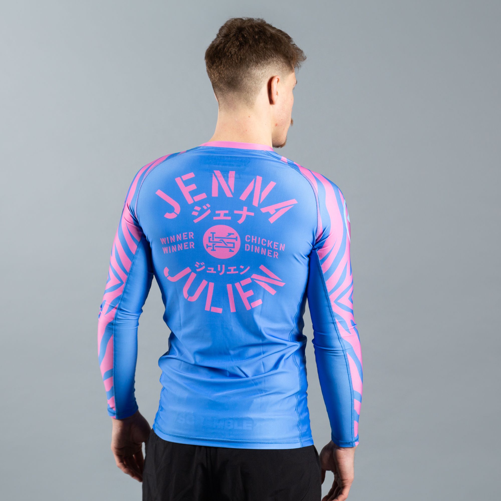 This is a rashguard developed in collaboration with Julien Solomita and Jenna Marbles, and based off the crazy and colourful pattern developed for their custom Battlegrounds weapon skins. Our jiujitsu fans will be like “Yep, cool, I know all about rashguards.” But Jennajulien fans might be like “What the crap is a rashguard?” Well it’s a tight fitting polyester training top that you can use for pretty much any activity including gym, yoga, walking, watching YouTube, eating cucumbers and pointing at interesting stuff. It’s like a party, that you wear.