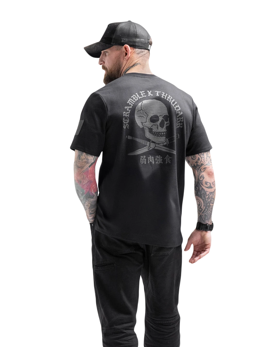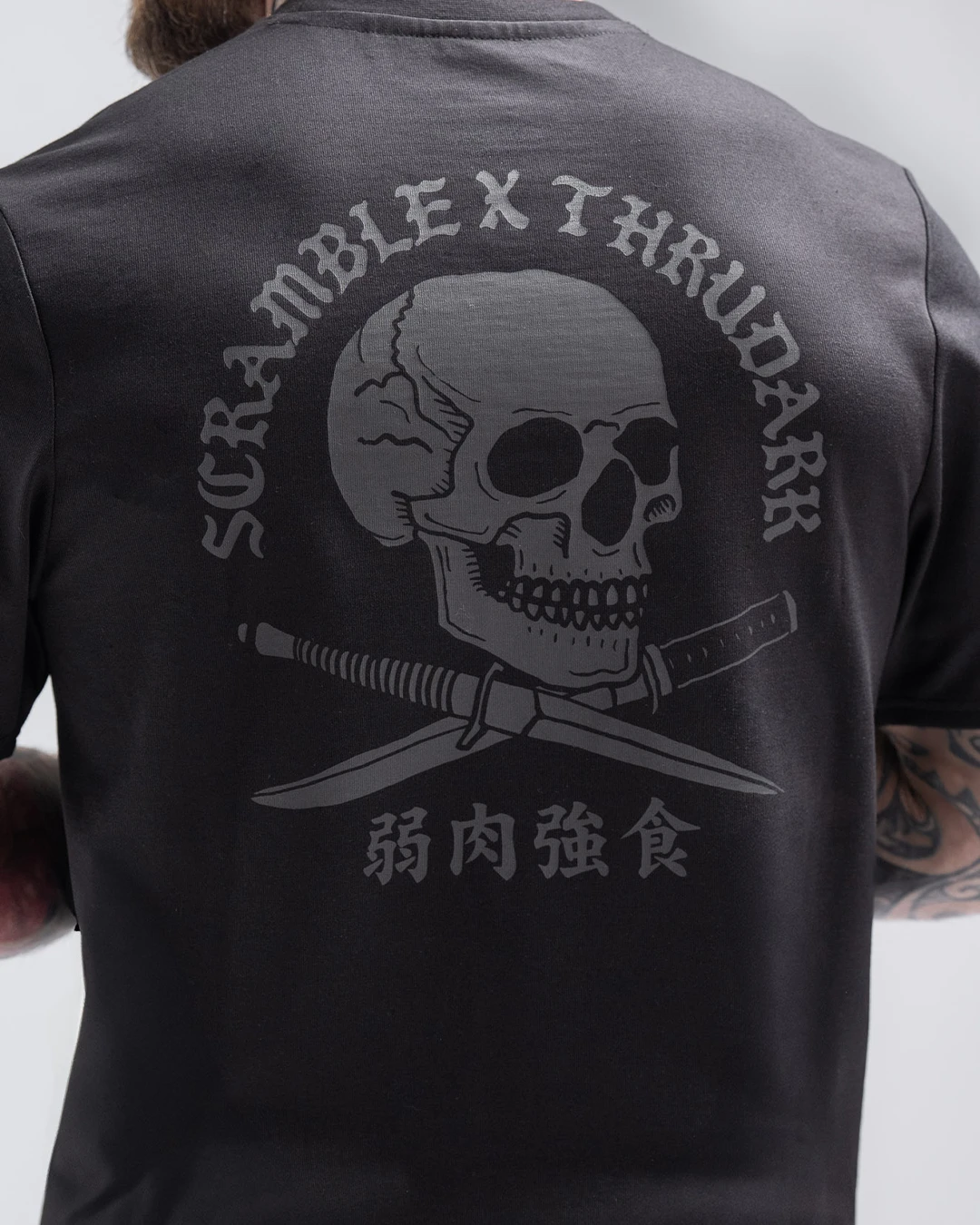 This t-shirt is premium in every facet – build, material, weight, and finishing. Based on ThruDark’s leading ‘Insignia’ tee. Features ThuDark logo on chest, Scramble logo on shoulder, and the Scramble x ThruDark skull motif across the back, all screen printed in subtle smoky grey.