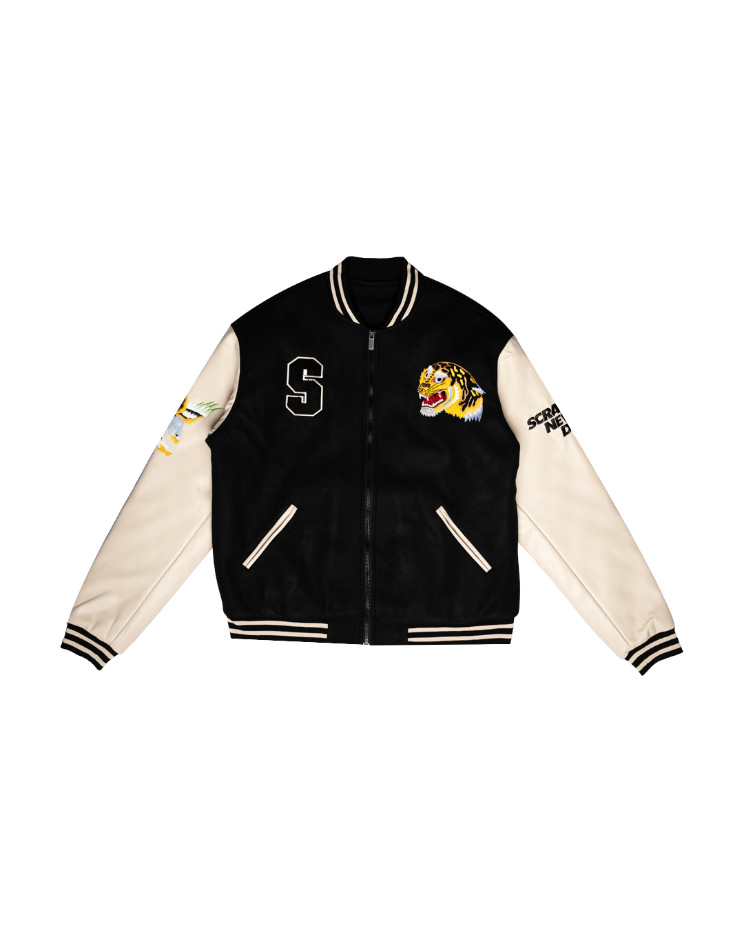 This is the crowning jewel in our Winter 2025 collection, a full-spec Sukajan jacket. The body is felt and the arms are premium synthetic leather with a padded, quilted inner. The jacket features bold offset with creamy off-white details, a number of high quality embroideries and chenille patches, and a relaxed, oversized fit so that you can fit your winter hoody underneath.