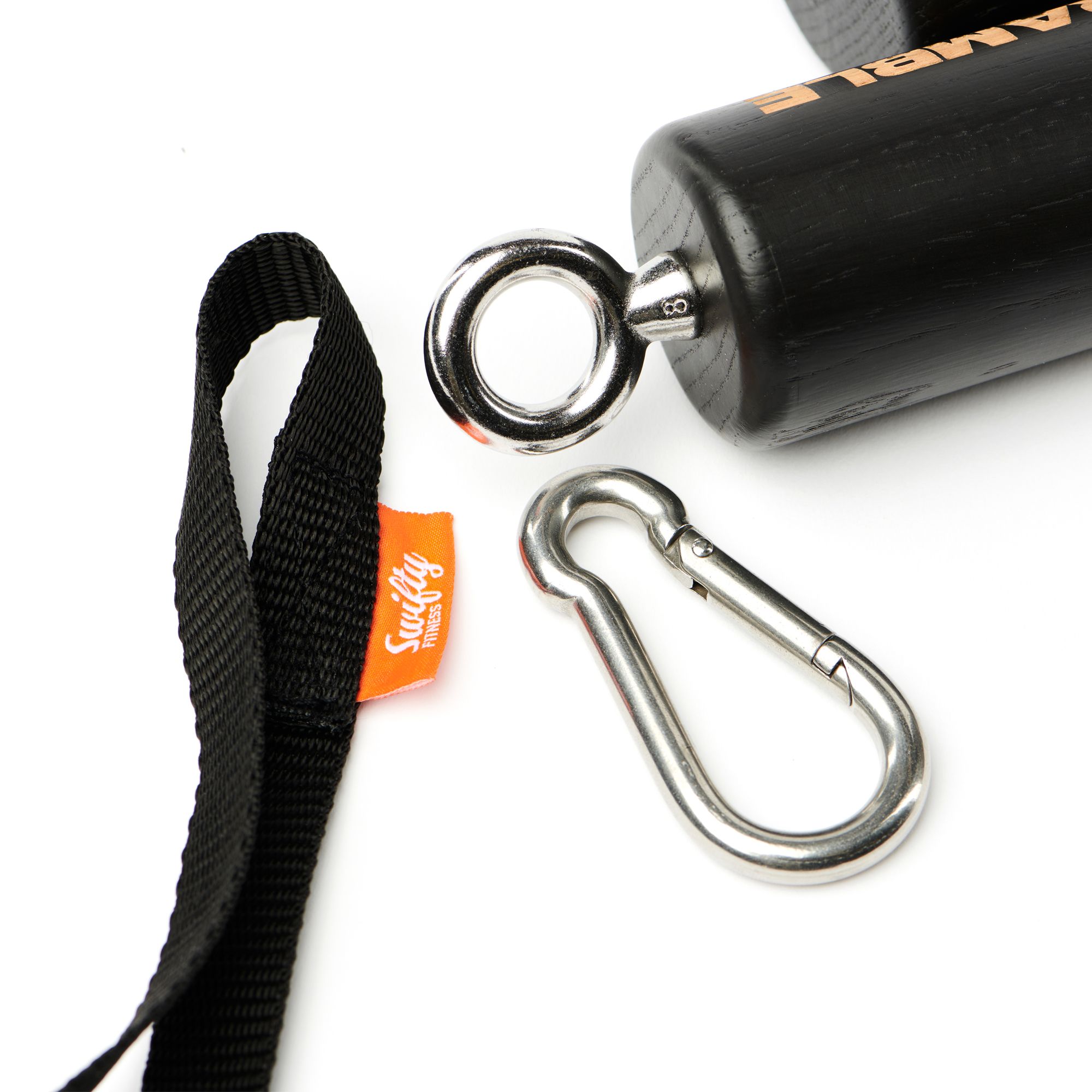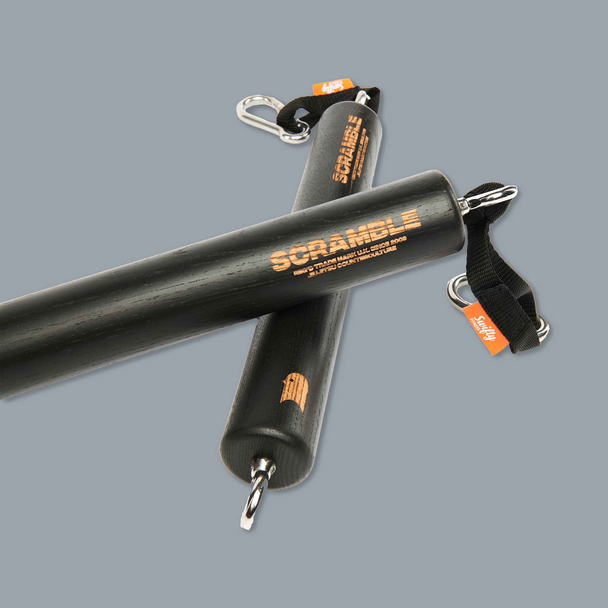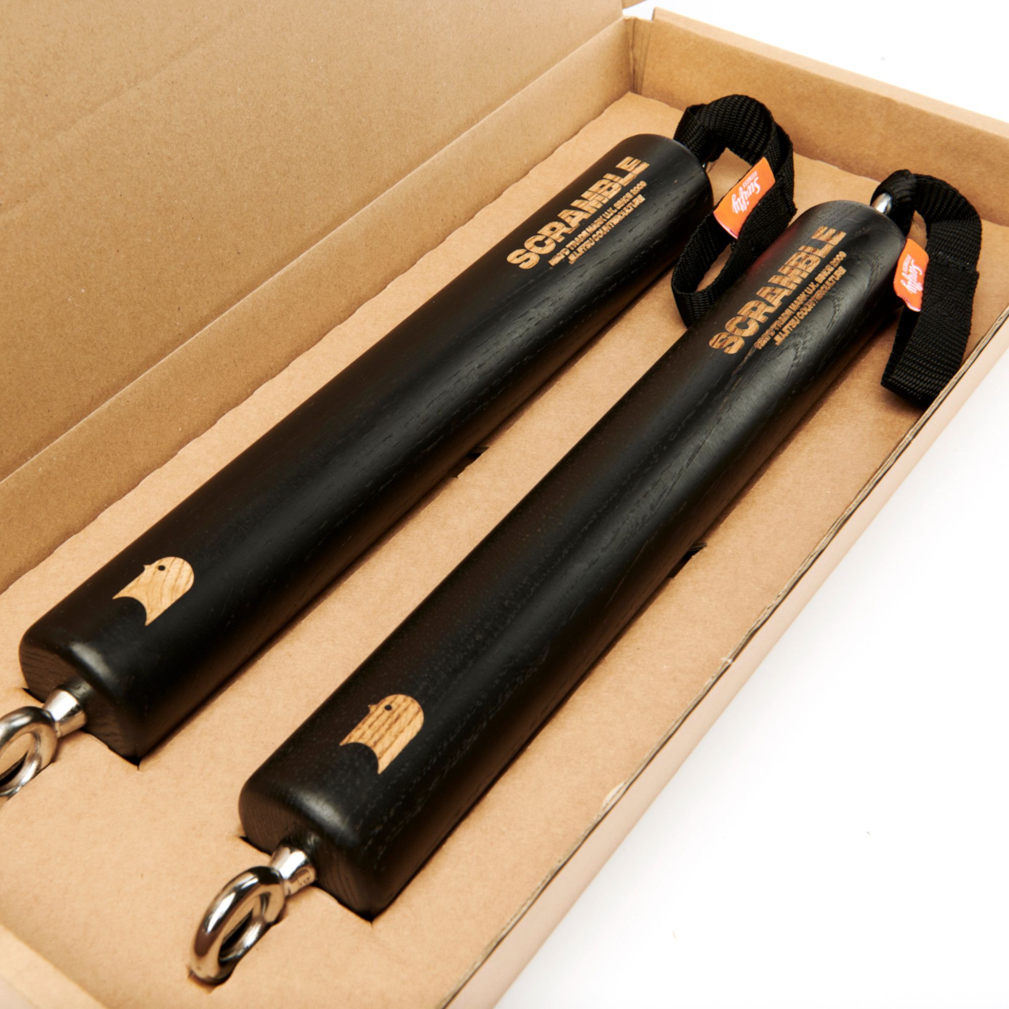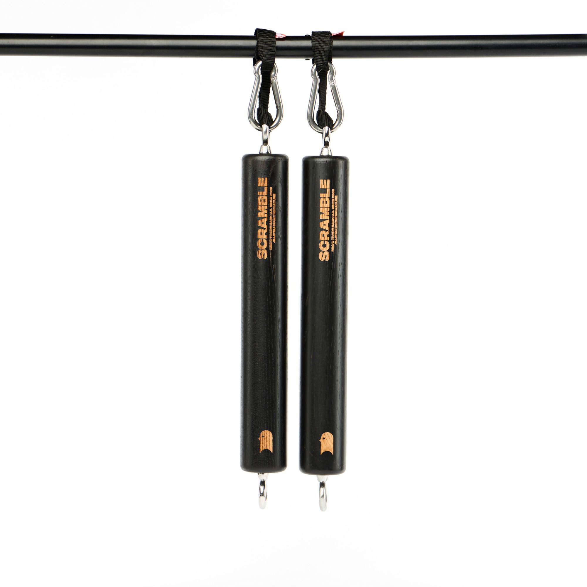 Made in the UK from solid oak, they are 340mm tall and 50mm in diameter, with heavy duty webbing and a karabiner so they can be attached to your training set up in a variety of ways. Great for pull ups and even lifting weights, adding an extra dimension to your training. The wide grips and movement put increased strain through your hands, wrists and forearms, making sure you get the maximum from your workout.