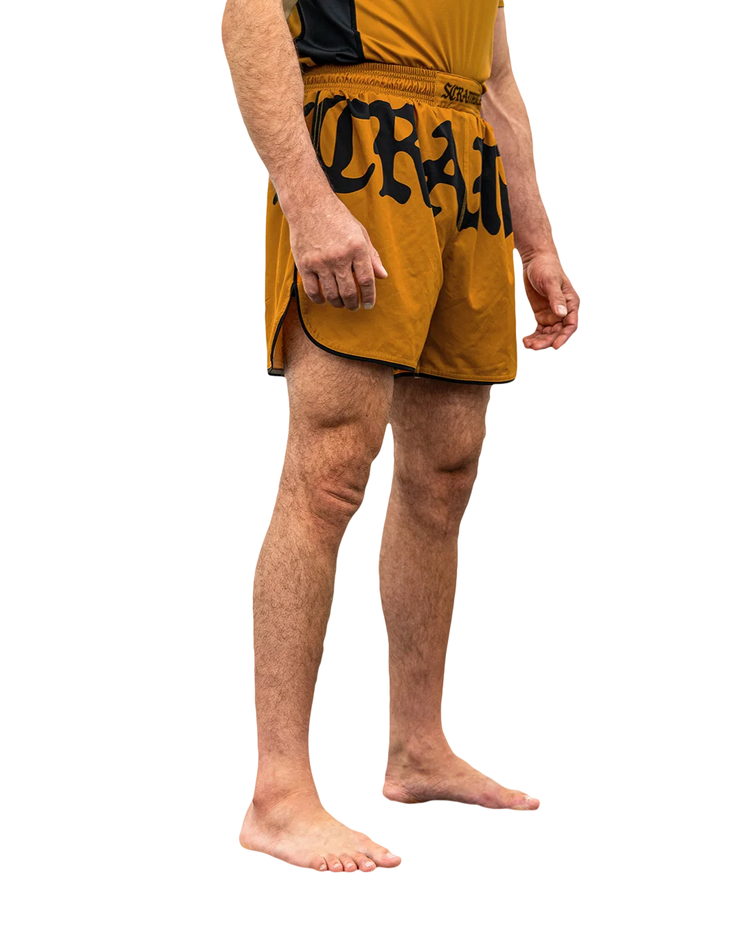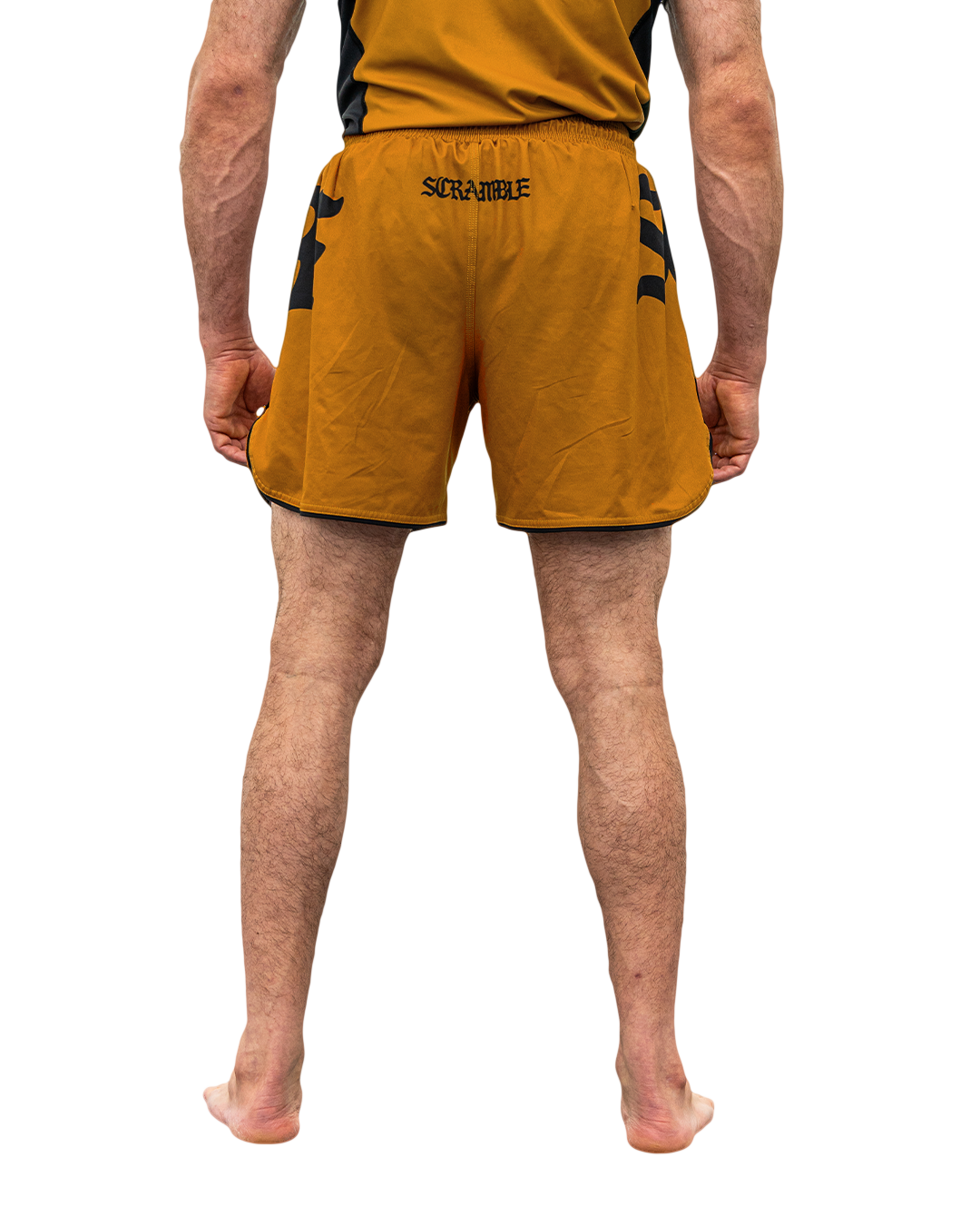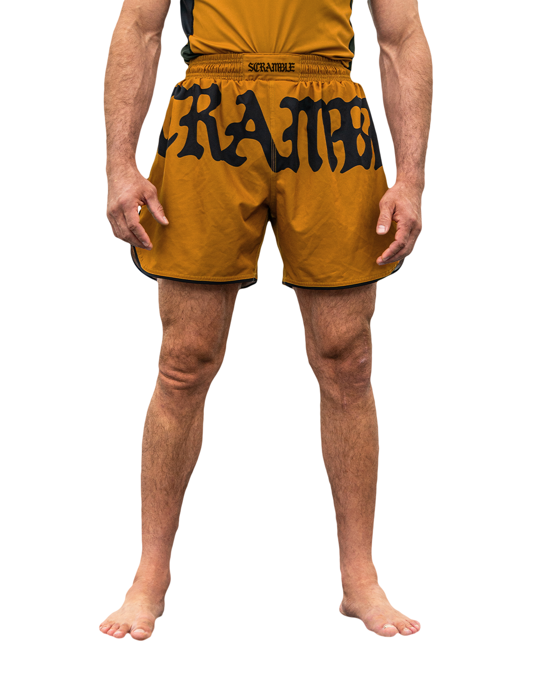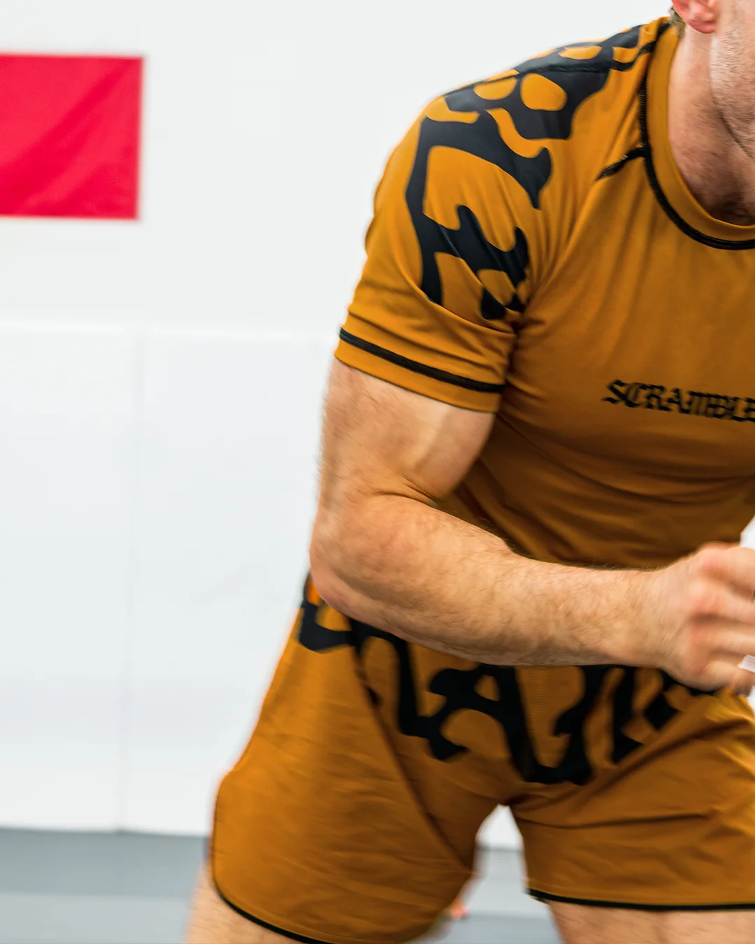 Scramble athlete Ethan Crelinsten (formerly of Craig Jones’ B-Team, now of Simple Man Martial Arts) loved the original black and white Glyph nogi rashguard so much, he asked us to put together a whole set in colours he chose. So, we have the Glyph set – which now includes shorts – in both Olive Green and Burnt Orange colourways. The Glyph set applies a simple gothic graphical theme and Scramble type treatment, which spans multiple panels across the garment, with a complimentary, smaller logo on the reverse side. Limited quantities, no restocks.