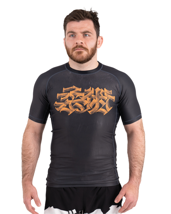 Featuring custom, hand-drawn calligraffiti artwork from Chinese artist ▪️IRON 鐵▪️ this short sleeved rashguard is designed with jiujitsu in mind. The background is a subtle off-black texture to allow the Chinese characters for “jiujitsu” to really pop.