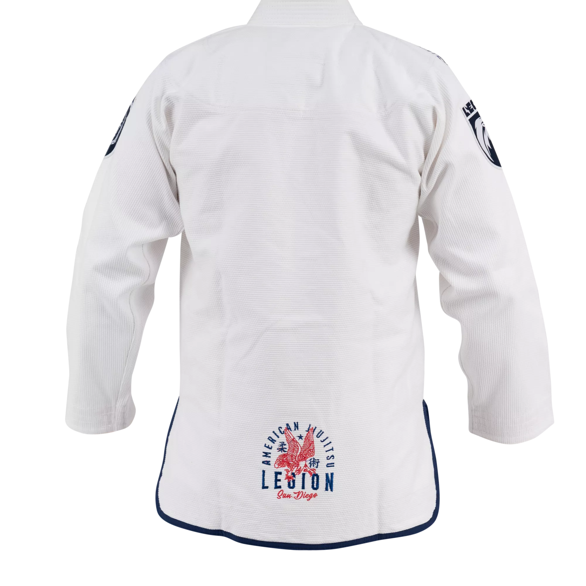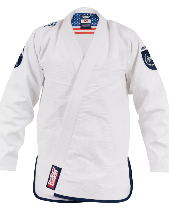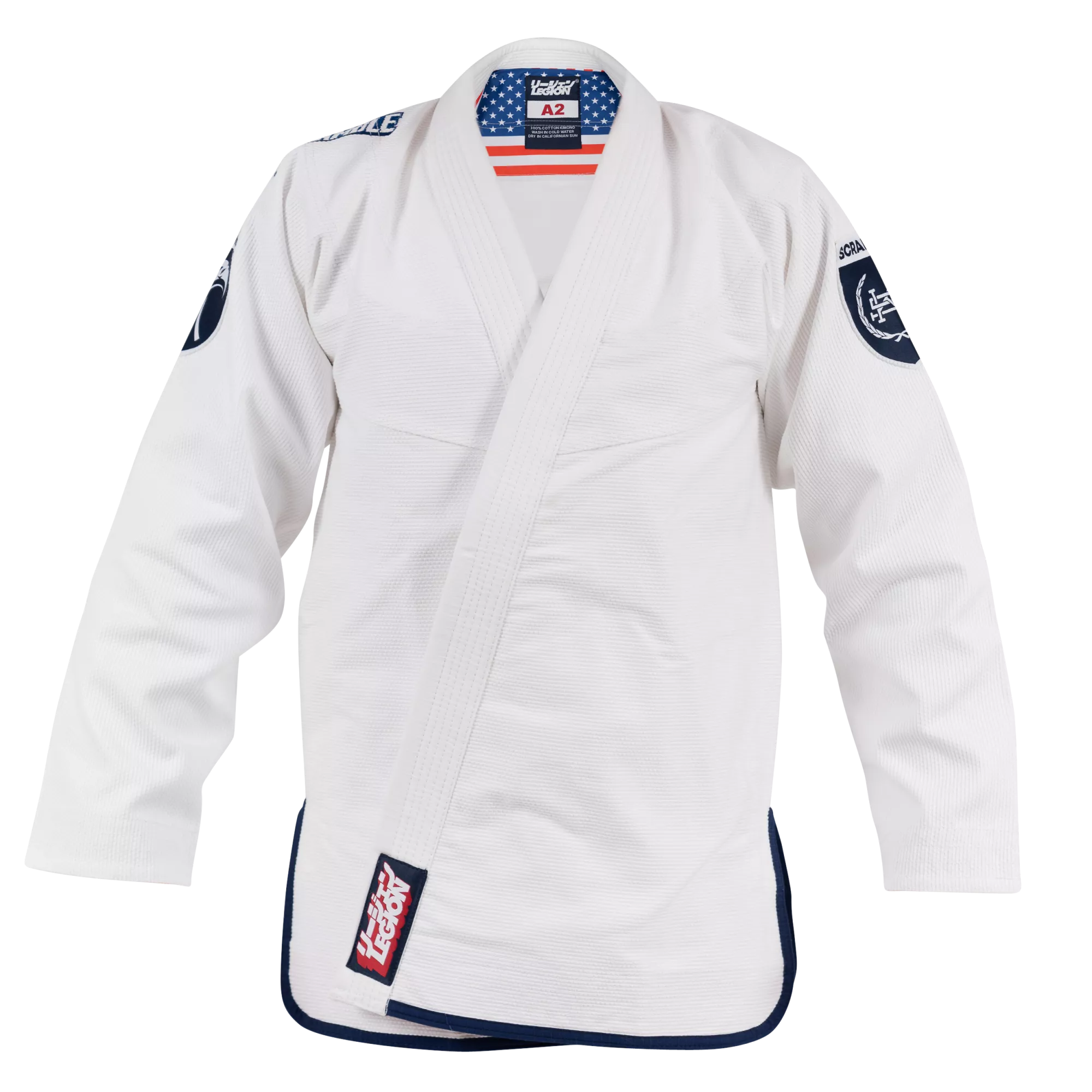 This is a midweight BJJ Gi with pearl weave top and ripstop pants and features loads of Americana style details and colouring, as well as complimentary Scramble and Legion logos.