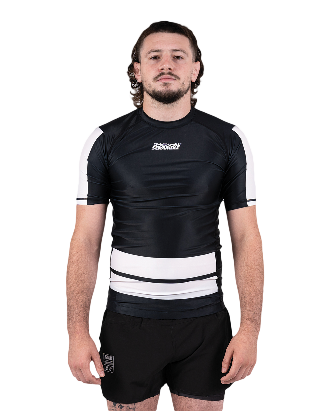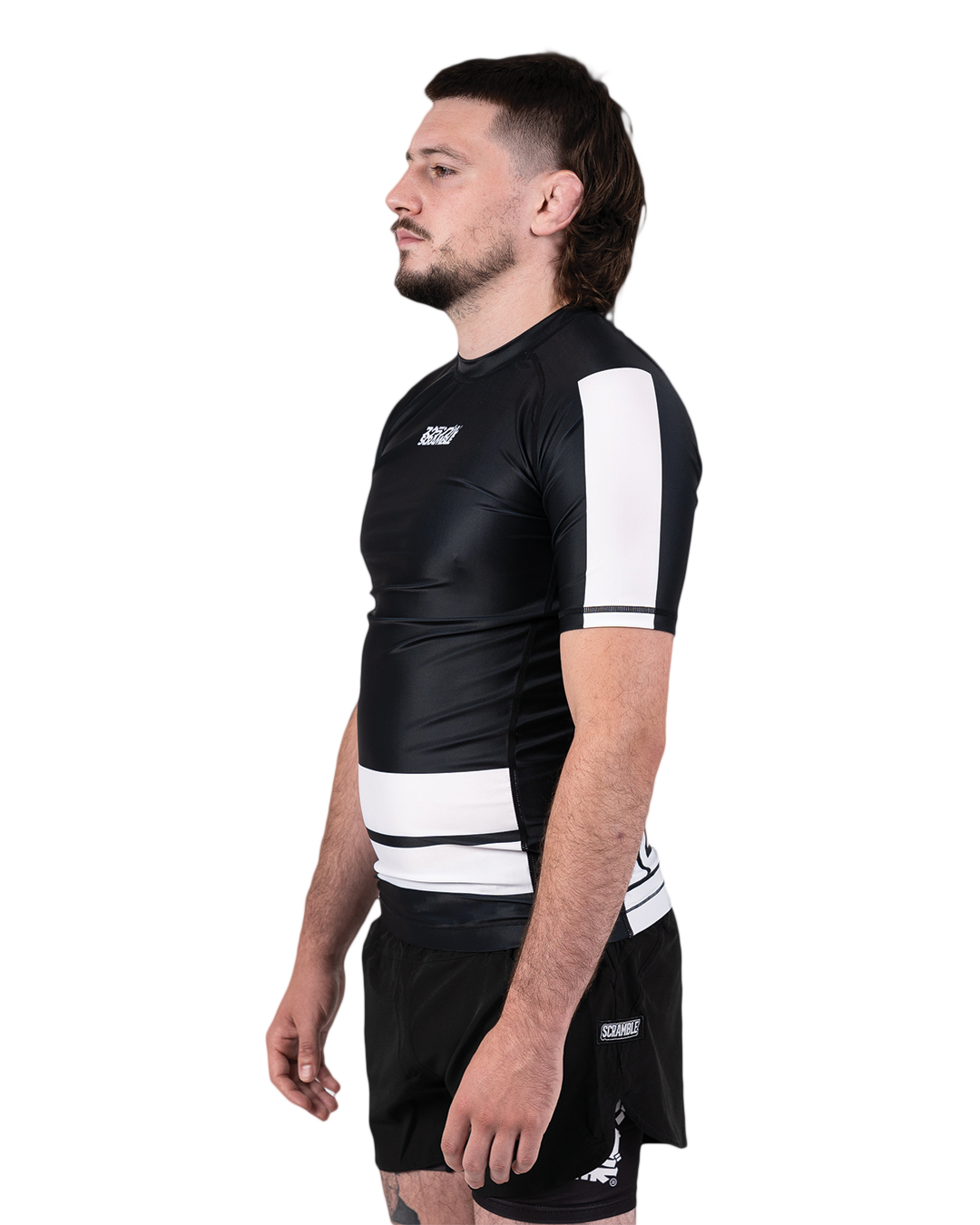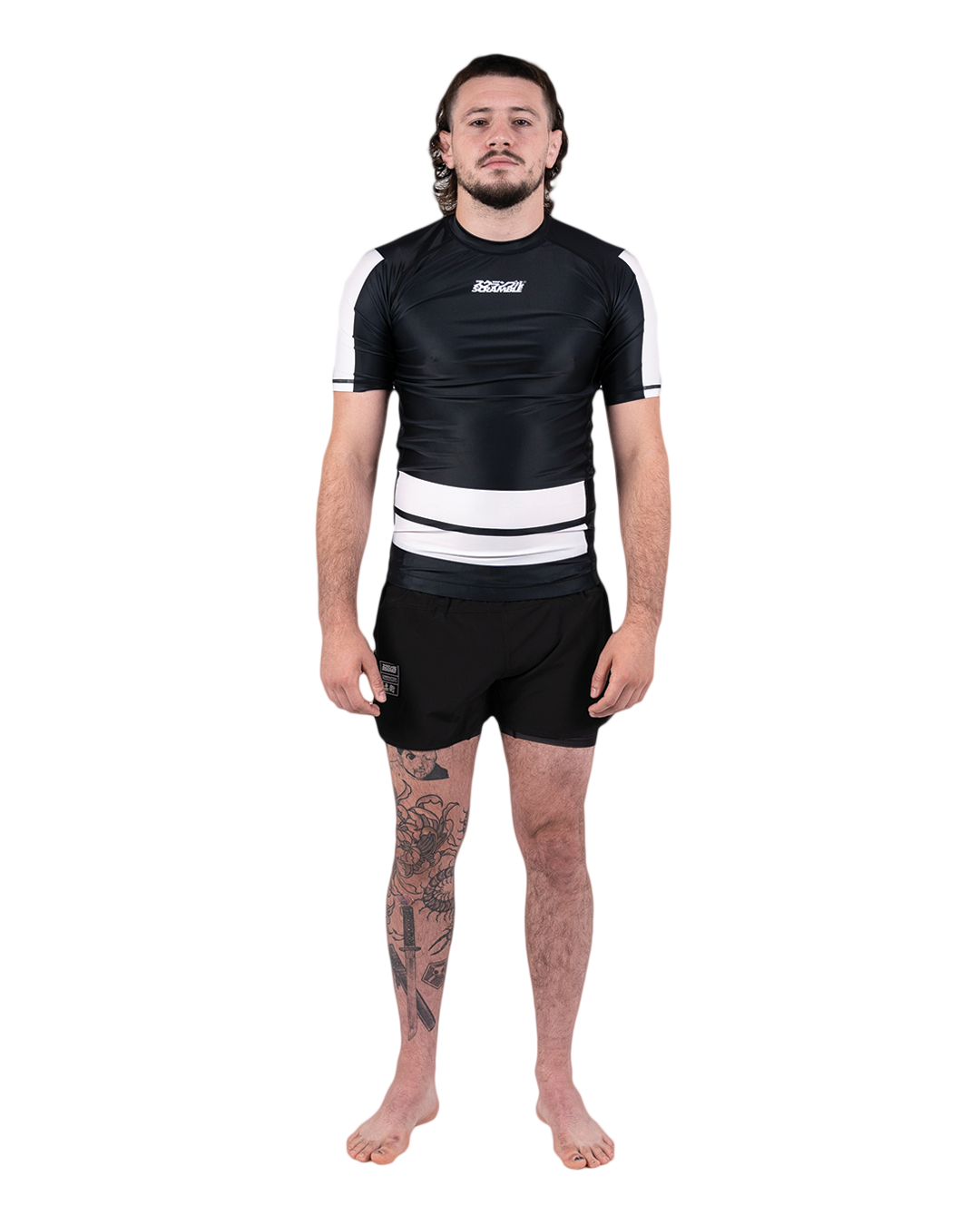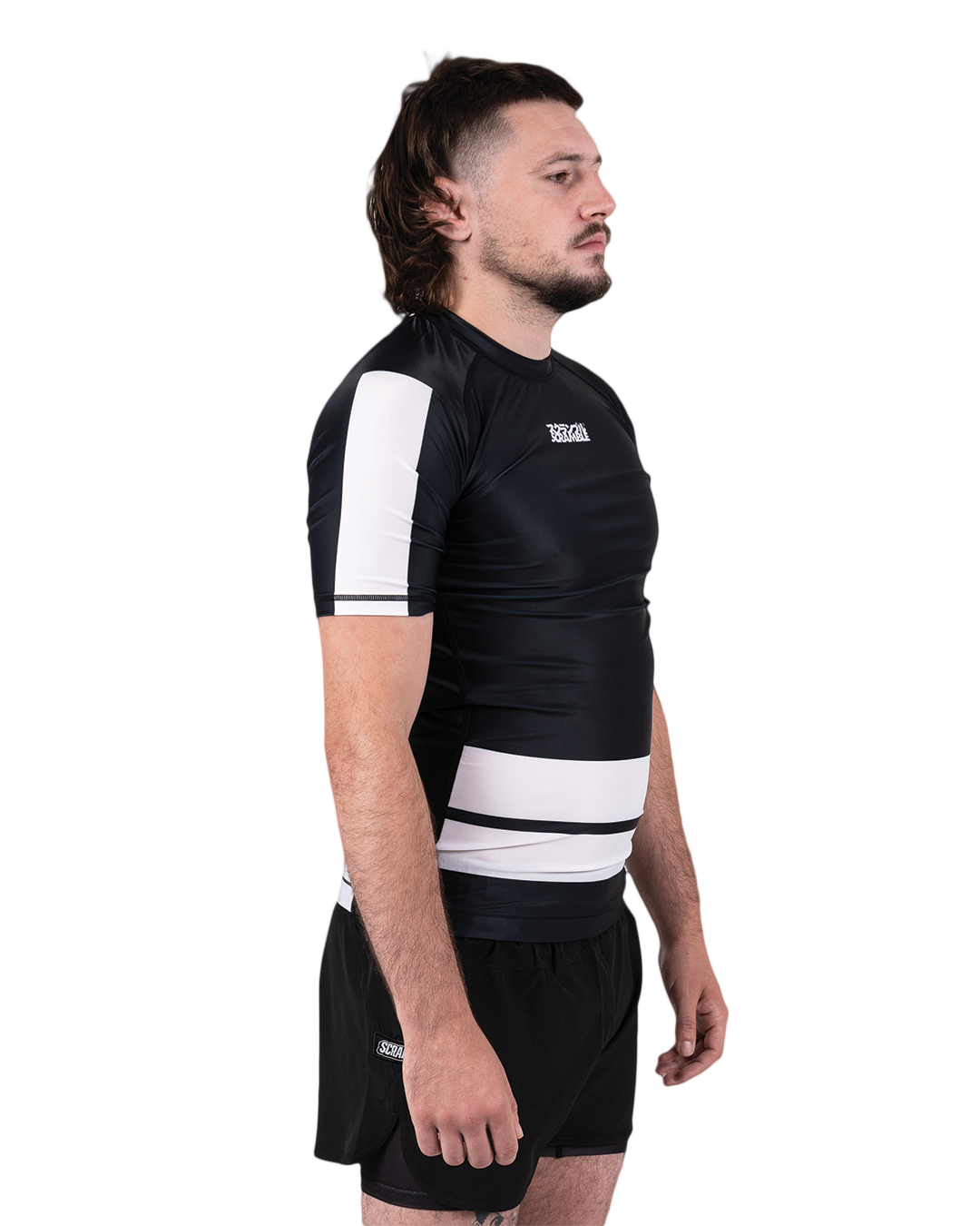 Our ranked rashguards follow all IBJJF guidelines for rank colour rashguards, featuring accents in the belt rank that make up the required percentage to compete in IBJJF competition, or simply to train and compete in no gi jiujitsu with attire based on your rank. The rashguards are made with a superior polyester blend that reduces pilling, as well as high quality stitching and panels that move with your body.