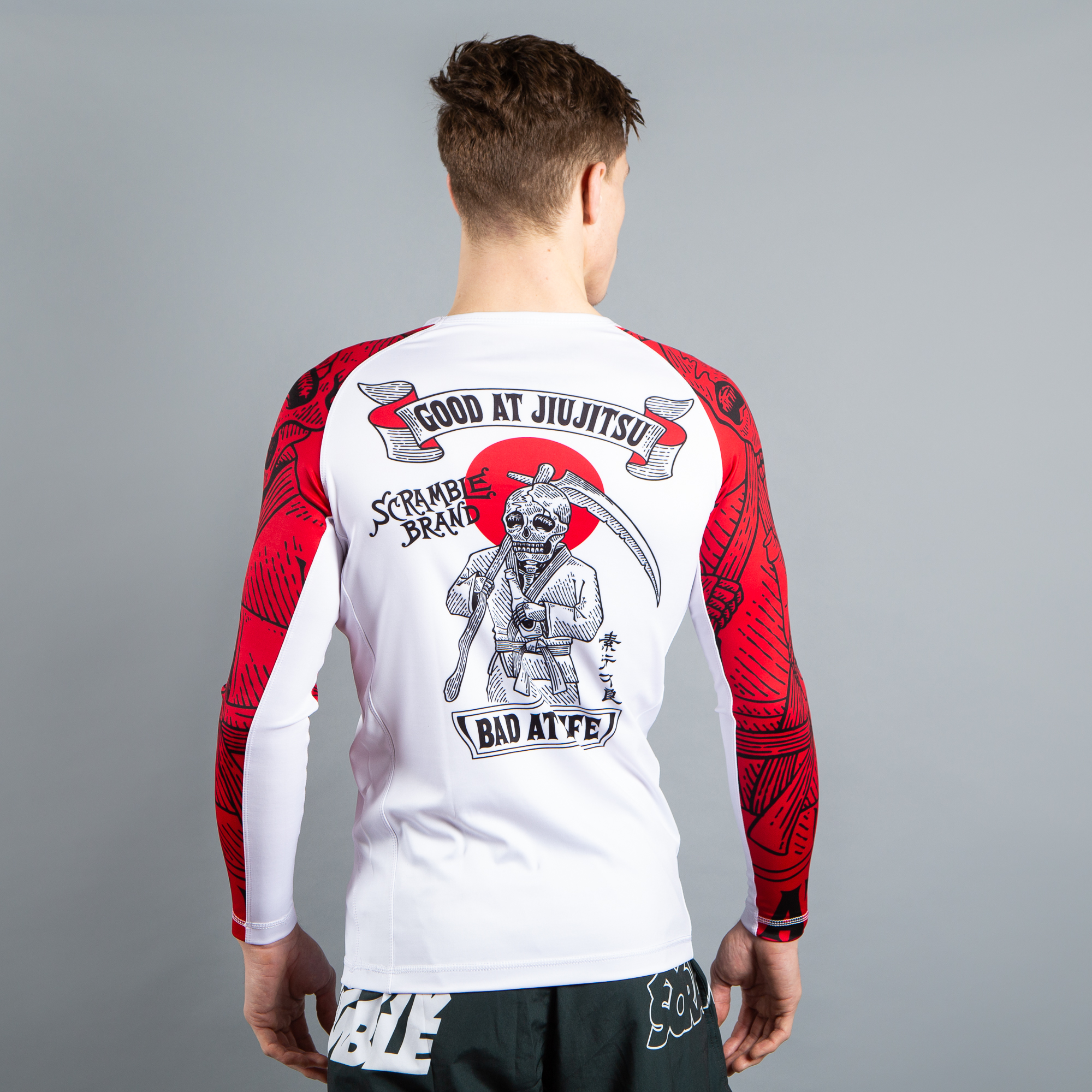 We’ve taken the awesome Good at Jiujitsu, Bad at Life theme and artwork from our best-selling casual range and applied it to this grappling rashguard.