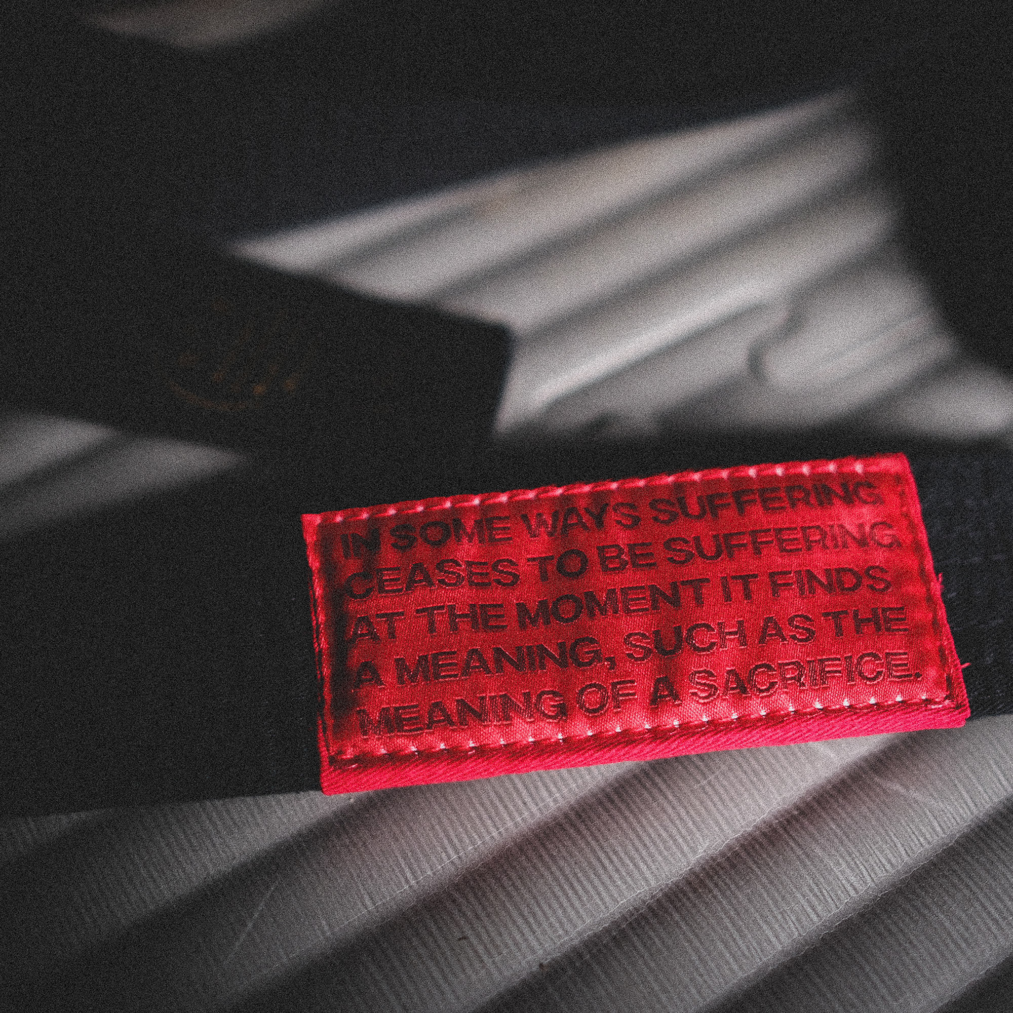 The red bar is embroidered with a quotation from Viktor Frankl, who was an Austrian neurologist, philosopher, author, and Holocaust survivor. He went on to become a psychiatrist, helping people from all walks of life gain a deeper understanding into their own motivations and thought processes and using his tragic experience to help improve their lives. â €