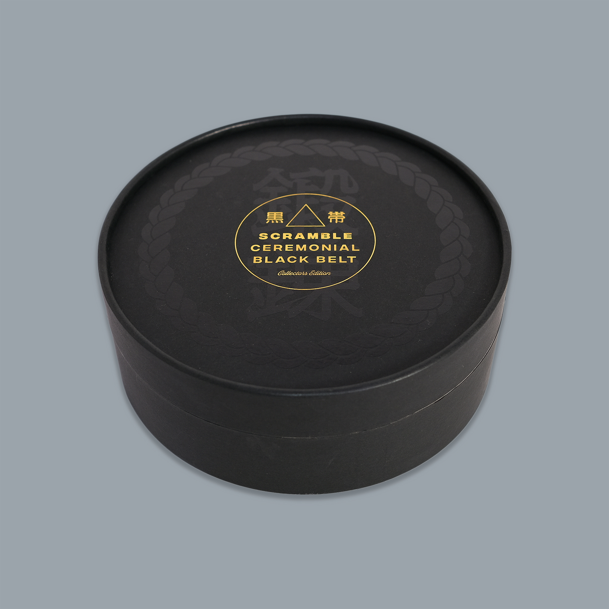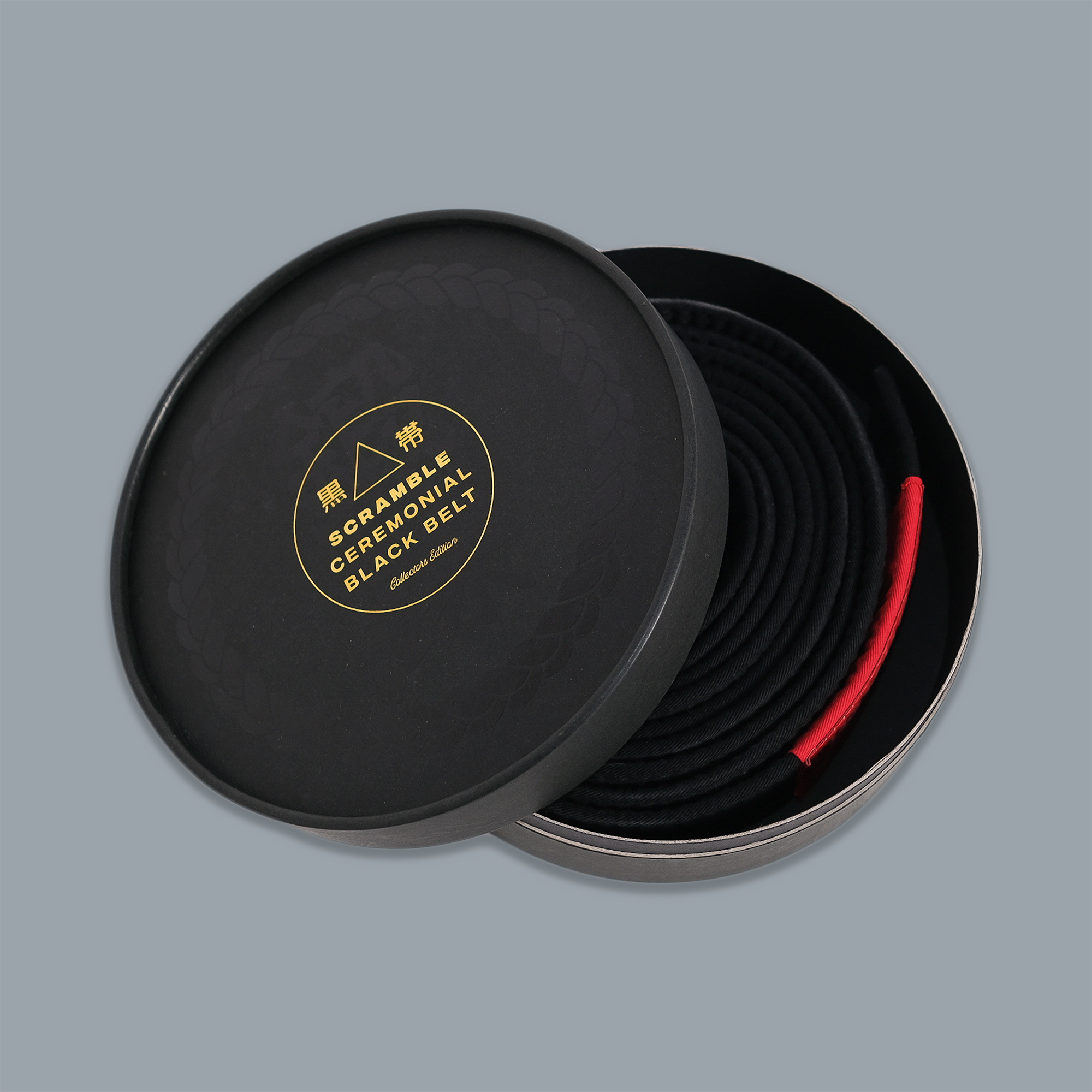 Limited edition ceremonial black belt presented in a unique circular presentation box. â €