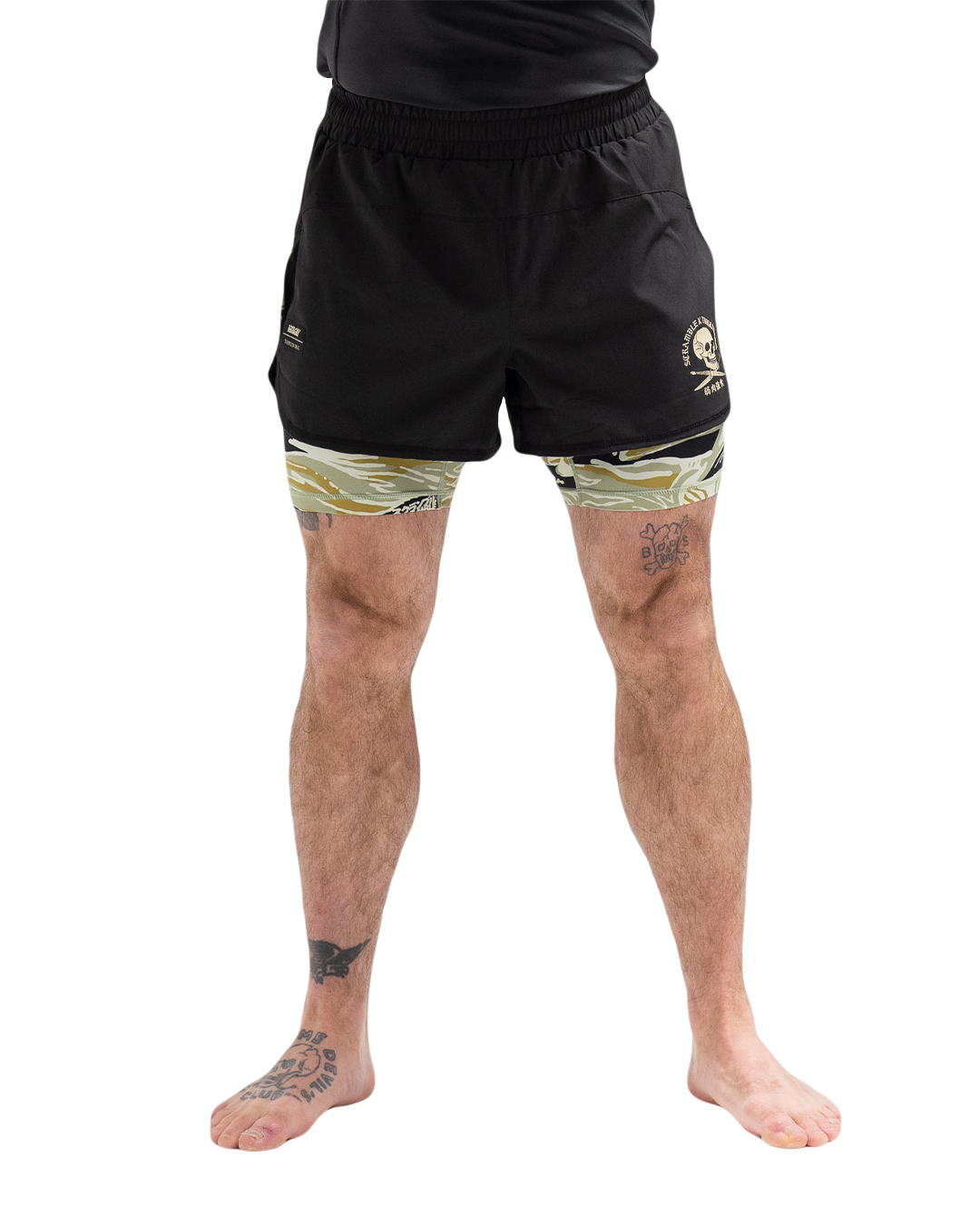 Based on our best-selling Combination Shorts, with subtle improvements, this dual-layer training short is perfect for BJJ, nogi and MMA, or any kind of physical activity or workout. The underlayer is sublimate printed with the custom Scramble x ThruDark tiger camo pattern, which will never peel, crack or fade, and provides a comfortable compression layer beneath the shorts, which are flexible and dip-dyed in black.
