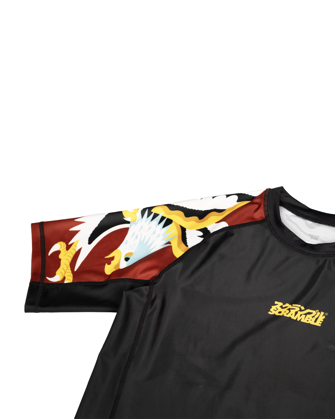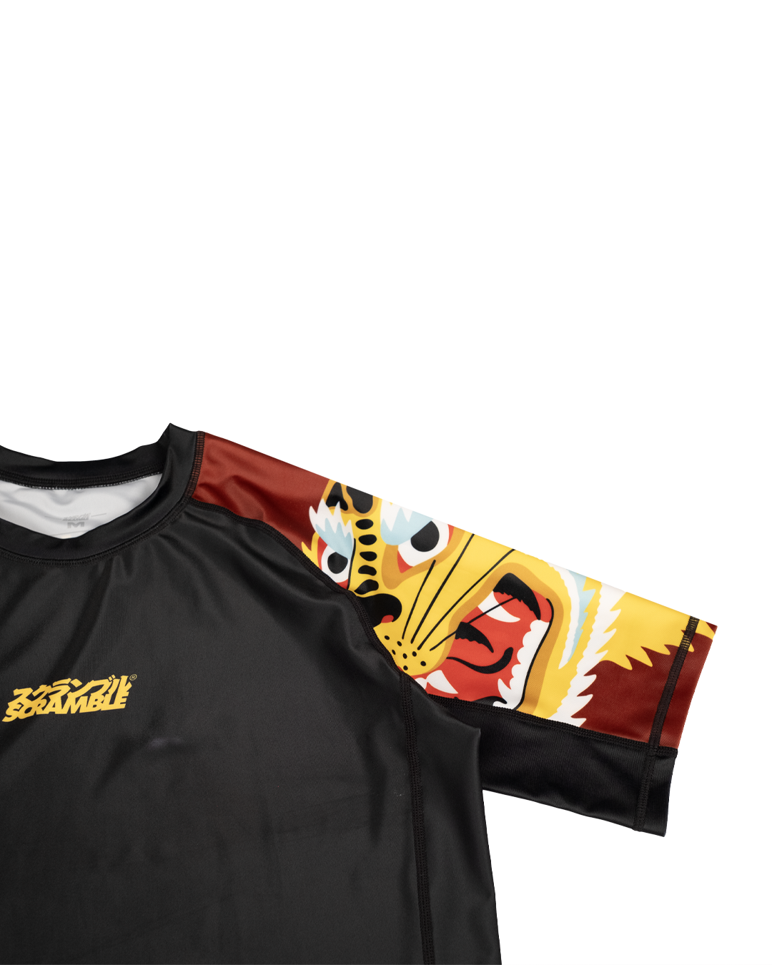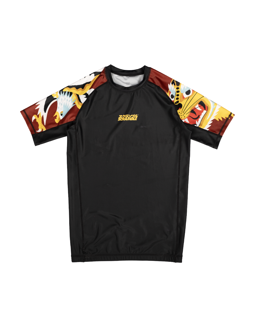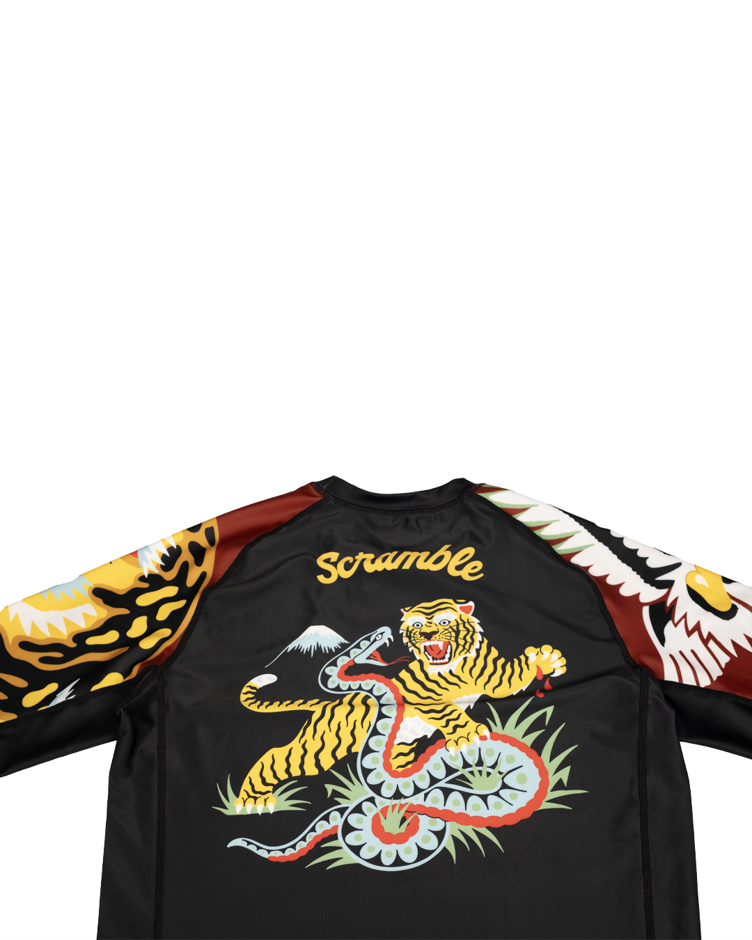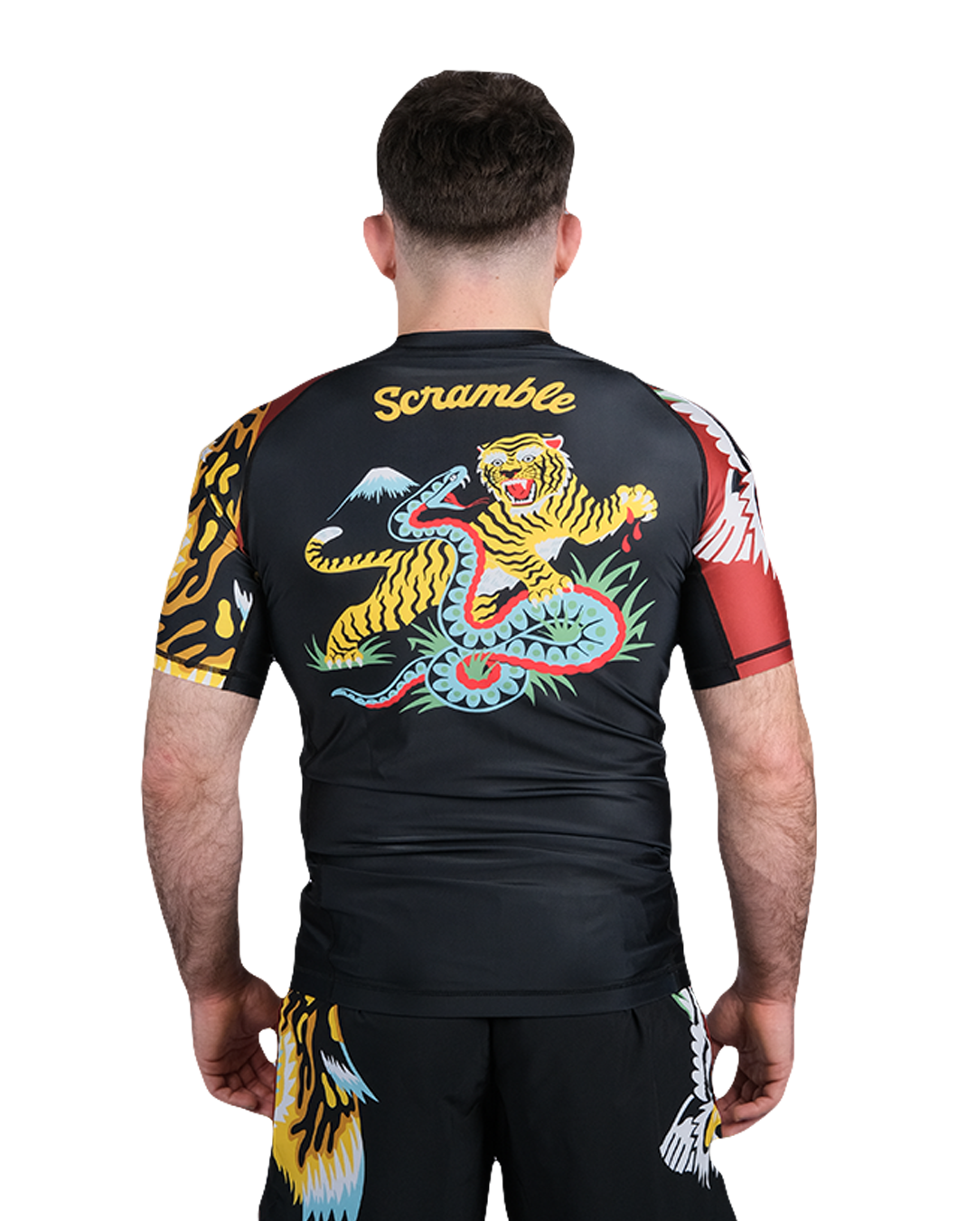 This bright, bold and colourful nogi grappling set features artwork from the talented Kieran Hoohar, a tattoo artist and jiujitsu enthusiast in London. The artwork is made up of firm favourites from tattoo illustrations in tiger and snake, jaguar, and eagle images, all done in Kieran’s signature style. The rashguards come in both long sleeved and short sleeved versions (long sleeved is a timed exclusive for the USA) and we also have grappling shorts and long spats (the grappling spats are a timed exclusive for the USA.)