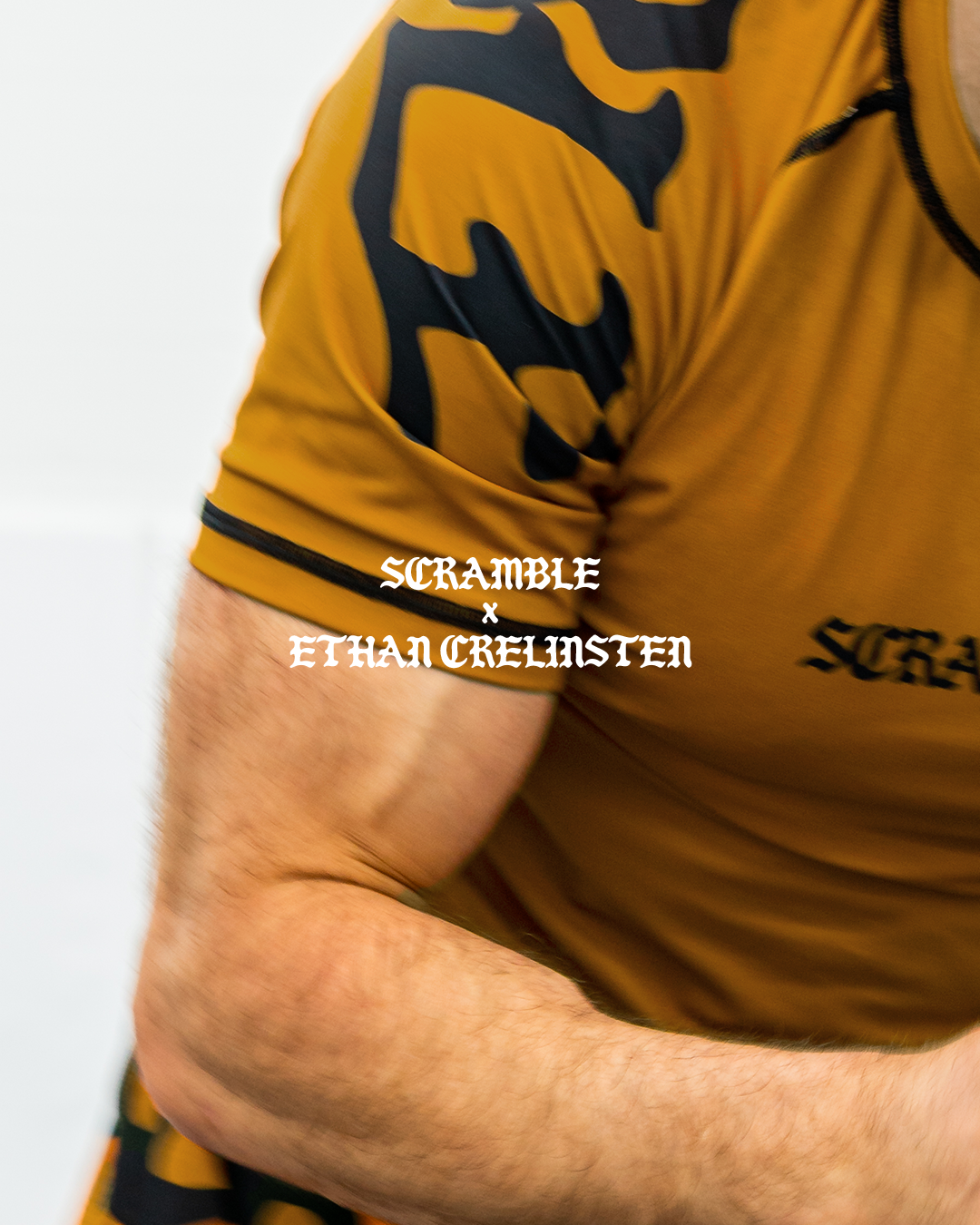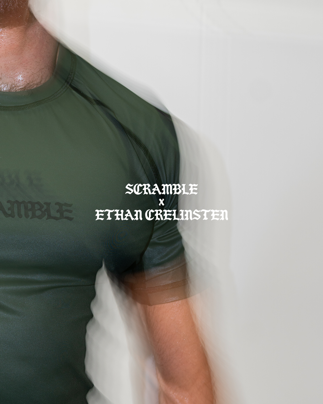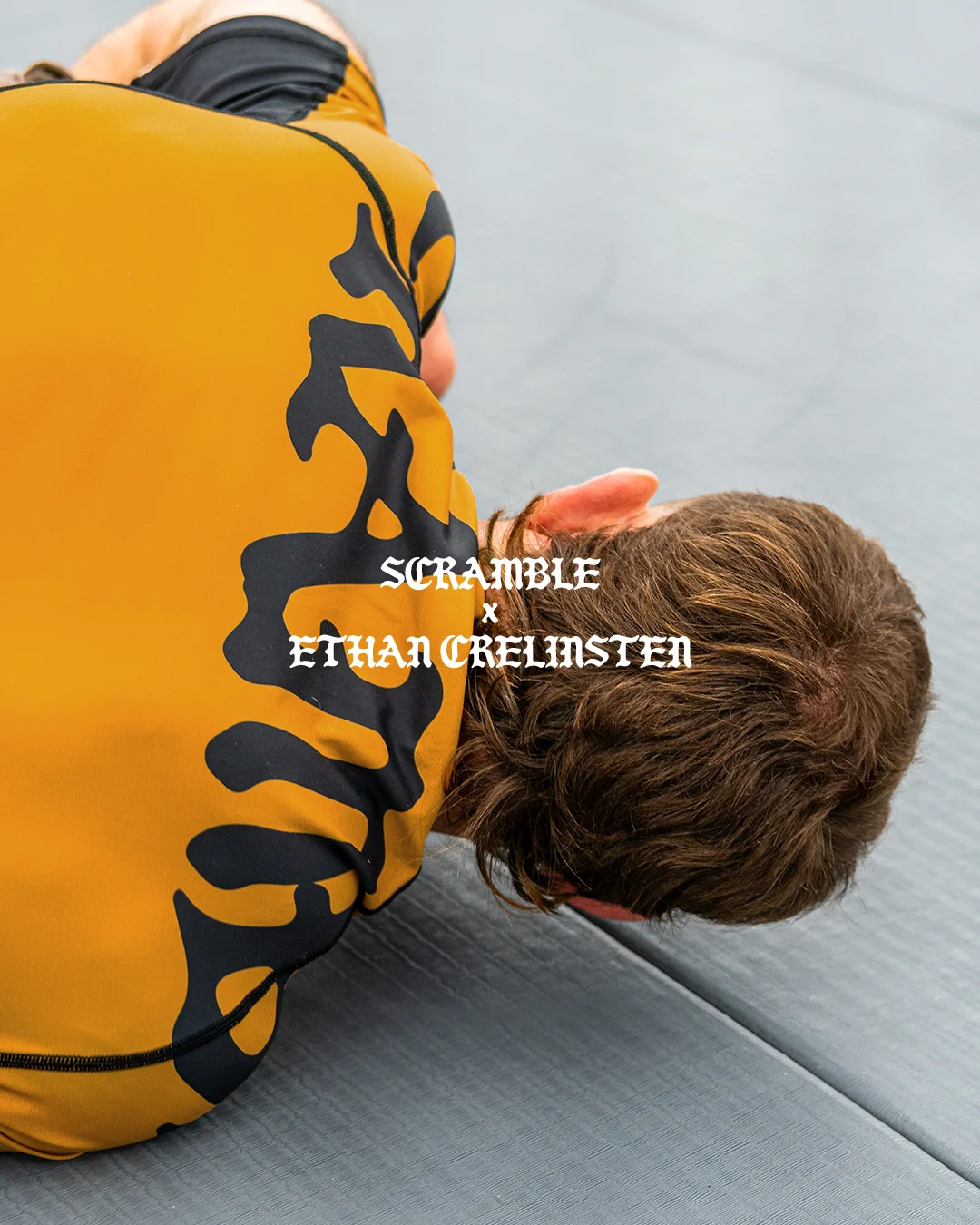 Scramble athlete Ethan Crelinsten (formerly of Craig Jones’ B-Team, now of Simple Man Martial Arts – and before all that, a famed member of The Blue Basement, which John Danaher ran from Renzo Gracie NYC) loved the original black and white Glyph nogi rashguard so much, he asked us to put together a whole set in colours he chose. So, we have the Glyph set – which now includes shorts – in both Olive Green and Burnt Orange colourways. The Glyph set applies a simple gothic graphical theme and Scramble type treatment, which spans multiple panels across the garment, with a complimentary, smaller logo on the reverse side. Limited quantities, no restocks.